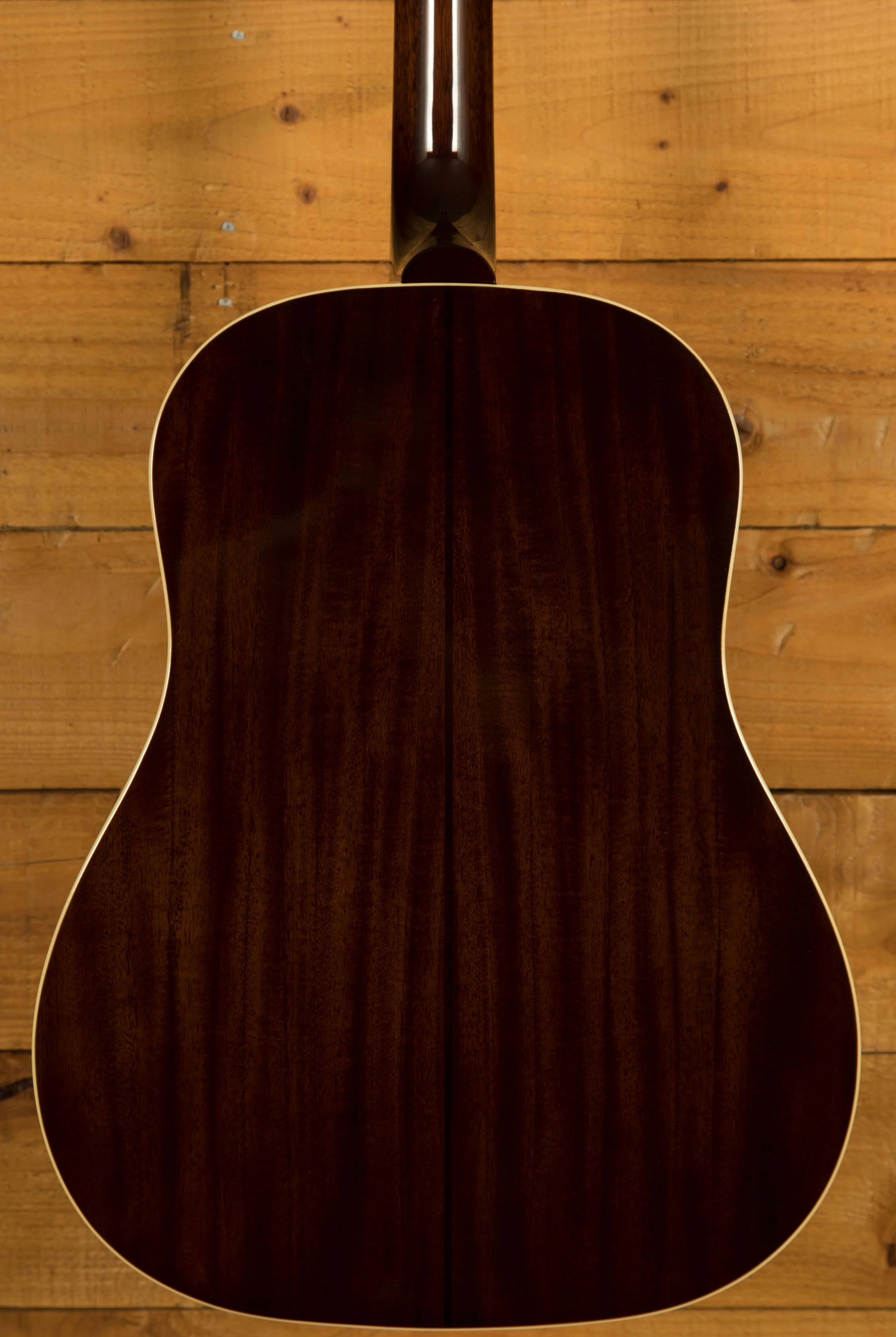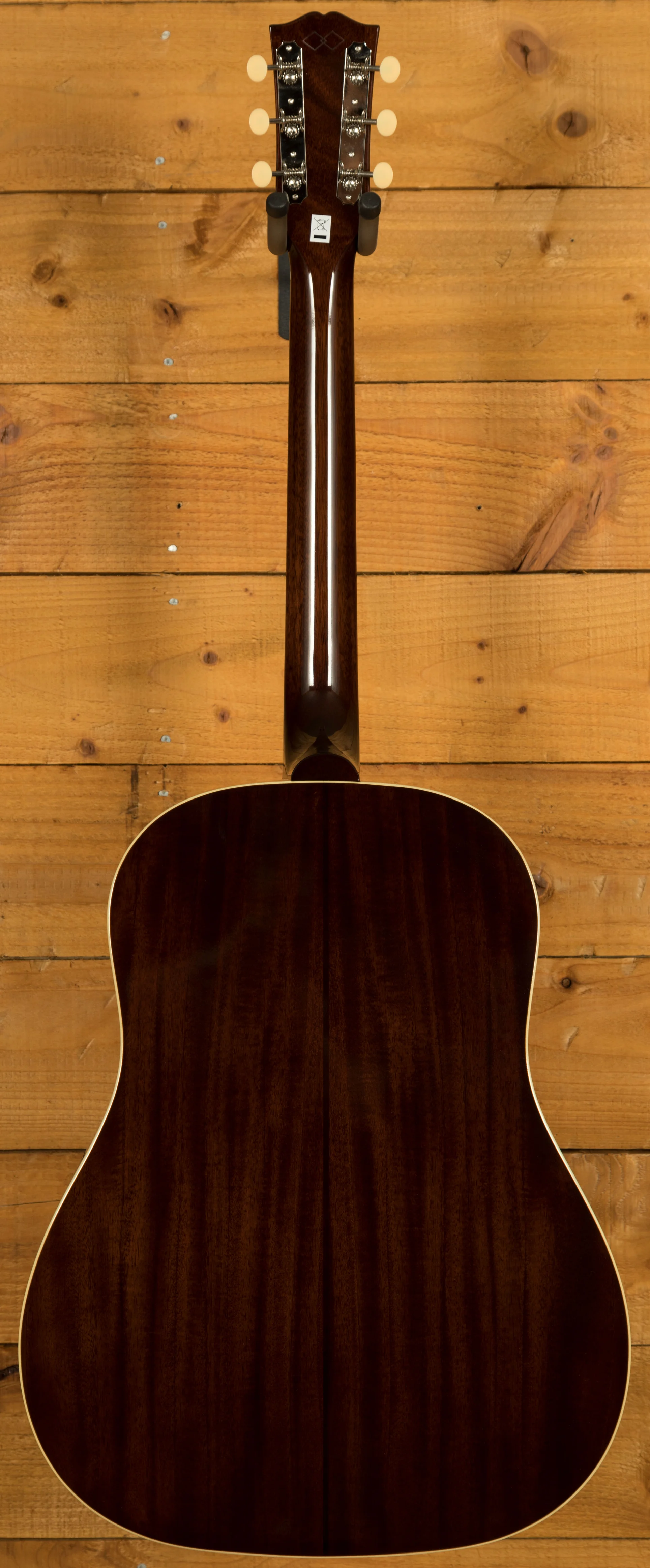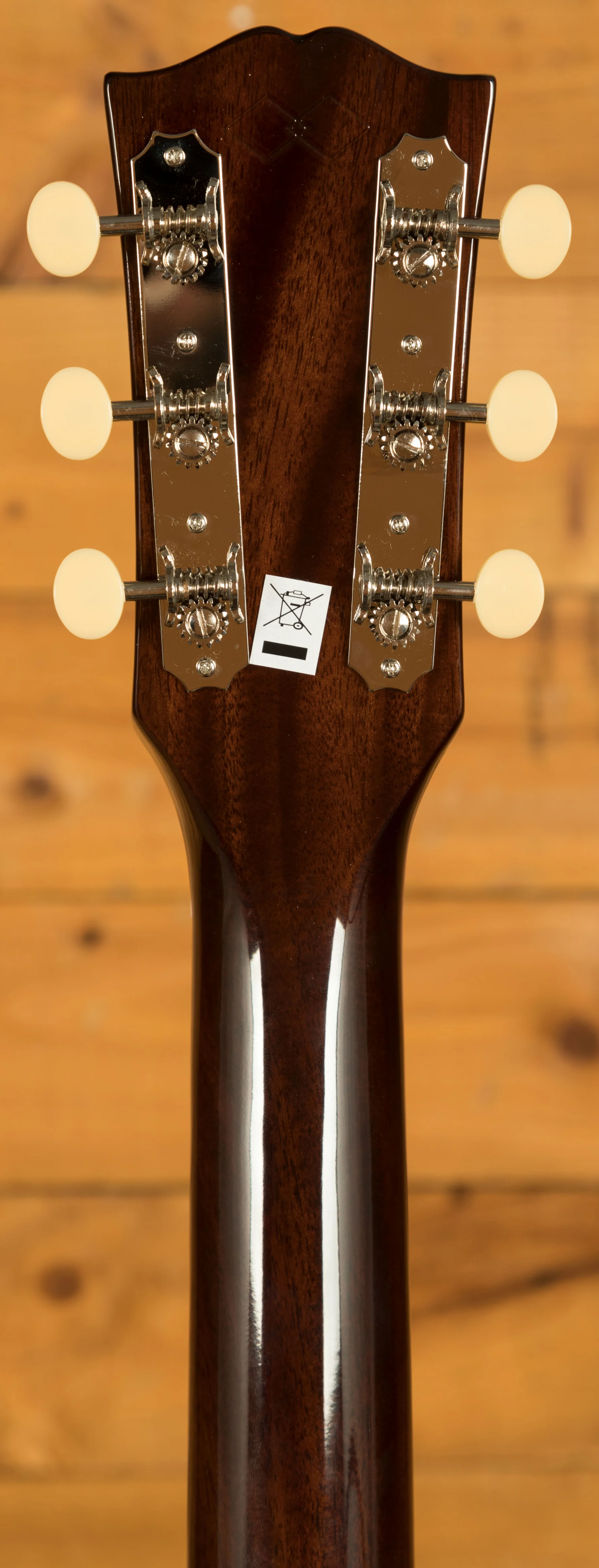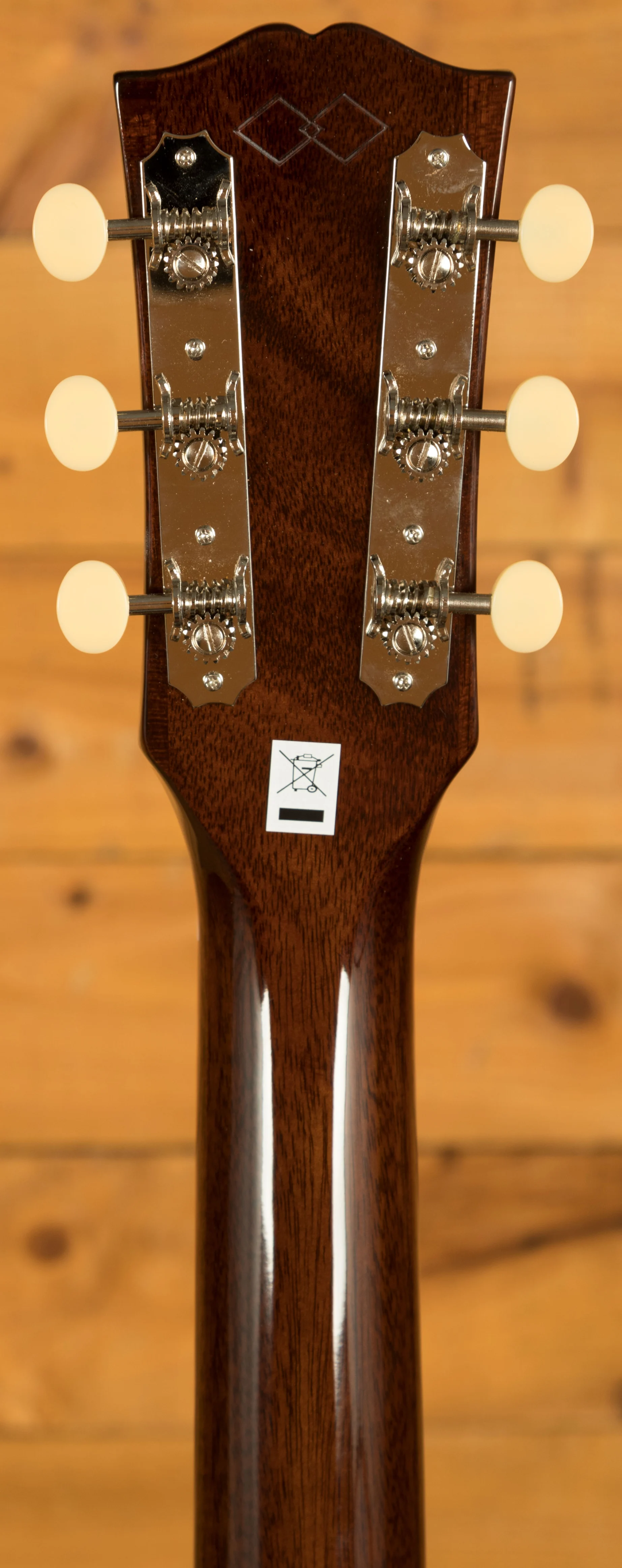 This guitar features a thermally aged solid spruce top reinforced with scalloped X-bracing, combined with solid mahogany back and sides. Together, these elements create the rich, balanced tone that has made the J-45 a longtime favourite amongst players. The pickguard retains the classic teardrop shape that was featured on the earliest J-45 models, preserving the vintage aesthetic that has become synonymous with this iconic guitar.