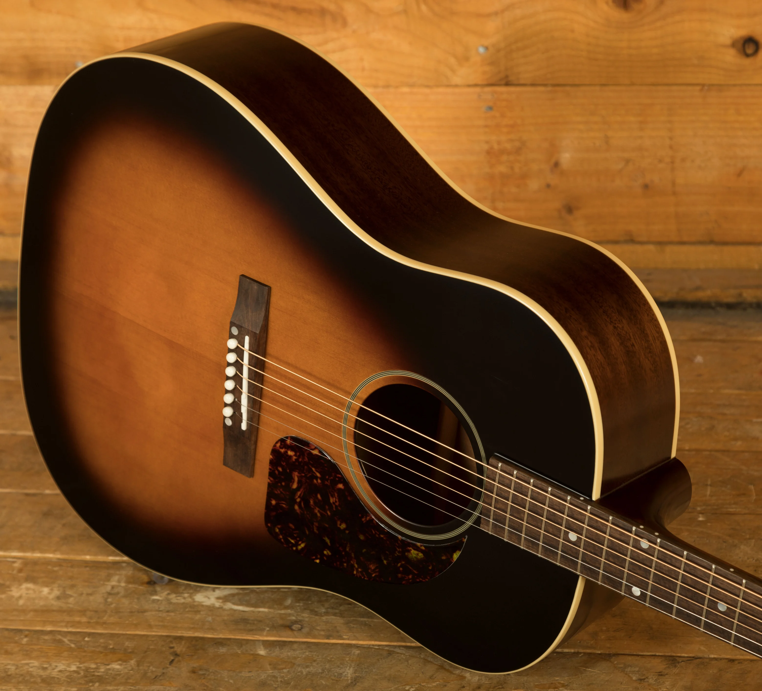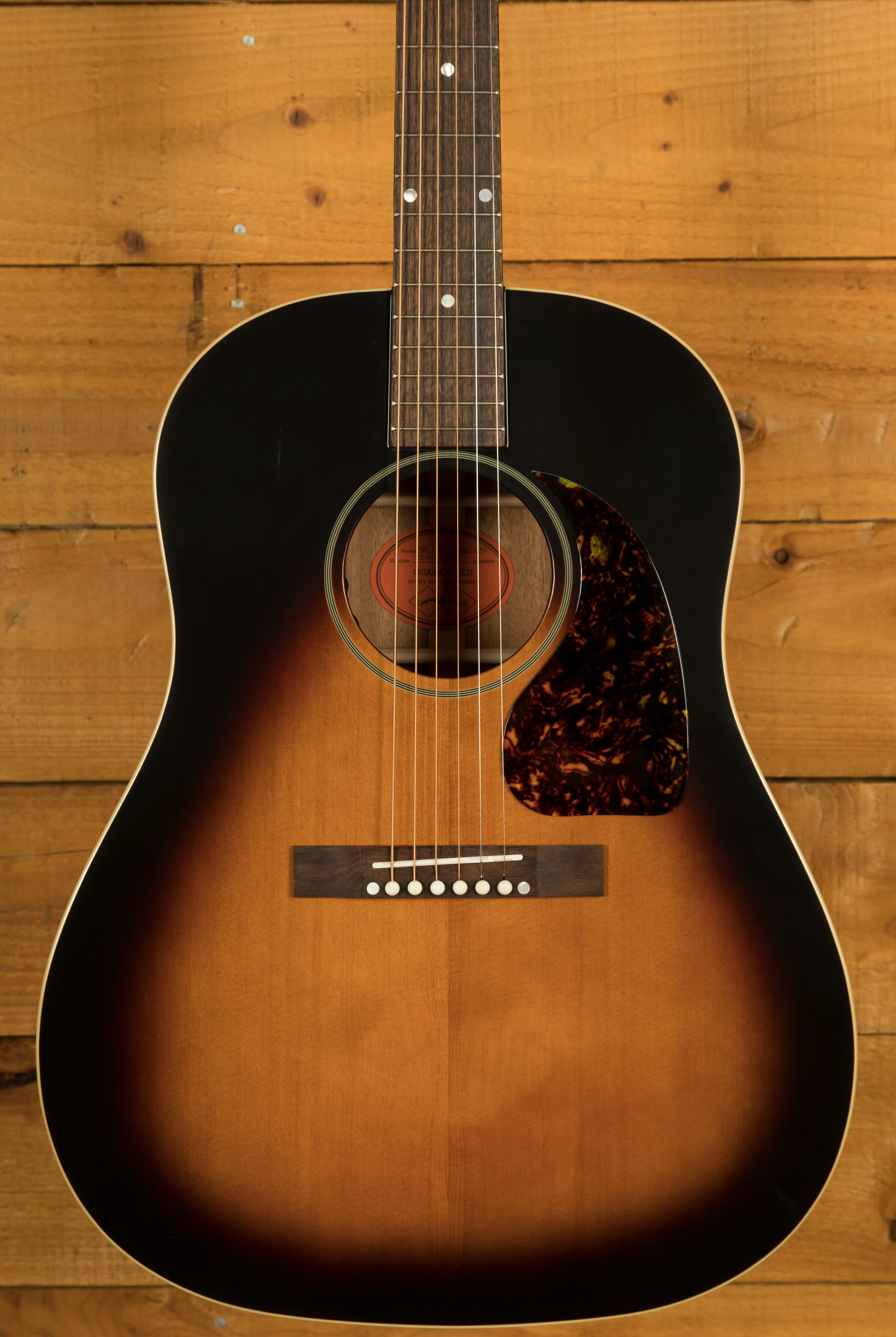 This slope shoulder Dreadnought body is beautifully crafted and looks the real deal! It features a solid thermally aged Red Spruce top, paired up with traditional Mahogany back and sides.The Aged Vintage Sunburst finish offers a unique look and perfectly complements the faux tortoiseshell pickguard.