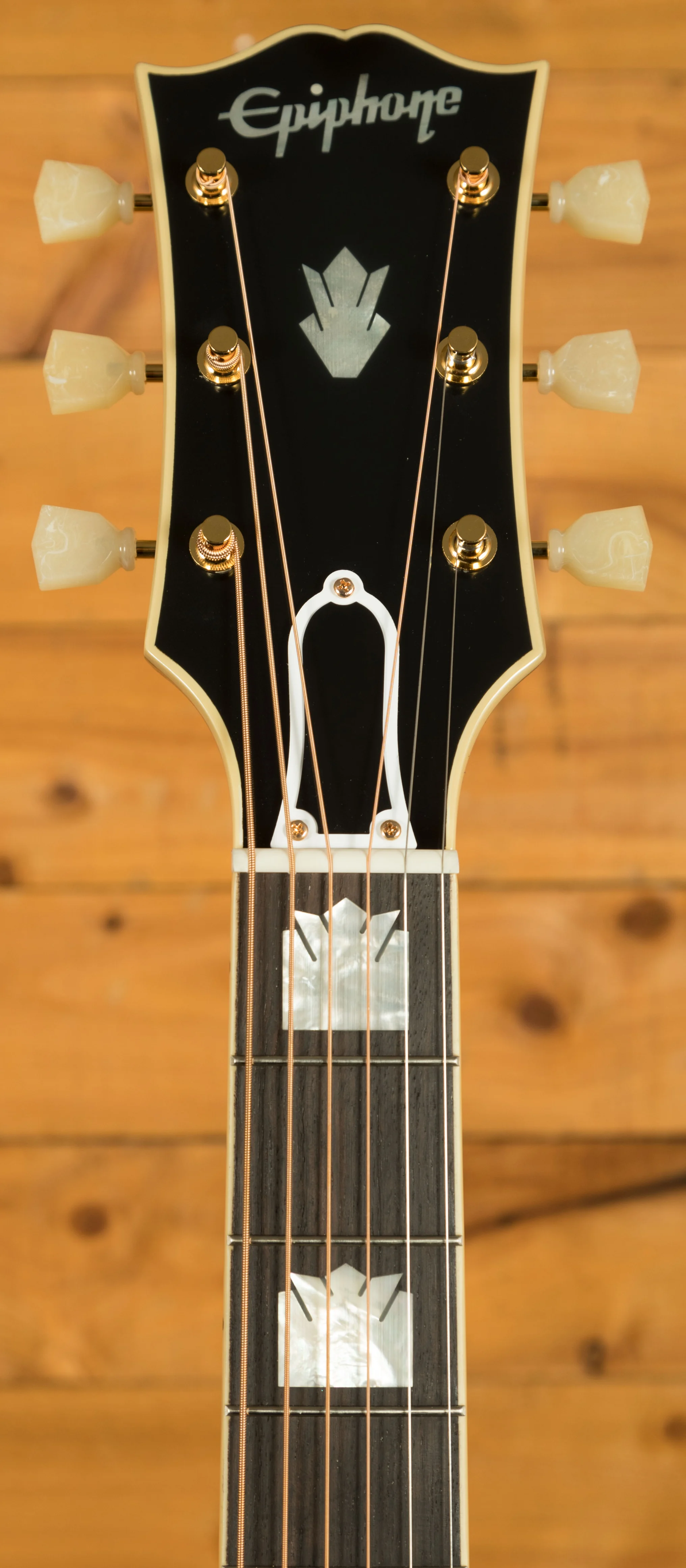 The Epiphone 1957 SJ-200 features a thermally aged solid sitka spruce top, alongside solid figured maple back and sides. Thanks to the all solid wood construction, these guitars vibrate more freely, producing a rich more dynamic tone. This guitar also features scalloped X-bracing, which further helps this guitar to deliver a strong, powerful sound