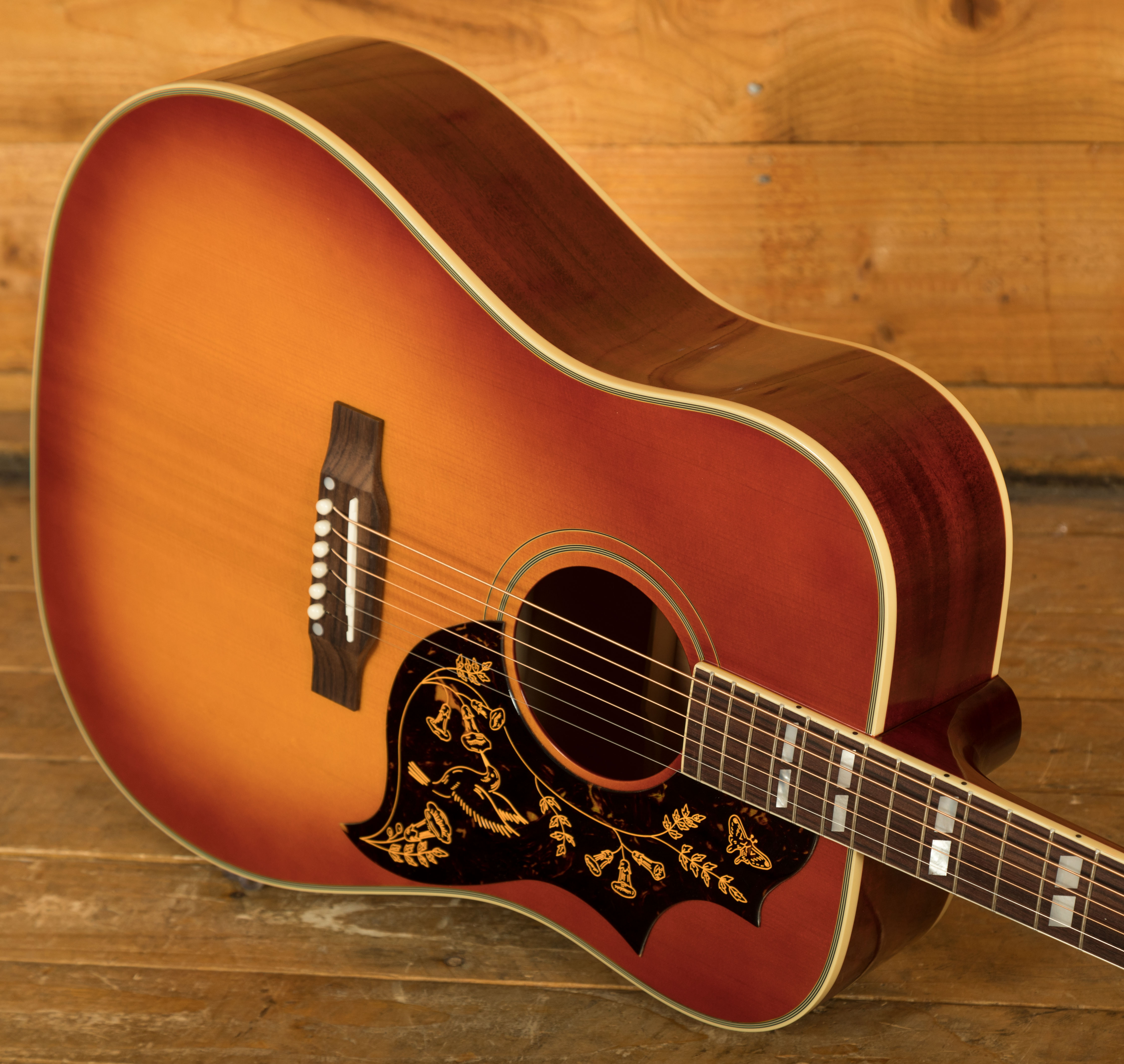 This Hummingbird includes all the distinctive details that make the vintage originals so recognizable. Its body is adorned with multi-ply binding on both the top and back. The belly-up rosewood bridge plate features a compensated bone saddle, and both the nut and bridge pins are made of bone. The pickguard showcases the iconic Hummingbird shape along with beautifully engraved artwork.