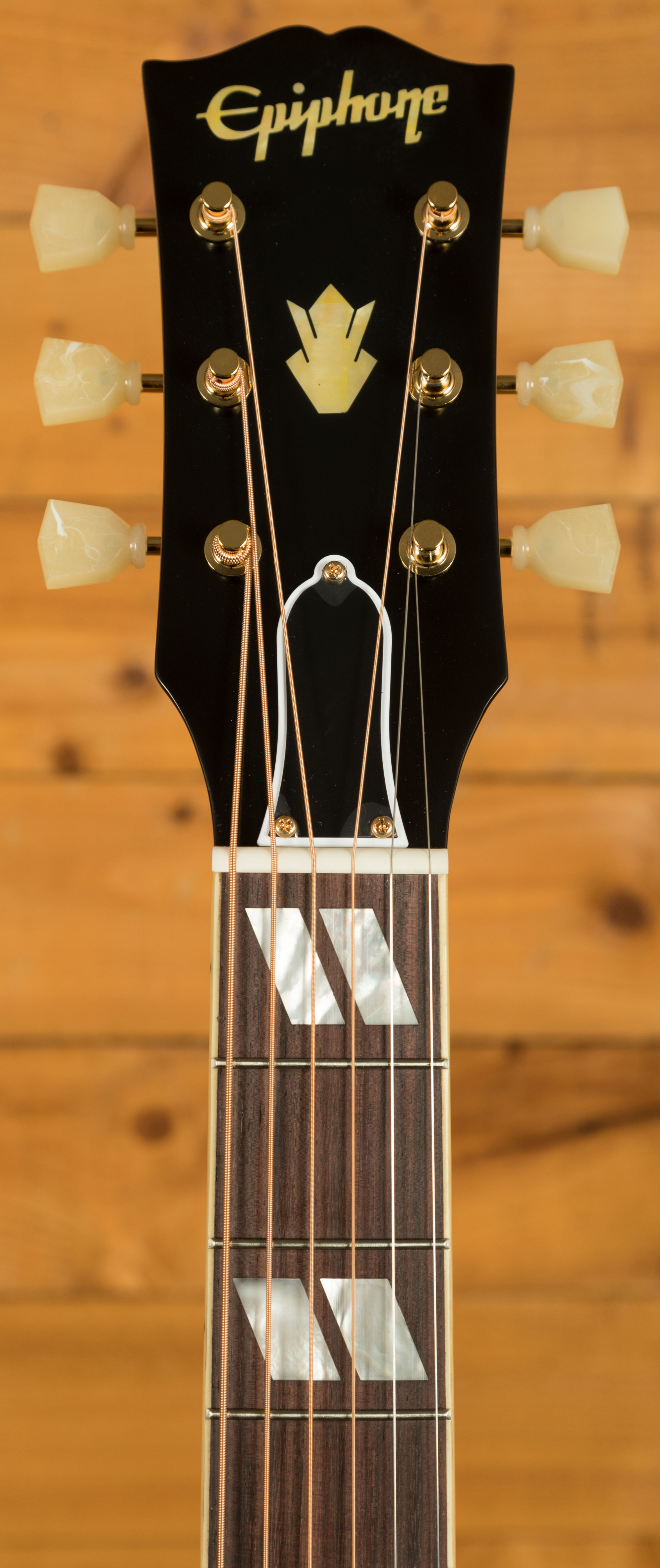 The one-piece mahogany neck features a 24.75-inch scale and a thermally aged finish, shaped with a comfortable Rounded profile. It’s topped with a bound rosewood fretboard, fitted with 20 standard frets, and accented with split parallelogram inlays made from mother of pearl. The headstock is equipped with gold-plated Epiphone Deluxe tuners featuring green Keystone buttons, providing reliable tuning stability so you can focus on playing instead of tuning. It also includes a two-ply black and white truss rod cover, while the Epiphone logo and Gibson Crown are inlaid in aged mother-of-pearl. The classic Gibson-style “open book” headstock shape is topped off with the Inspired by Gibson Custom double diamond logo etched on the back.