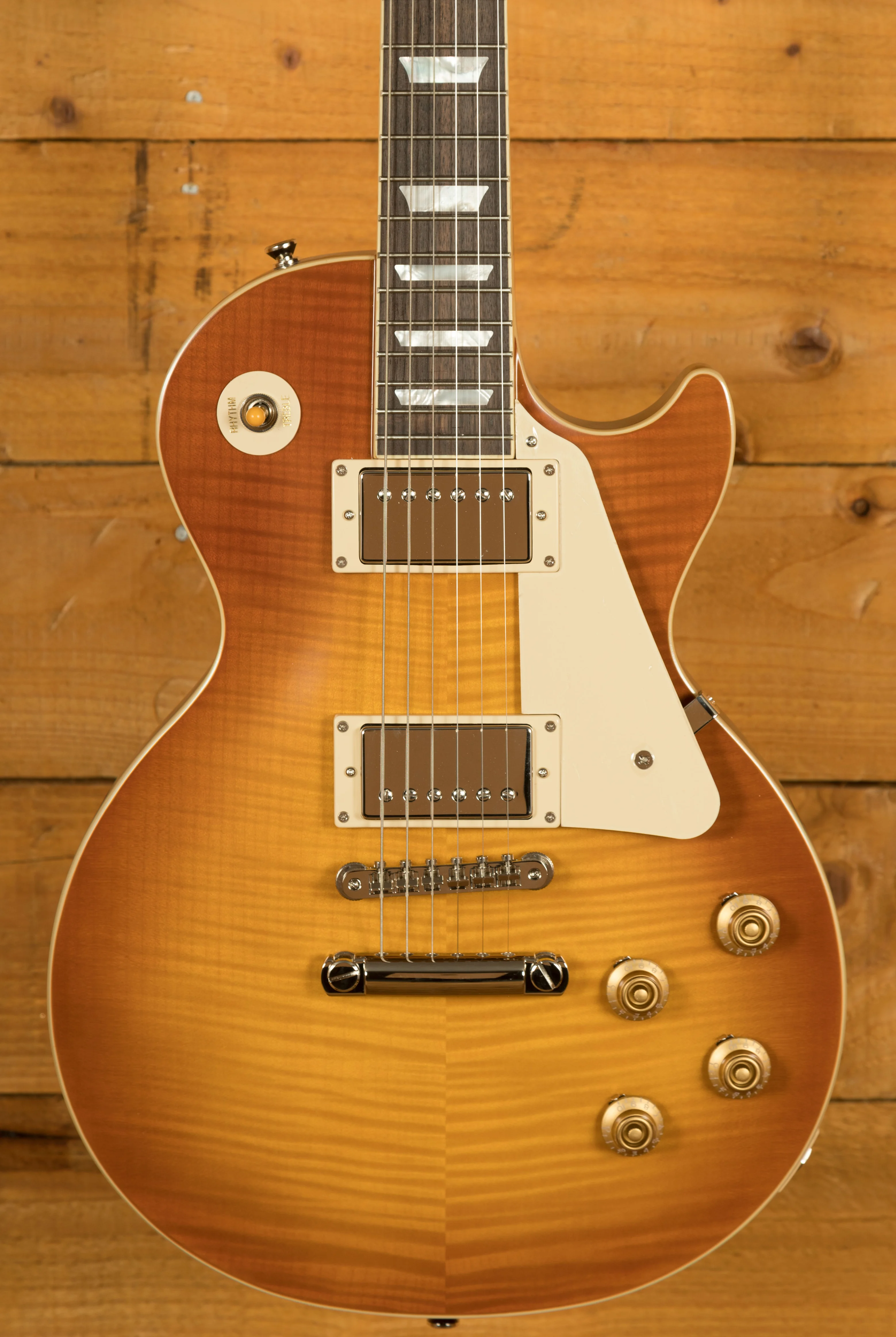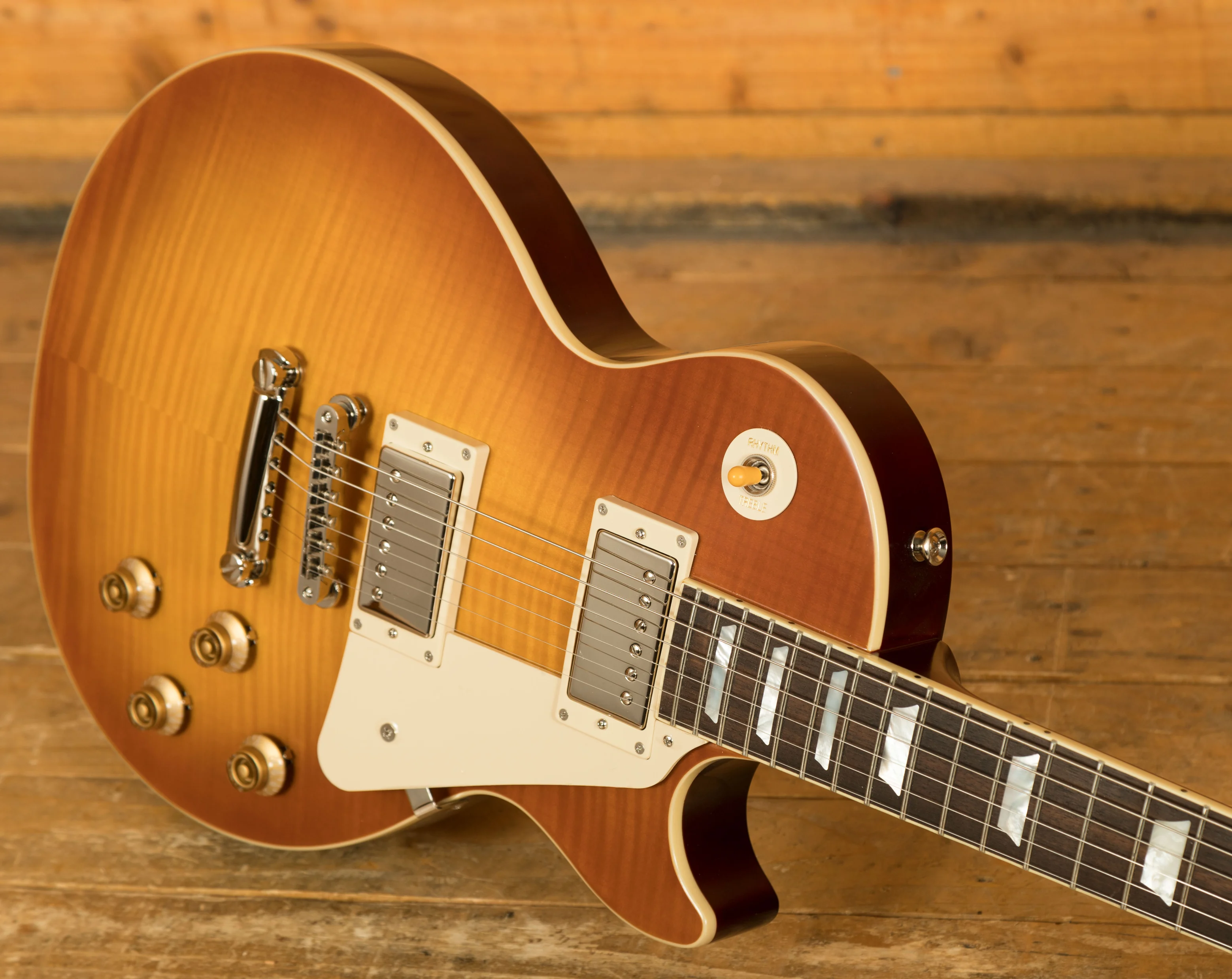 Every element of the 1959 Les Paul Standard has been carefully considered to ensure an unparalleled playing experience. Its exquisite construction begins with a solid mahogany body, exuding a resonant warmth that forms the foundation of its rich tonal character. Adorning the body is a captivating maple top with a AAA figured maple veneer, it adds a touch of elegance to its visual appeal.