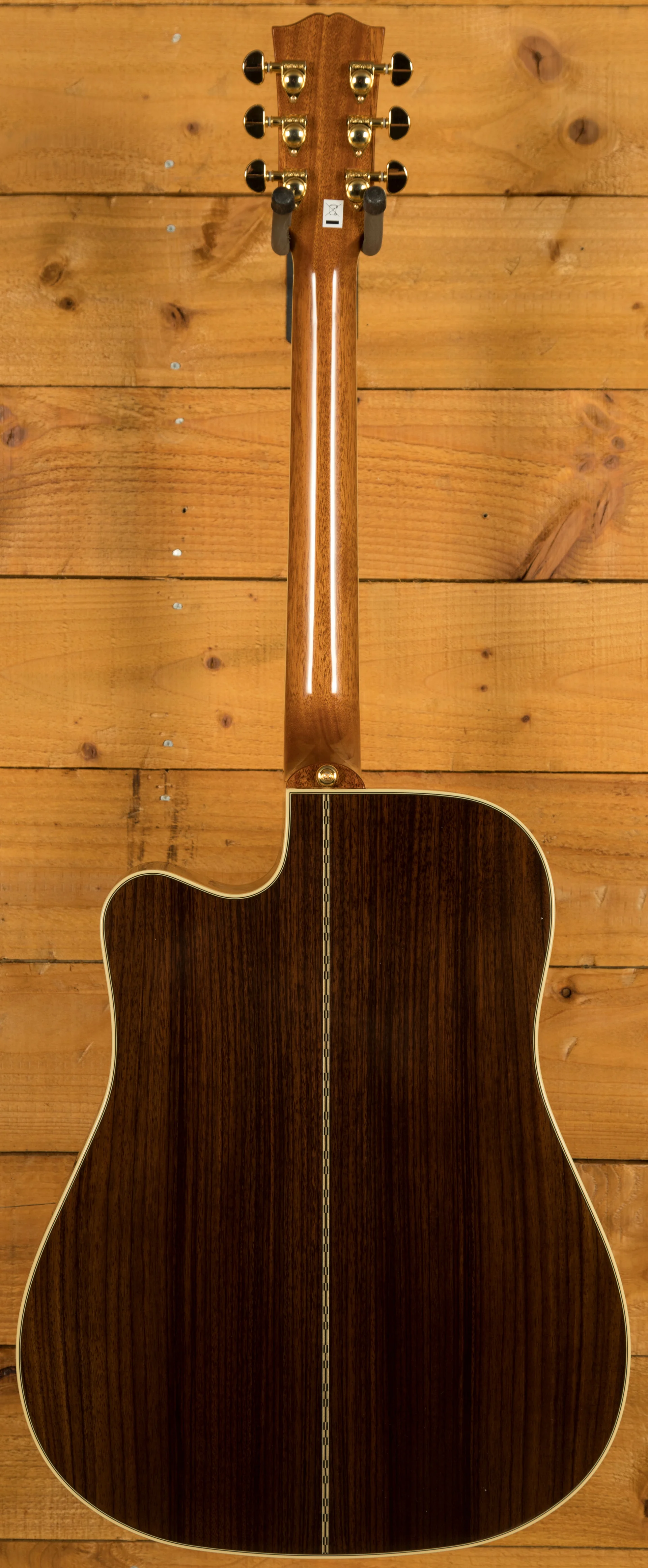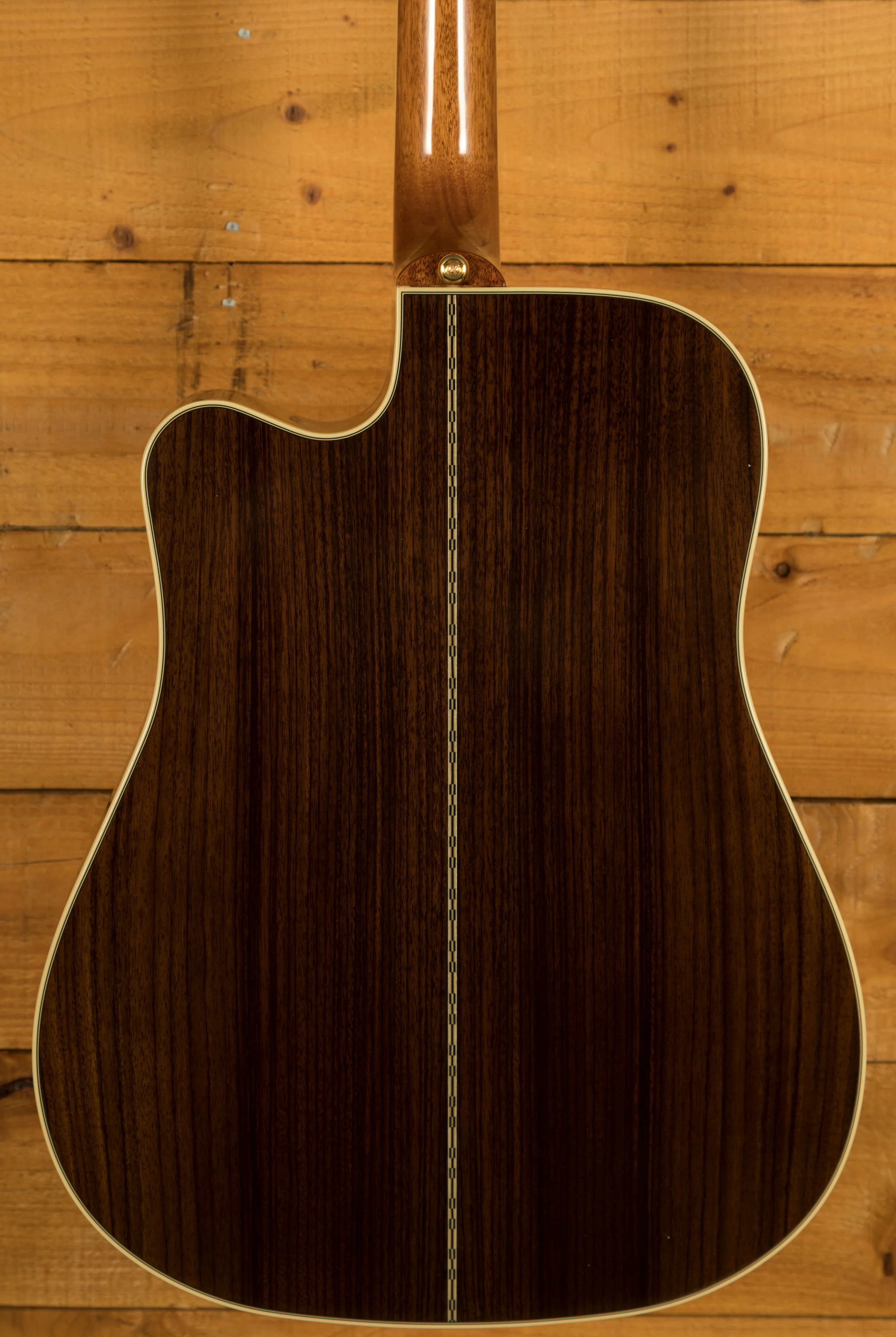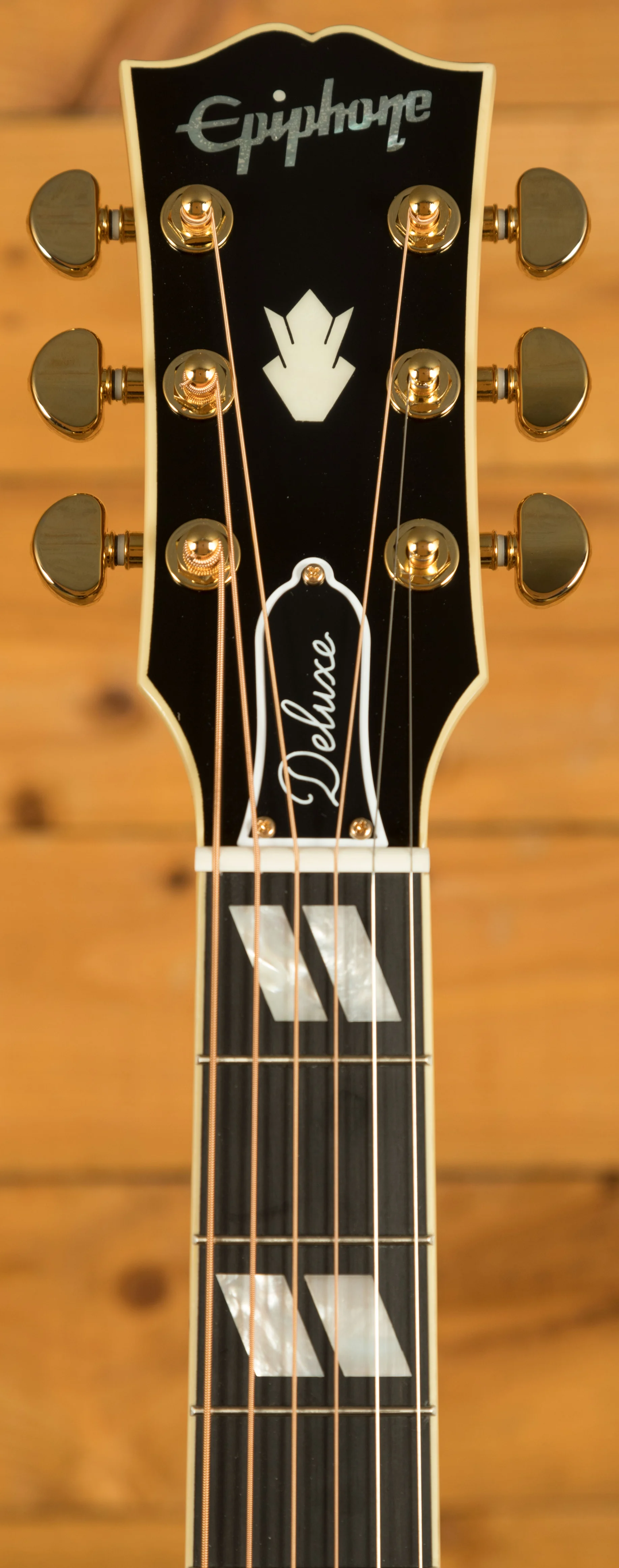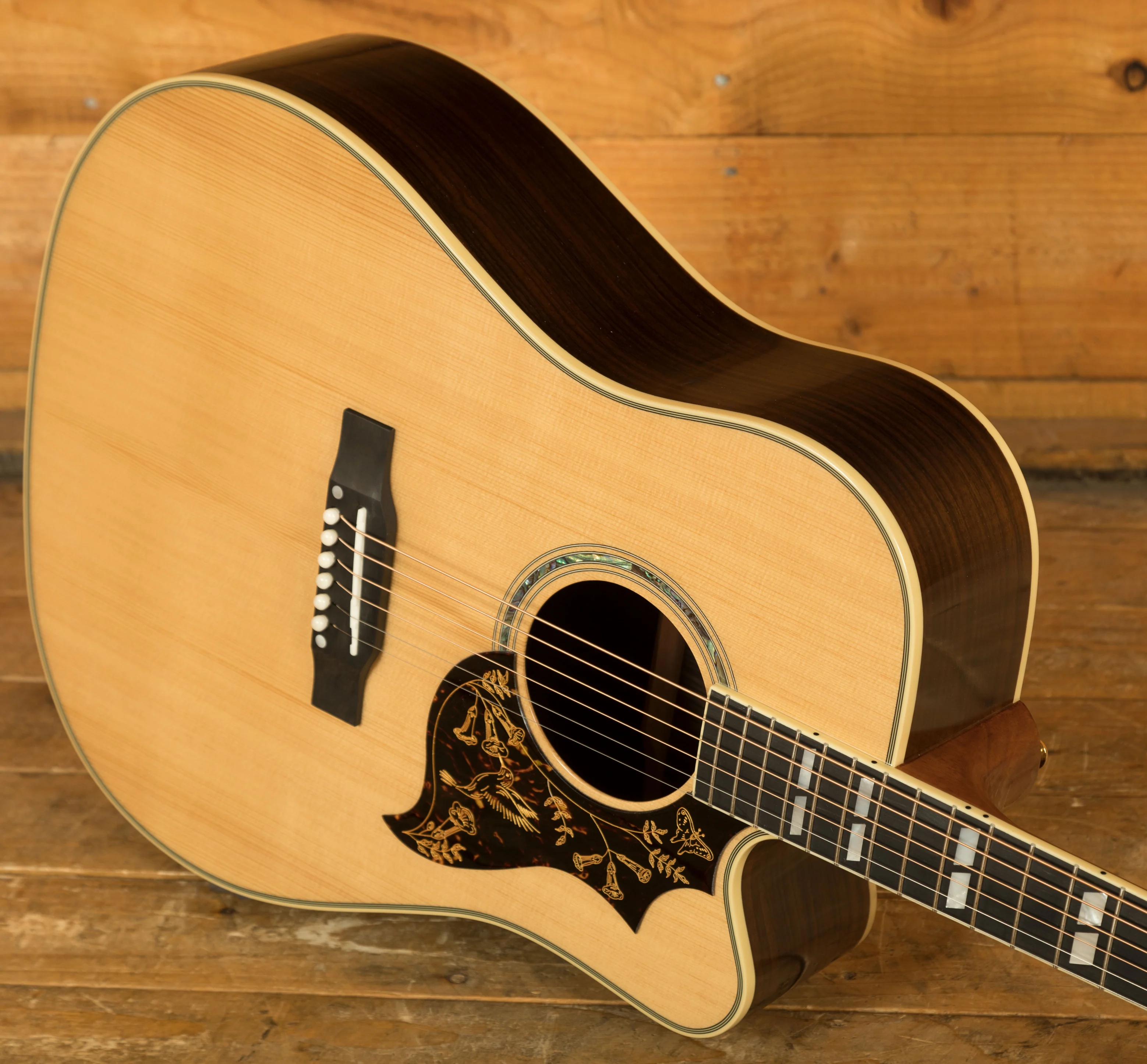 The Epiphone Hummingbird Deluxe EC features a thermally aged solid spruce top, alongside solid rosewood back and sides. This tone wood paring is legendary, and has been used across history for decades. Together they create a sweet, dynamic tone which is further enhanced by the all solid construction, and thermally aged scalloped x-bracing. This guitar has a full bass response and sparkling highs. The cutaway design allows easier access to the higher frets, making it a great option for lead guitarists and anyone who wants to play across the full fretboard. The pickguard is crafted from an acrylic and celluloid sandwich and showcases the instantly recognisable Hummingbird graphic etched in gold.