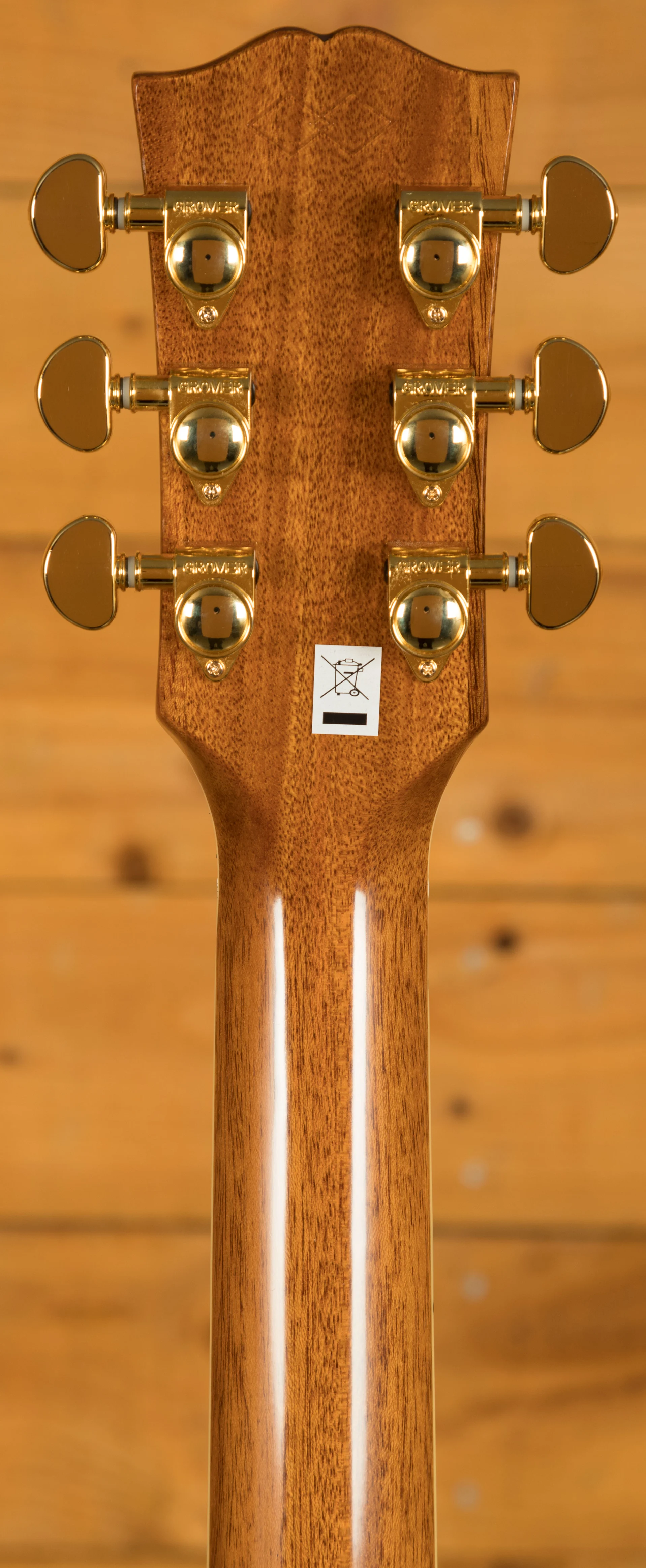 The Hummingbird Deluxe EC features a one-piece mahogany neck, which is glued in using a traditional dove tail joint. The rounded c profile is really comfortable and will feel familiar to anyone who plays traditional Gibson acoustic guitars. The Ebony fingerboard features 20 frets, a 43.815mm nut width, a 24.75” scale length, and mother-of-pearl split parallelogram inlays.