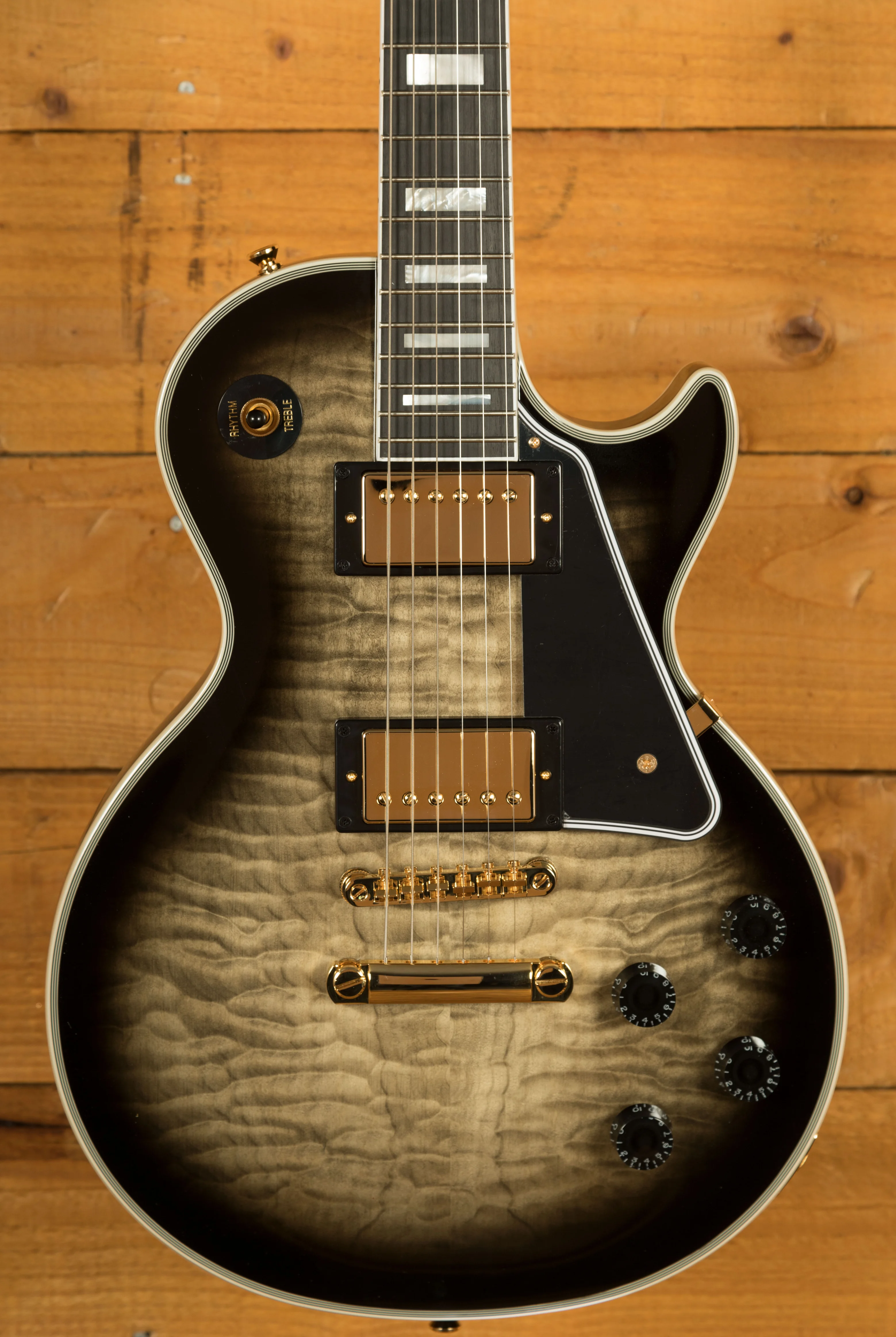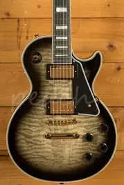Based off of the recent Gibson Custom Les Paul Custom Figured Tops in Cobra Burst, these Epiphone renditions offer the same mojo and visual flair but at a much more affordable price point. With all the standard features of a Les Paul Custom that make it so elegant, the quilt maple veneer and Cobra Burst finish really is the cherry on top. Built from a Mahogany body with a 1-piece Mahogany neck, it's super resonant and has amazing sustain. The Ebony fingerboard is smooth to play on and fits the dark aesthetic perfectly.