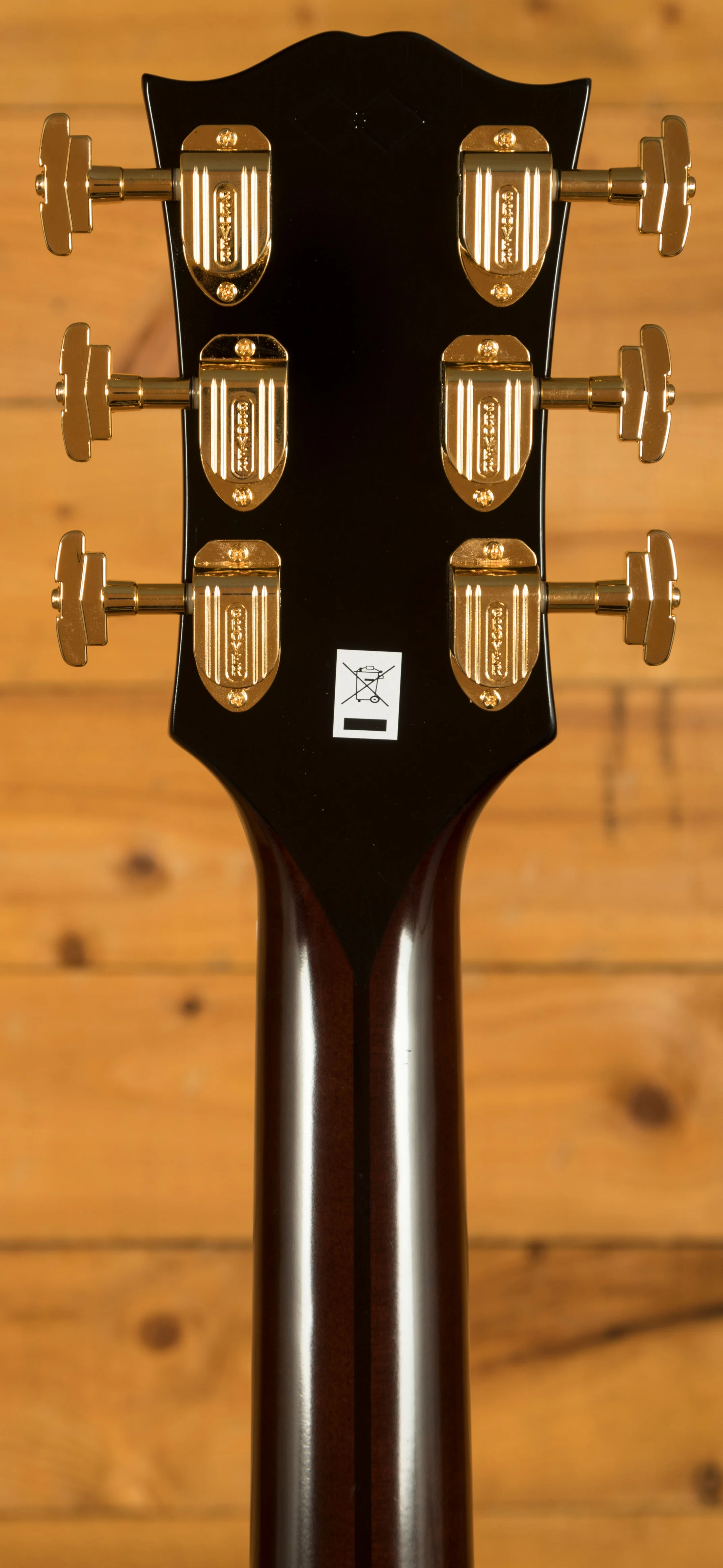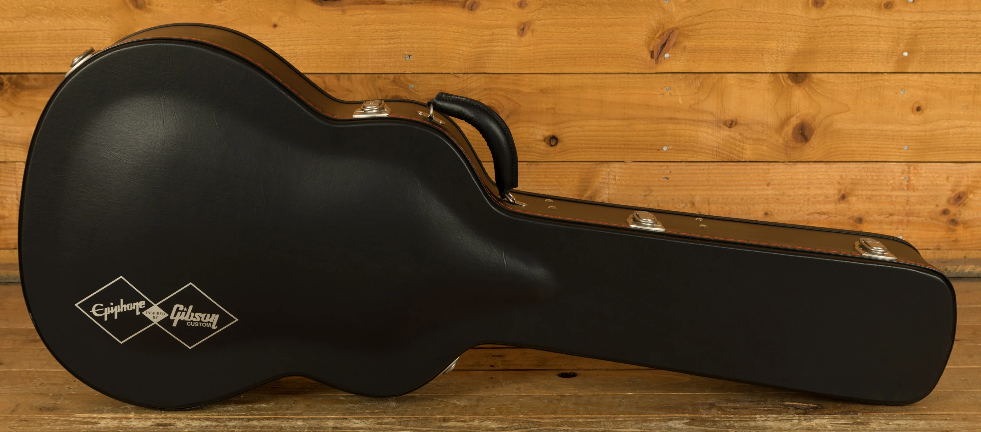 The 2-piece maple neck with rosewood stringer features a round “d” profile, which feels chunky and secure in your hand. It’s perfect for playing first position chords, and works great for lead lines as well. The ebony fretboard is decorated with mother-of-pearl graduated Crown inlays and fitted with 20 standard frets. The Gibson “open book” headstock showcases a vintage Epiphone logo and a Gibson Crown inlay crafted from aged mother-of-pearl. It also features a stinger and the Inspired by Gibson Custom Double Diamond logo etched on the back.