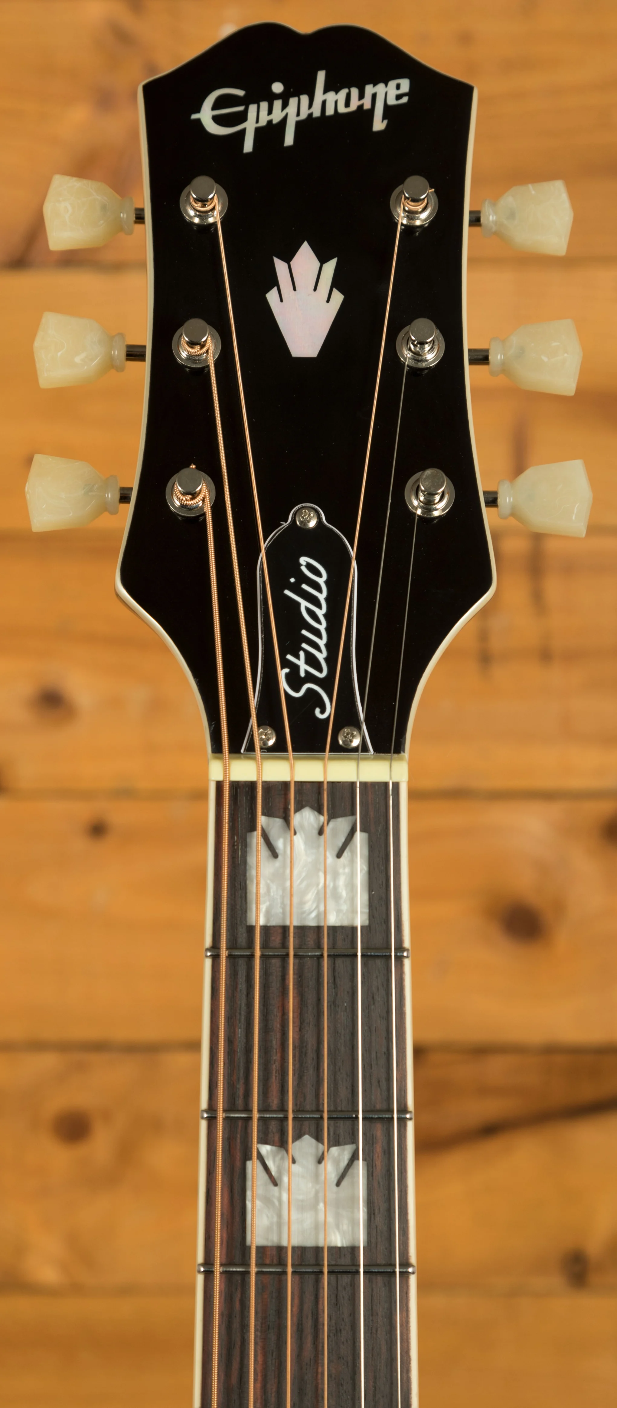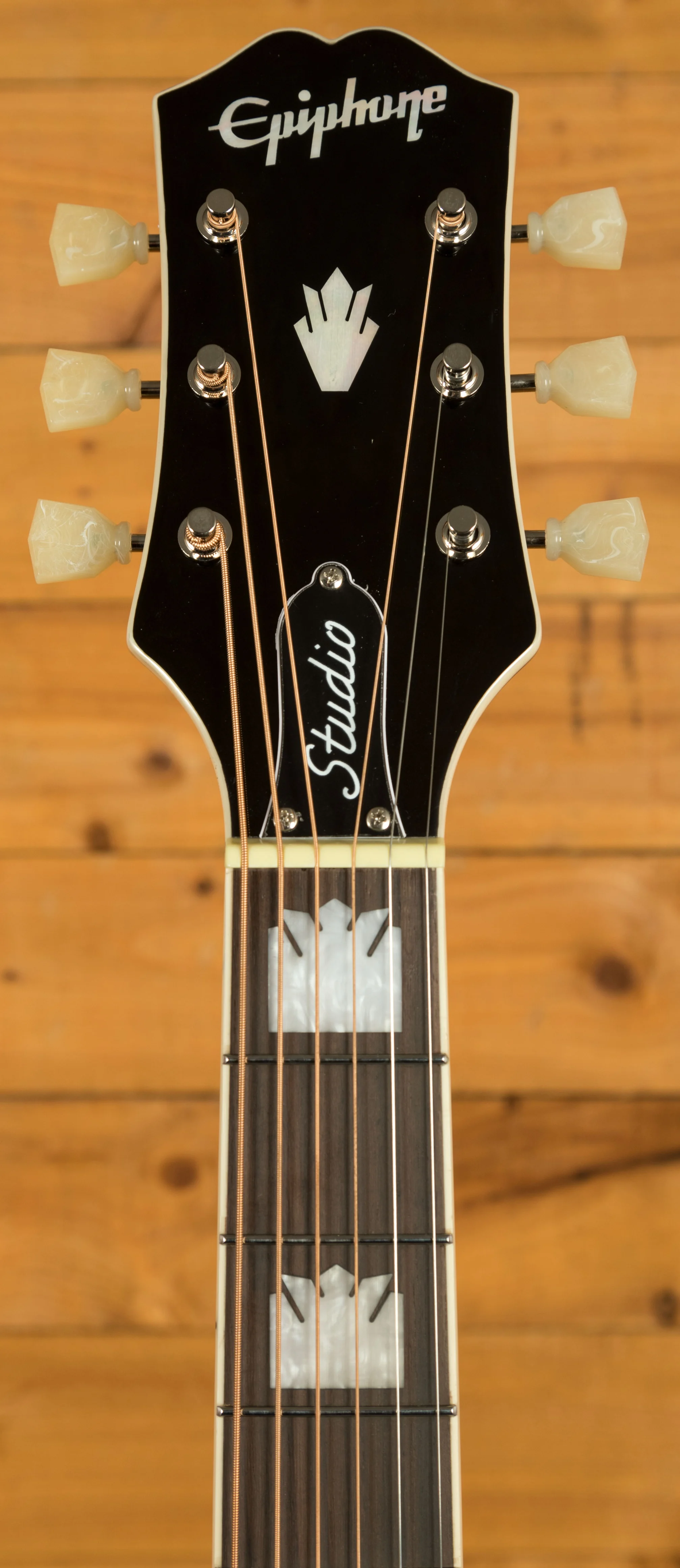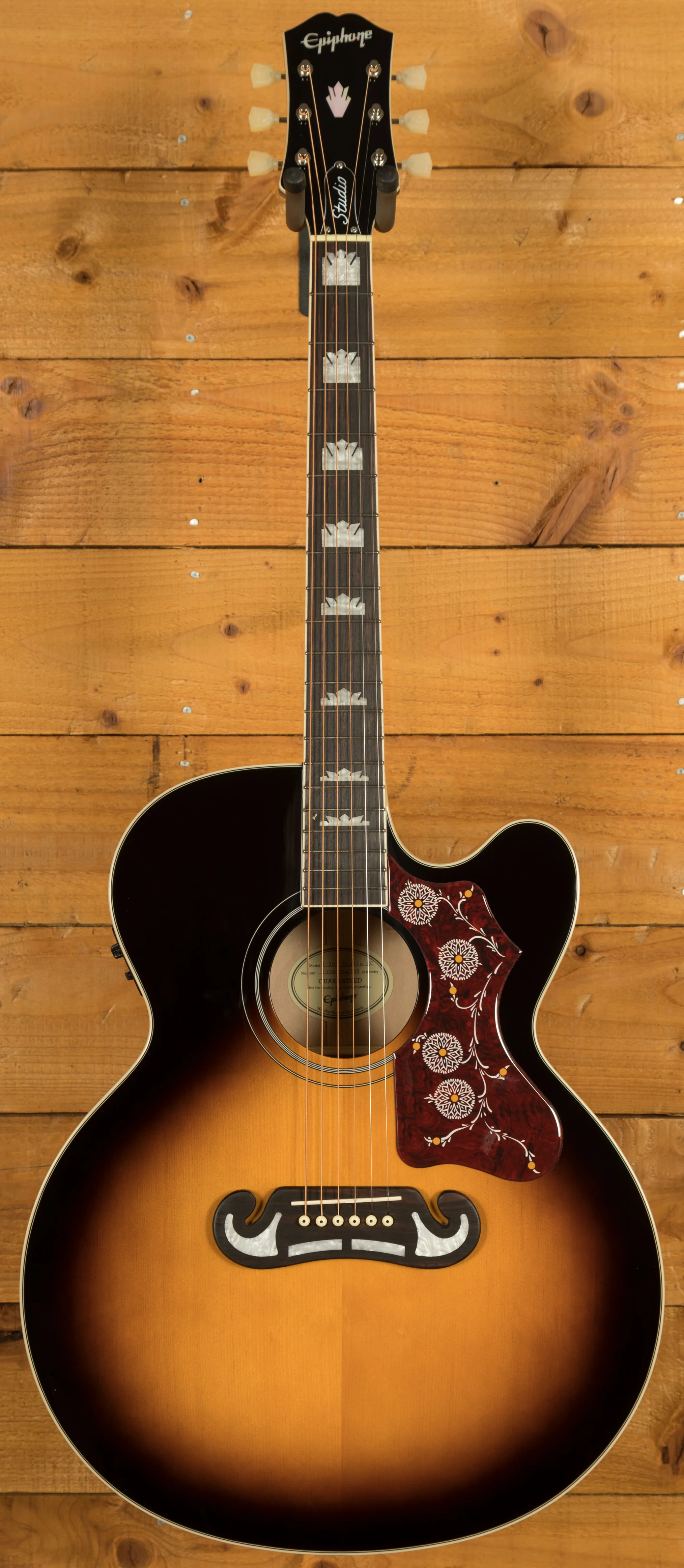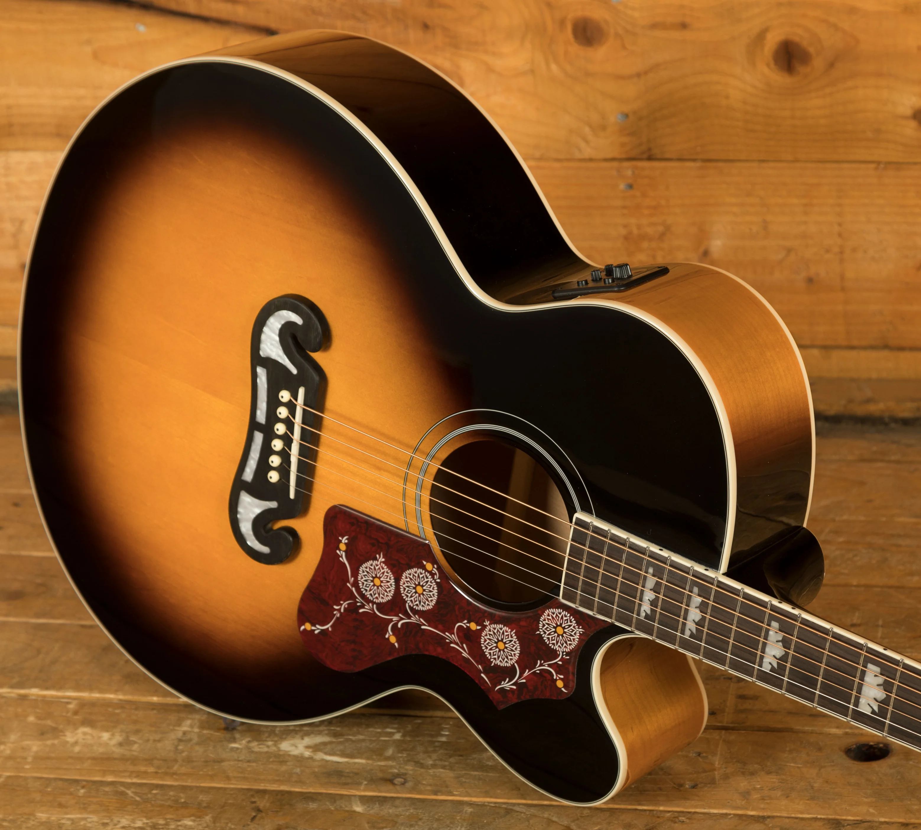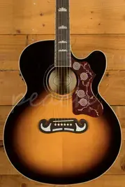The J-200 Studio EC keeps the classic look of the original with its iconic tortoise pickguard featuring graphics, deluxe tuners and a sixties Kalamazoo style headstock with mother of pearl details. It also features a rosewood 'moustache' bridge with a compensated saddle for accurate intonation.