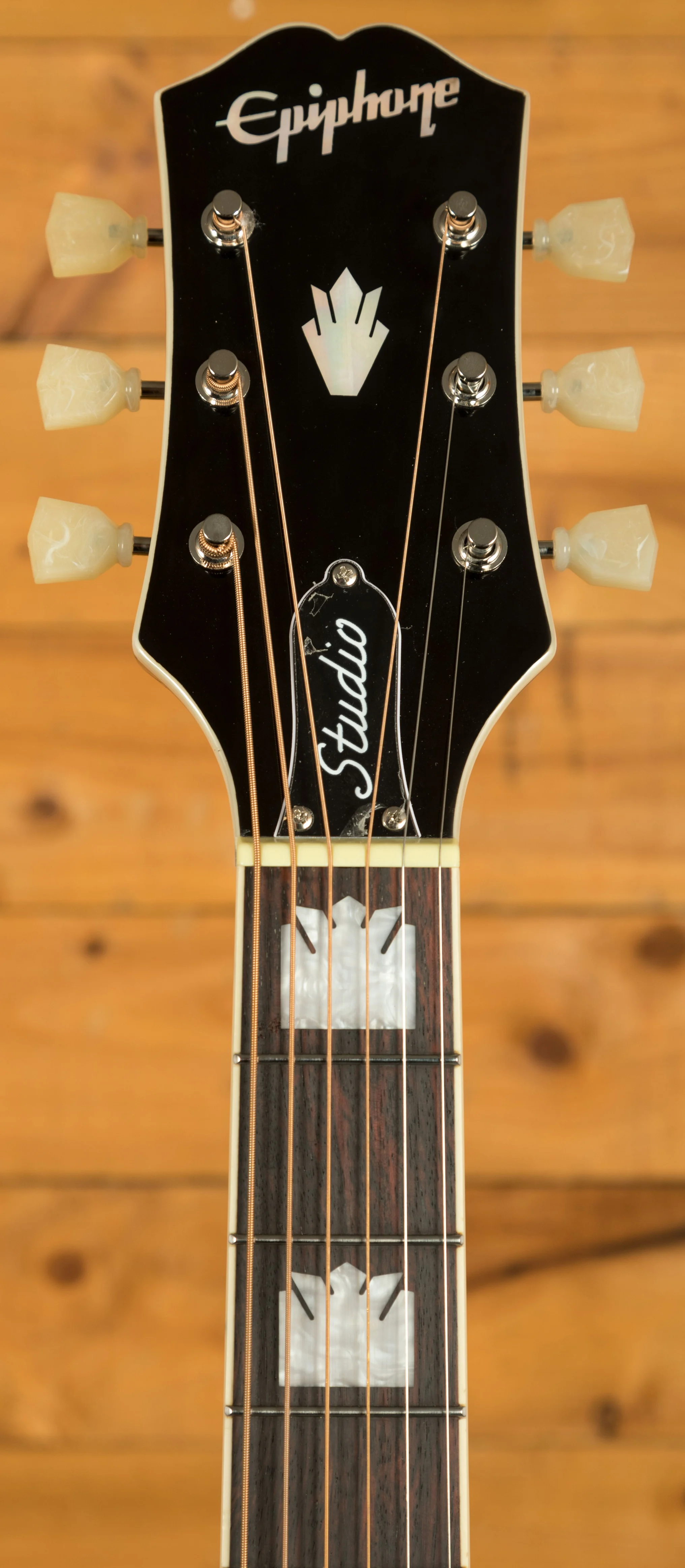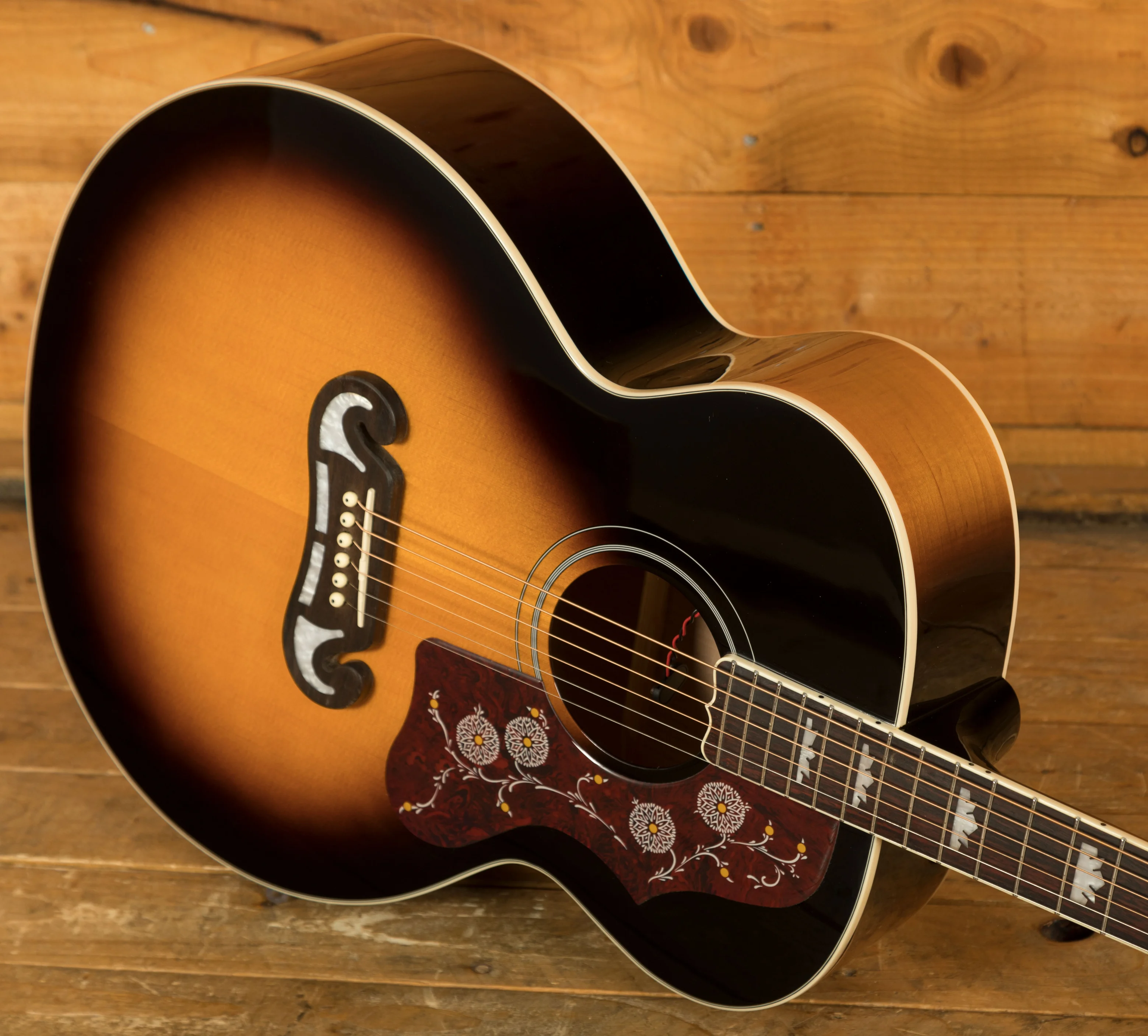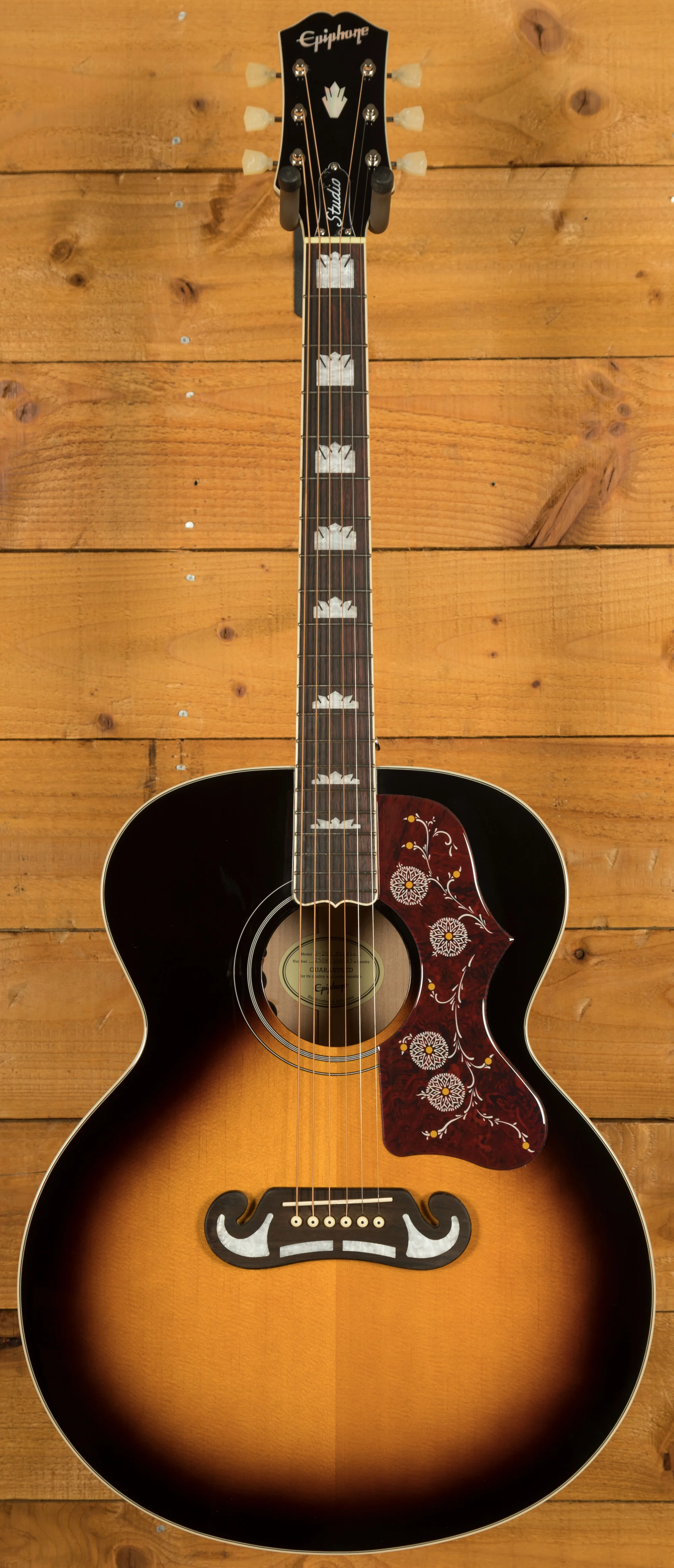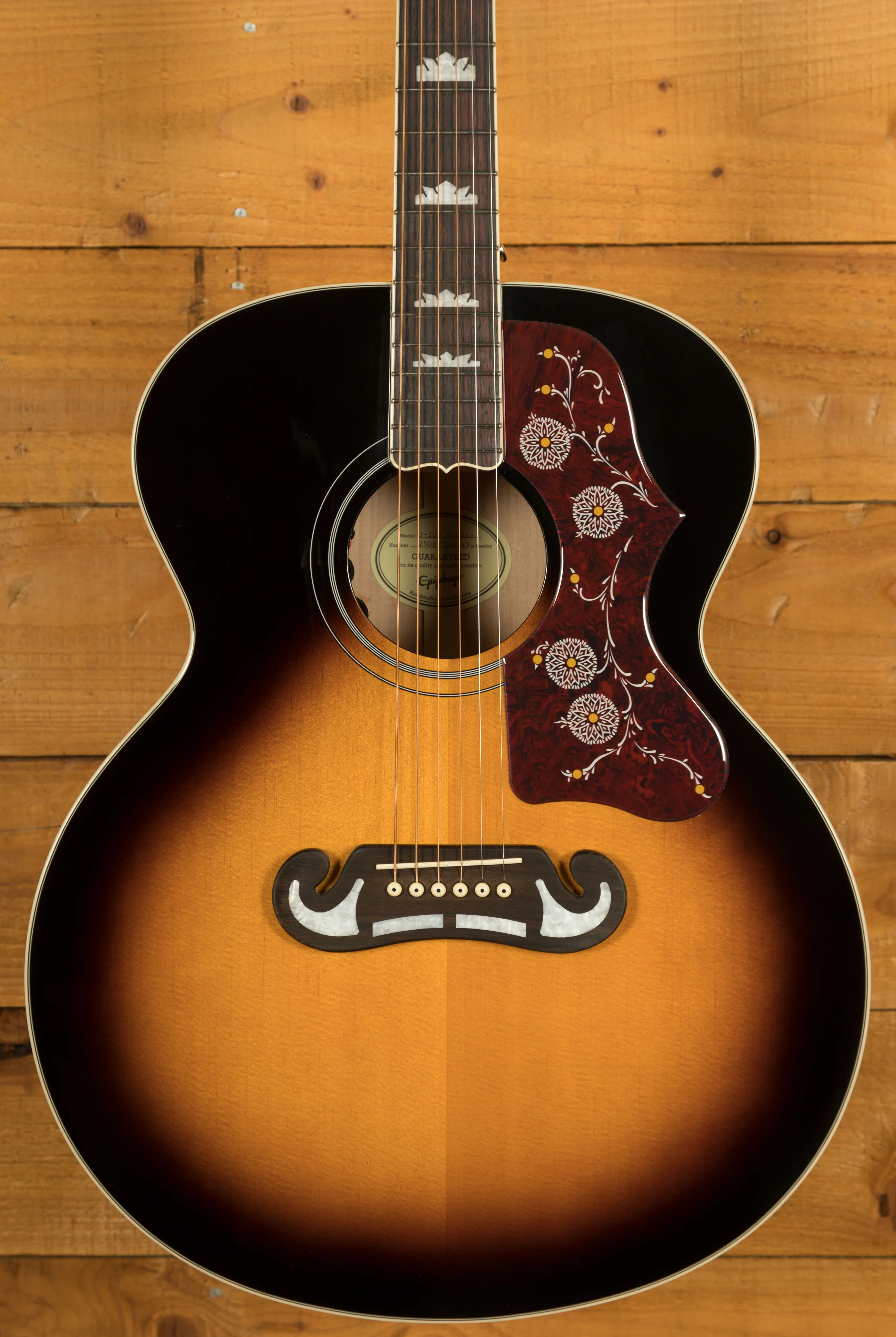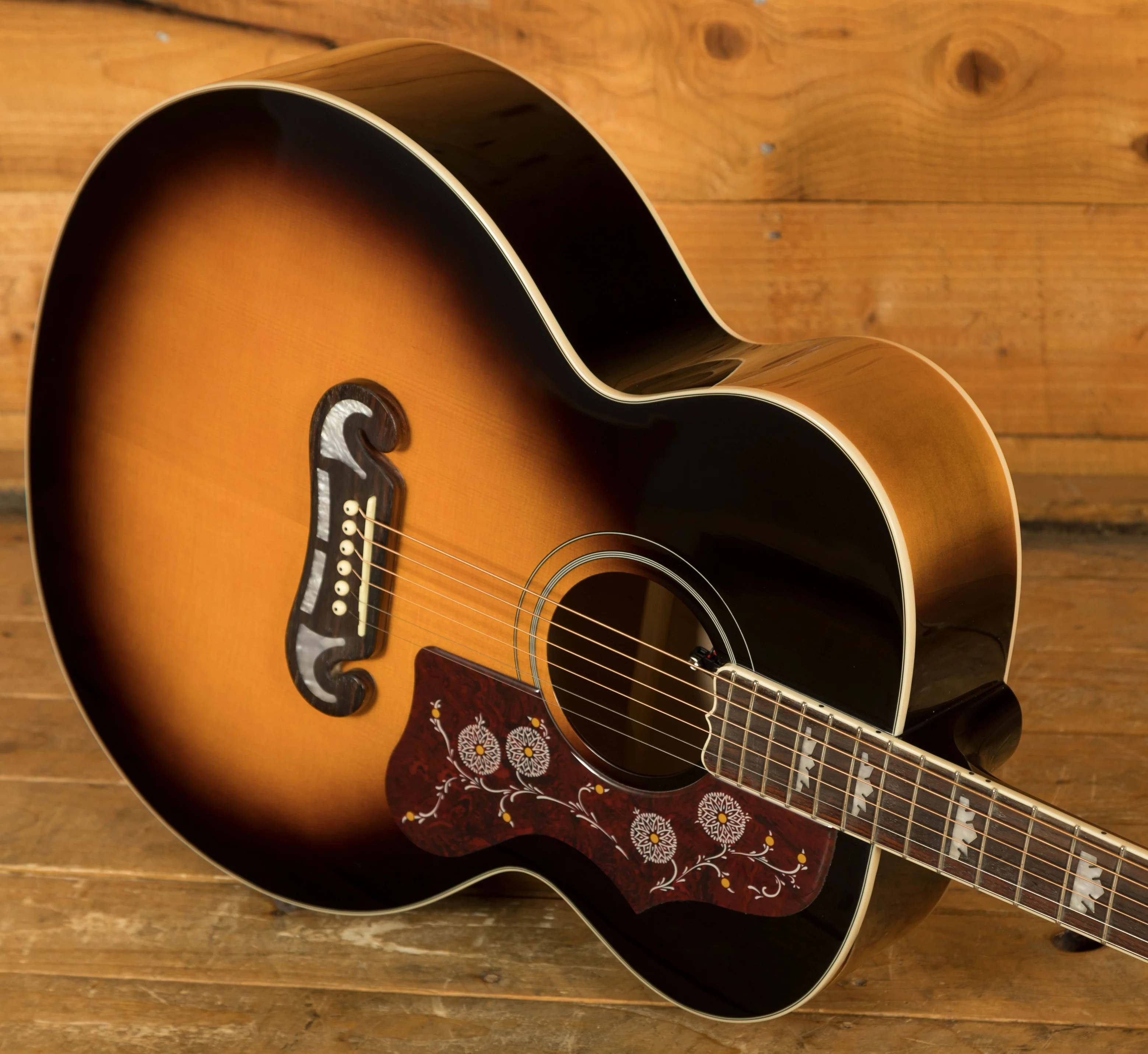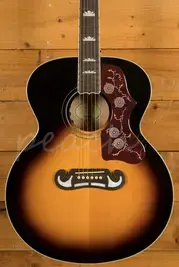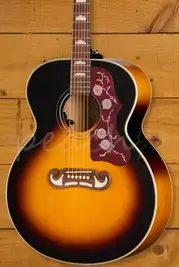 The J-200 Studio keeps the classic look of the original with its iconic tortoise pickguard featuring graphics, deluxe tuners and a sixties Kalamazoo style headstock with mother of pearl details. It also features a rosewood 'moustache' bridge with a compensated saddle for accurate intonation.