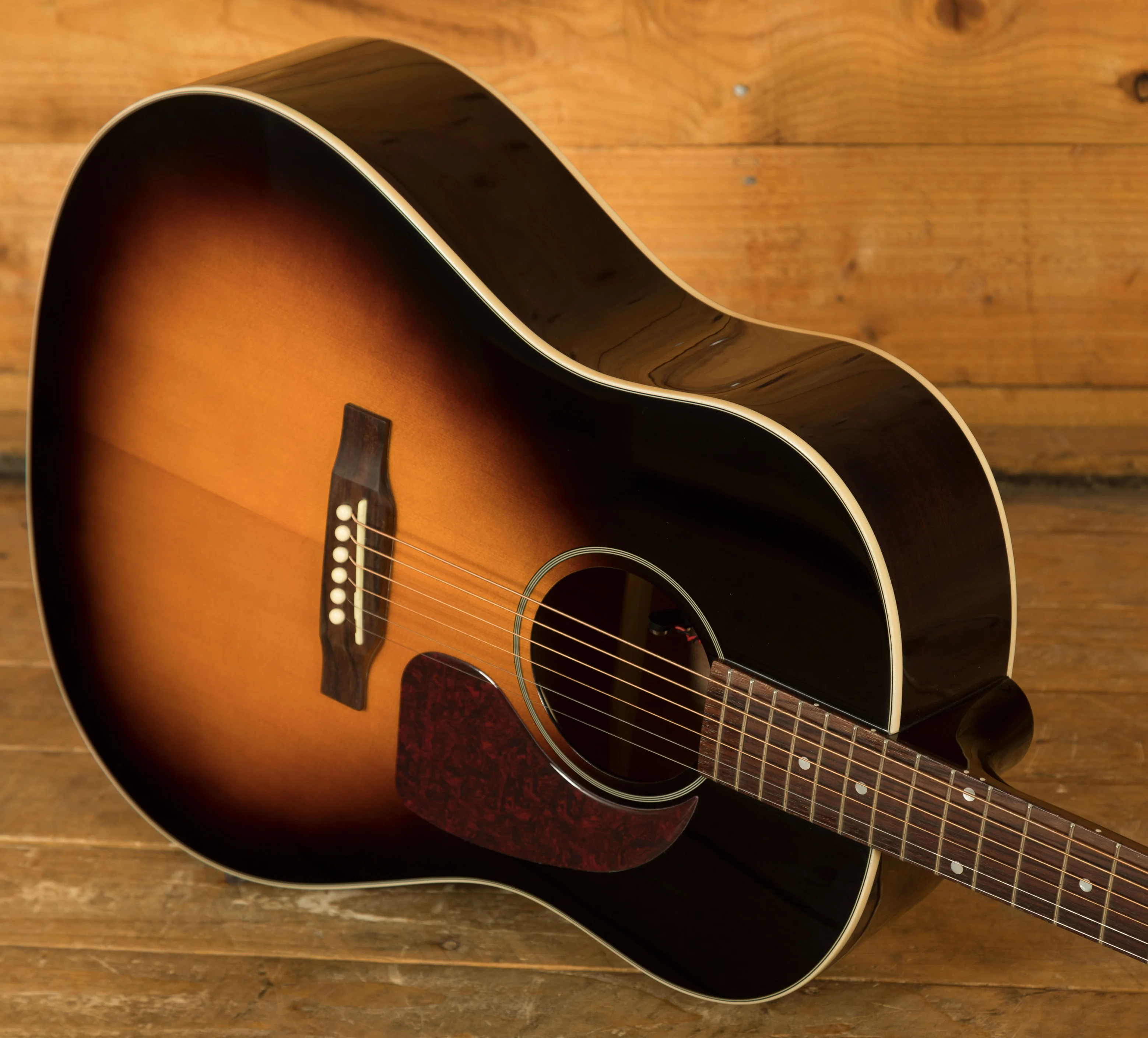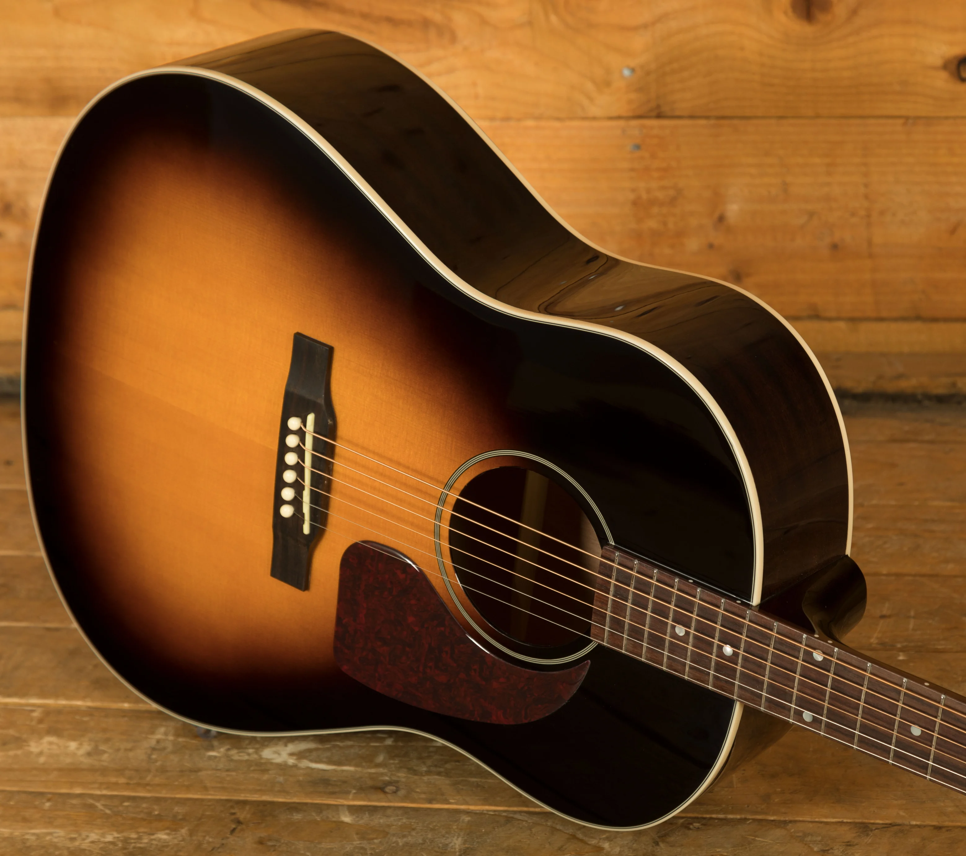 The J-45 Studio keeps the classic look of the original with its teardrop tortoise pickguard, three-on-a-plate tuners and a sixties Kalamazoo style headstock with mother of pearl details. It also features a rosewood 'belly-up' bridge with a compensated saddle for accurate intonation.