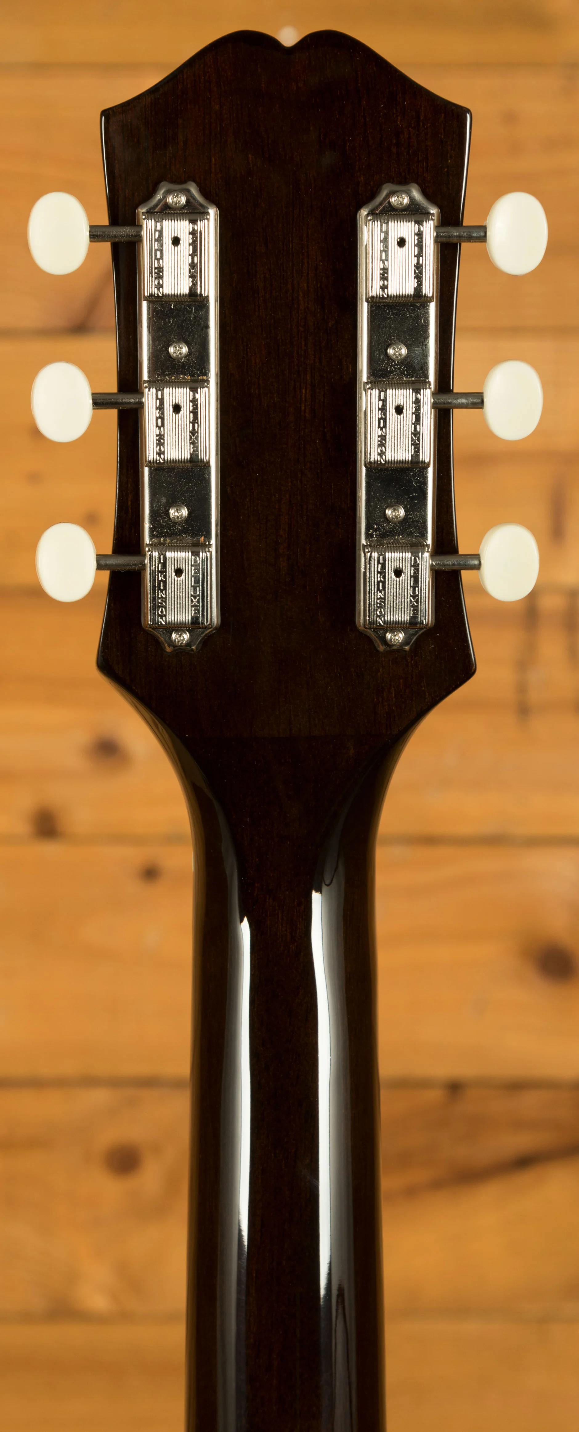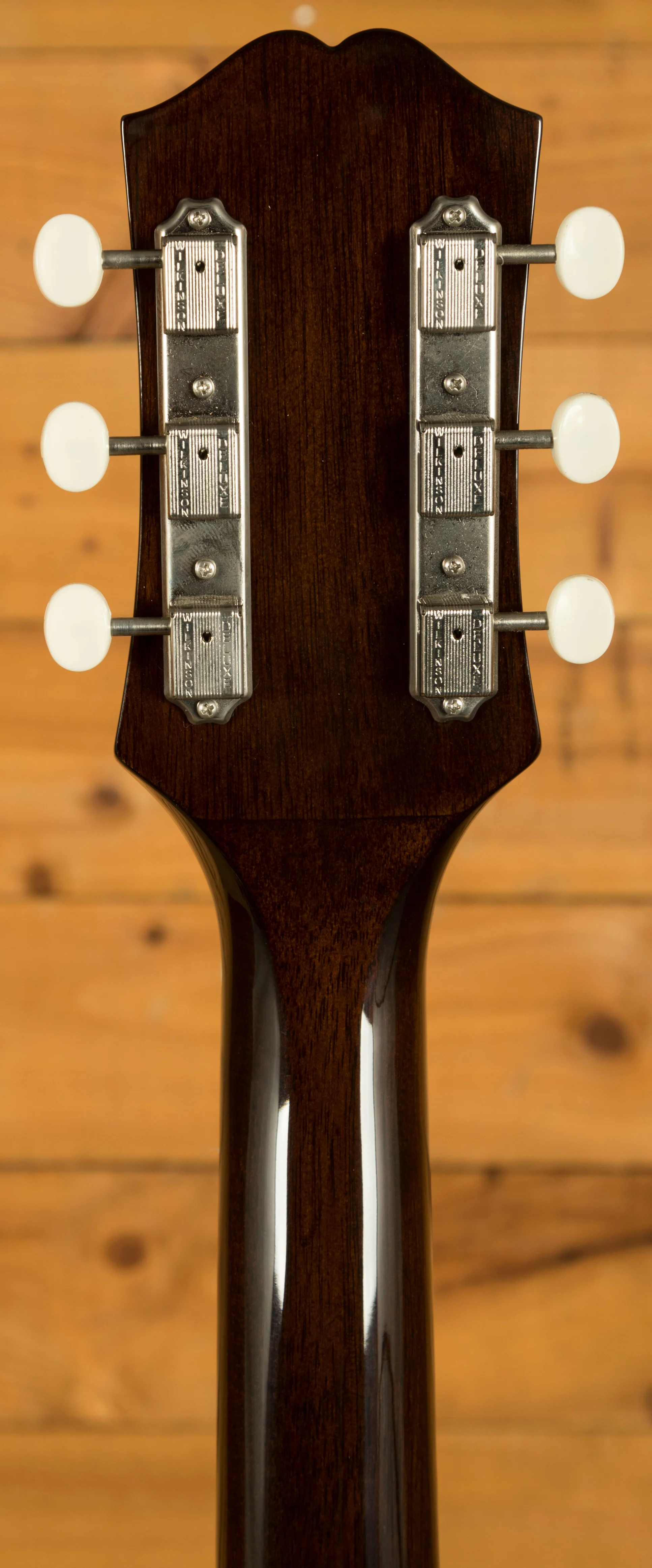 The Mahogany neck is joined to the body with a glued-in tapered dovetail joint, and features a rounded c neck profile. This profile is super comfortable and feels great in your hands, ensuring easy playability. It also features a 12" radius rosewood fingerboard equipped with 20 standard frets, a 24.75" scale length, a 43mm nut width, and traditional pearloid dot inlays.