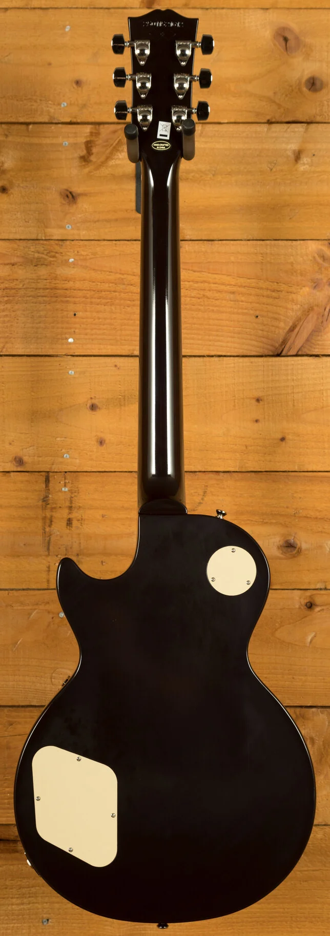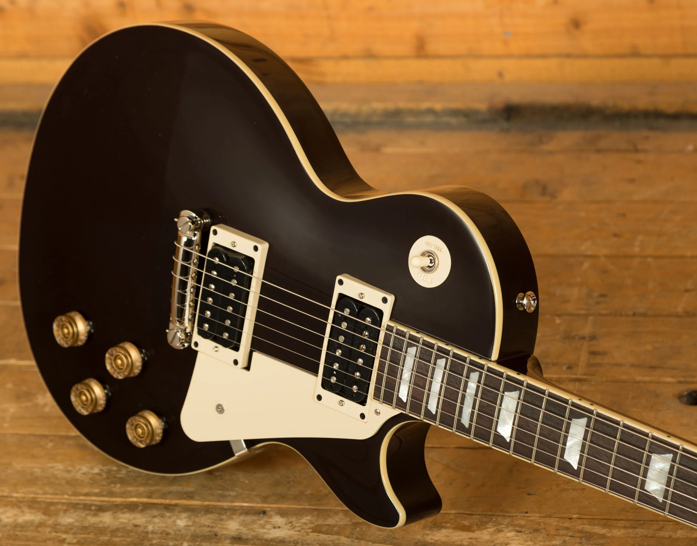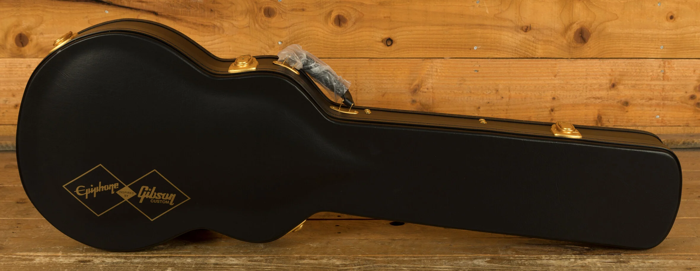 It is powered by a pair of USA made Gibson Custombucker humbucker™ pickups, connected to CTS® potentiometers and Mallory capacitors using classic 1950s style wiring. Other carefully considered details have been included to match the original guitar, such as gold Speed knobs, a Les Paul pickguard with a gap above the bridge pickup, and a Gibson Historic Wraparound bridge. It comes packaged in an Epiphone hardshell case with Inspired by Gibson Custom graphics and includes a vintage-style replica strap.