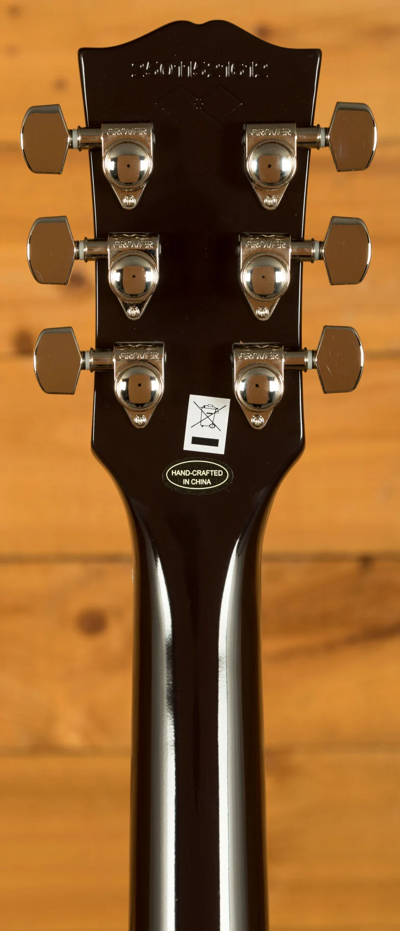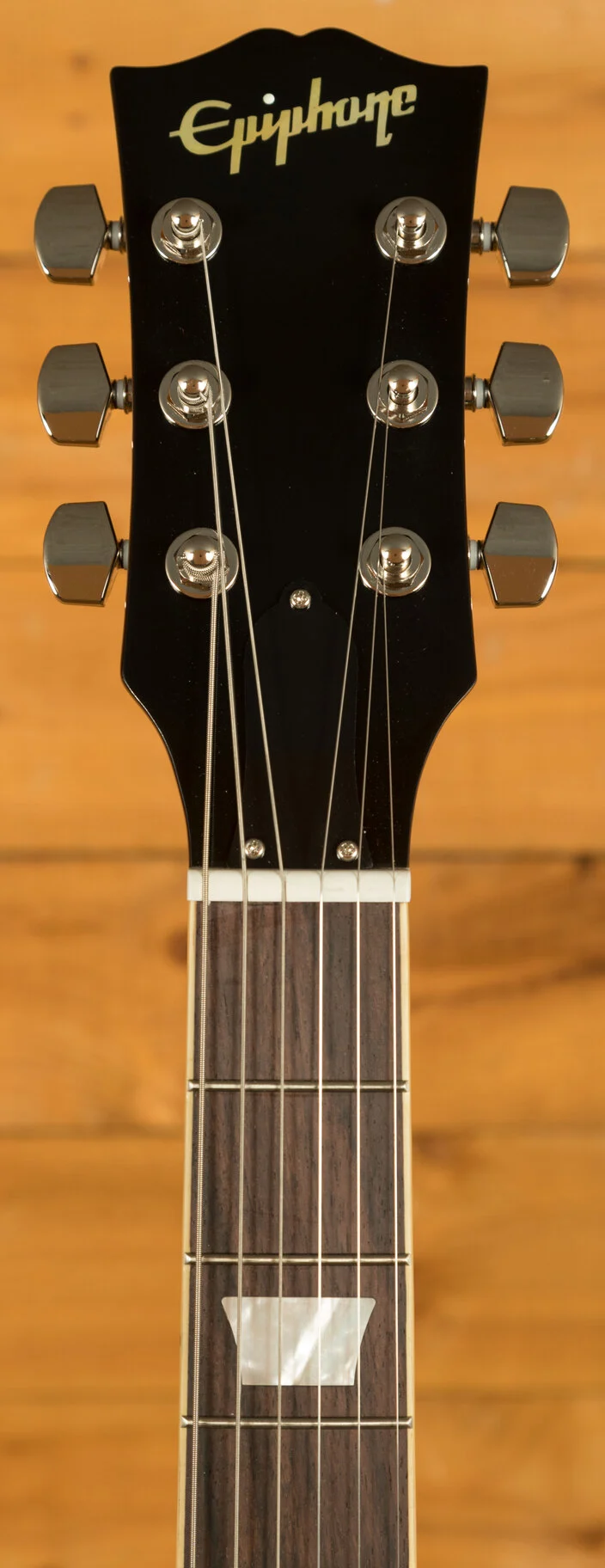 The one-piece Mahogany neck features a long tenon construction, which offers increased sustain and resonance across the whole guitar. The neck profile is an extremely close replica of Jeff’s actual guitar. Back in 2009, the Gibson Custom shop team scanned every inch of Jeff’s original guitar. Thanks to this scan data, Epiphone have perfectly recreated the shape and overall feel of Jeff’s guitar. This guitar also features an Indian Rosewood fingerboard, 22 frets, a Graph Tech nut, Aged Mother of Perl Trapezoid inlay, a 43mm nut width, and a Gibson open book headstock with Schaller M6 90 tuning machines.