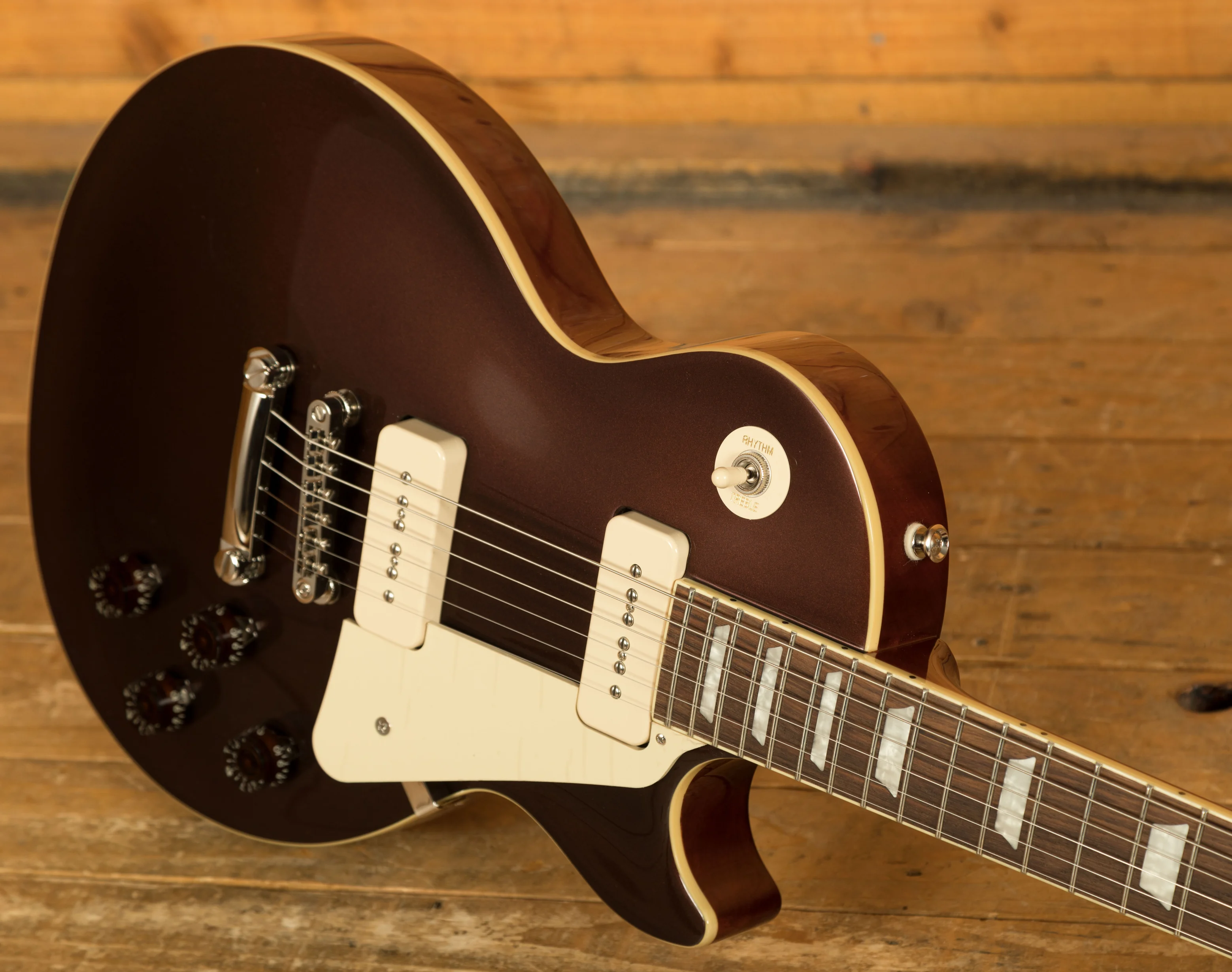 The Epiphone Joe Bonamassa 1955 Les Paul Standard brings the magic of this truly legendary instrument to the masses! It features a resonant Mahogany body topped with a period correct Plain Grain Maple top/cap. Complete with a rare Copper Iridescent finish it beautifully replicates the unique visuals of Joes rare instrument. From a distance, the finish appears dark brown, but as you move closer, the gold flak becomes much more apparent.