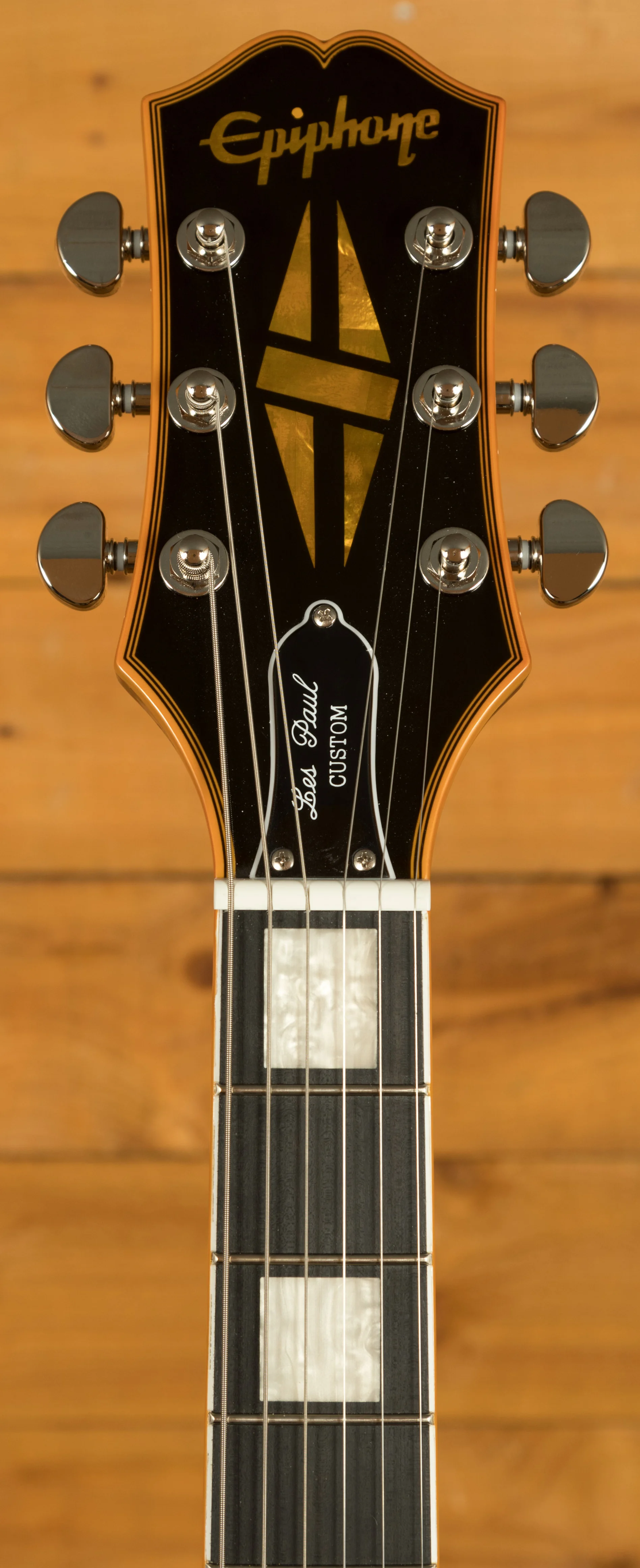 For pickups, the Les Paul Custom is equipped with a pair of Epiphone Probucker Custom humbuckers; based on Gibson's Custombuckers, these pickups deliver a versatile range of PAF-inspired tones. These pickups are complemented by CTS potentiometers, allowing for precise control over your volume and tone settings. The guitar's hardware includes a LockTone Tune-O-Matic bridge with a LockTone stopbar for solid intonation and sustain, and Grover Rotomatic tuning machines for reliable and accurate tuning. The 1-11/16" Graph Tech further enhances tuning stability by preventing the strings from getting caught on it and later slipping.