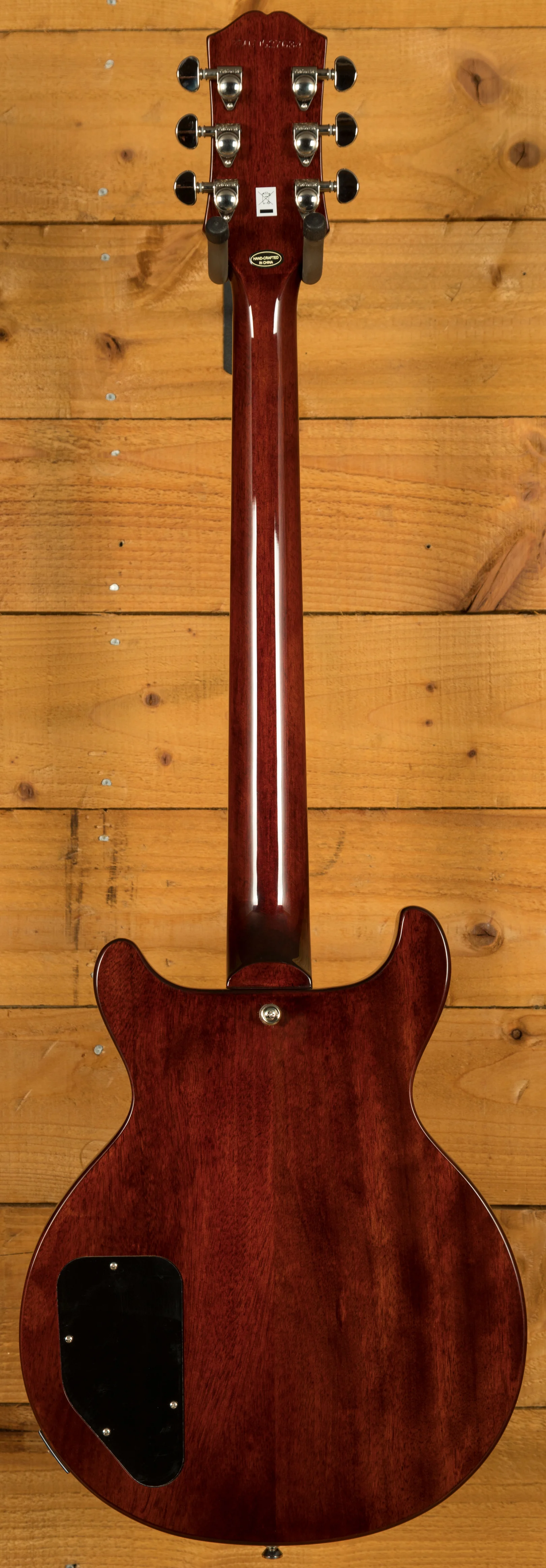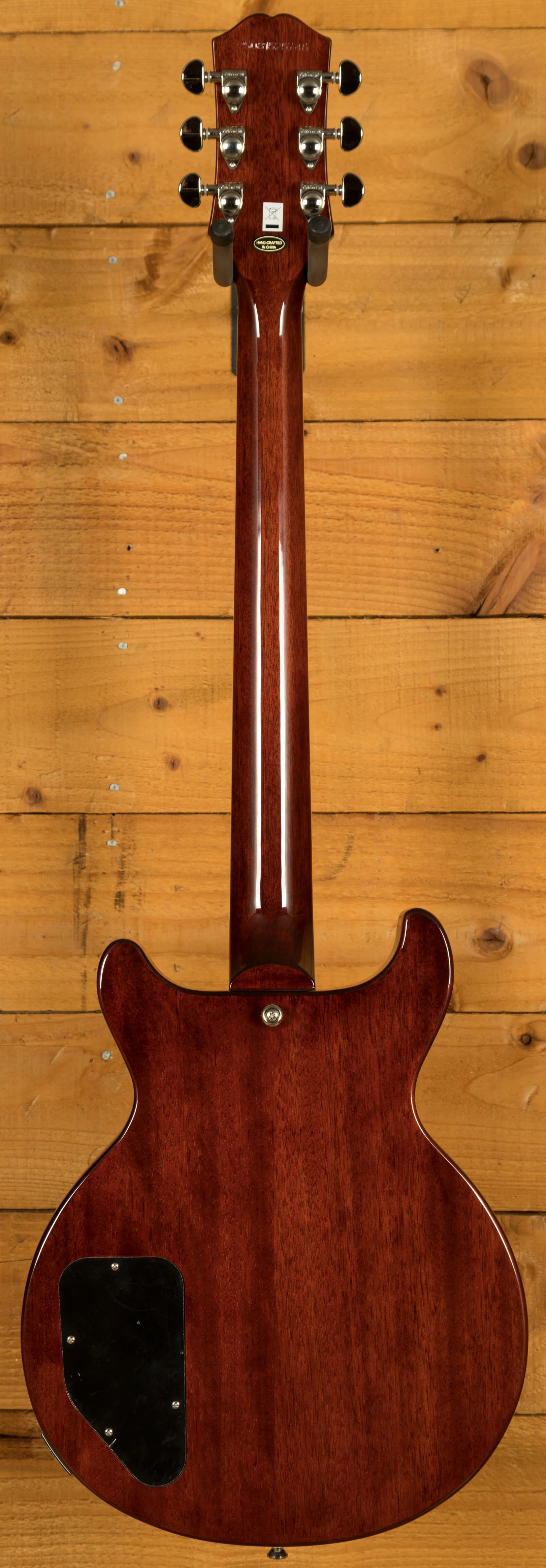 The electronics are also different from what you’ll find on most Les Paul Specials. Instead of the usual P-90 single-coil pickups, the Les Paul Special Double Cut Figured is fitted with a pair of Epiphone’s ProBucker humbuckers. It features a ProBucker 2 in the neck position and a slightly hotter ProBucker 3 in the bridge for blistering solos. Both pickups are wired to individual volume and tone controls, and a three-way toggle switch provides excellent tonal control and versatility. On this model you also have a set of Grover Rotomatic tuners, and a LockTone Tune-O-Matic bridge and stop bar tailpiece.