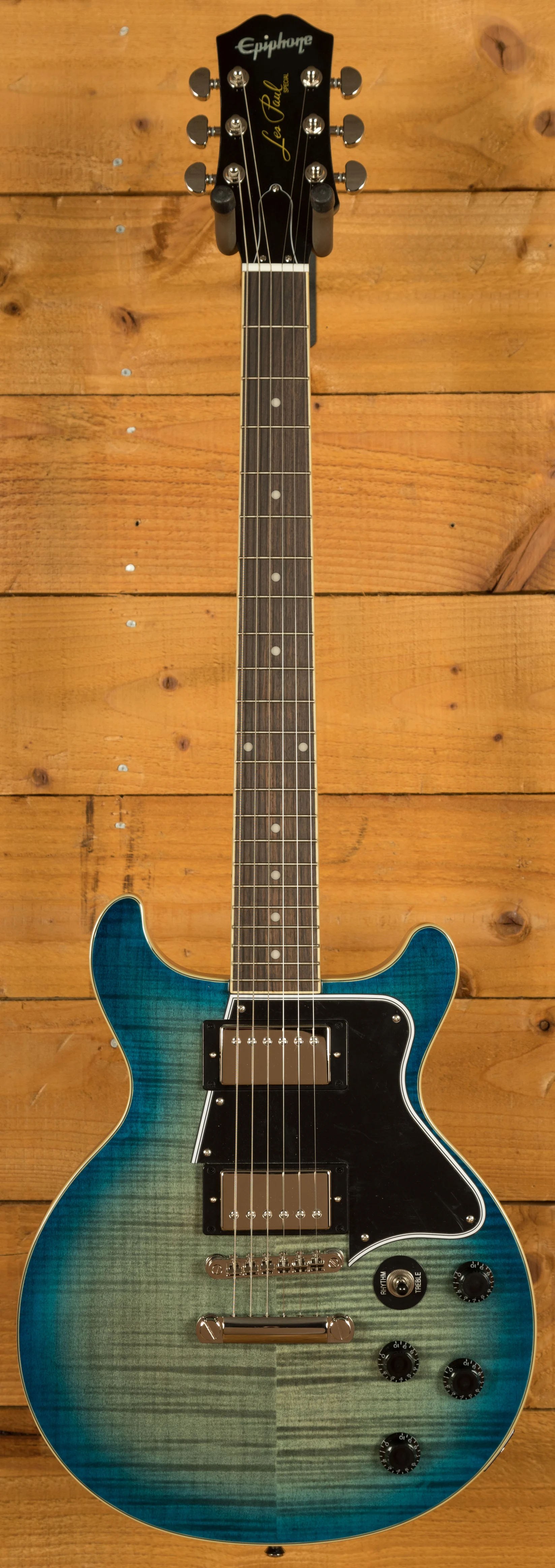 The electronics are also different from what you’ll find on most Les Paul Specials. Instead of the usual P-90 single-coil pickups, the Les Paul Special Double Cut Figured is fitted with a pair of Epiphone’s ProBucker humbuckers. It features a ProBucker 2 in the neck position and a slightly hotter ProBucker 3 in the bridge for blistering solos. Both pickups are wired to individual volume and tone controls, and a three-way toggle switch provides excellent tonal control and versatility. On this model you also have a set of Grover Rotomatic tuners, and a LockTone Tune-O-Matic bridge and stop bar tailpiece.