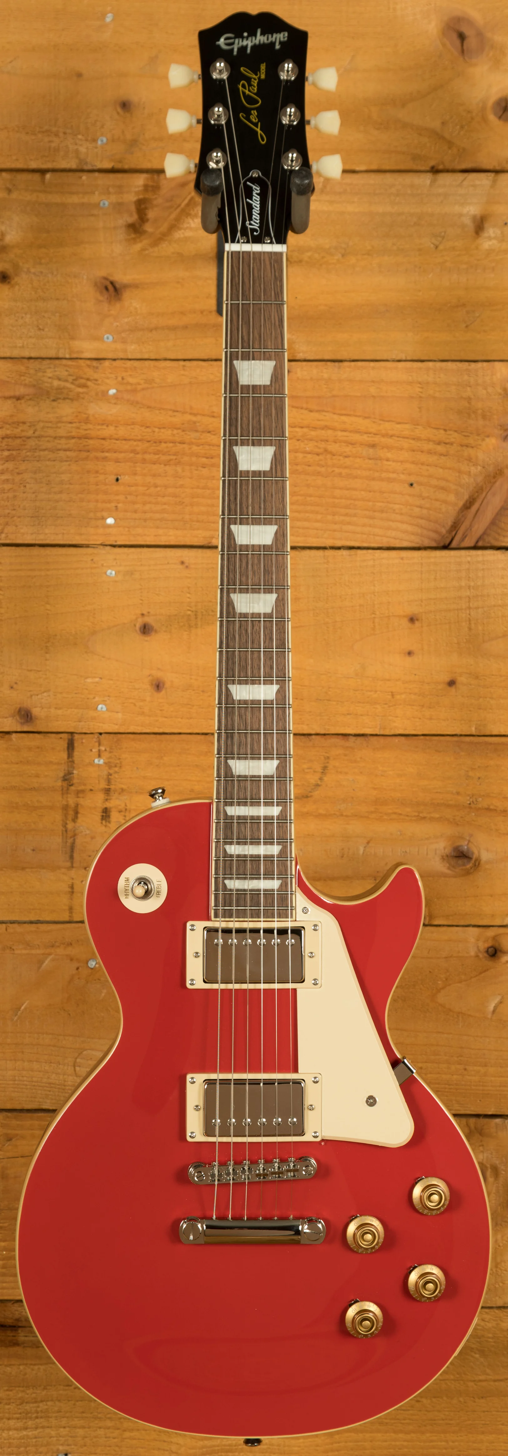 For pickups, the Les Paul Standard 50s is equipped with a ProBucker 1 in the neck position and a ProBucker 2 in the bridge, delivering a versatile range of vintage-inspired tones. These pickups are complemented by CTS potentiometers, allowing for precise control over your volume and tone settings. The guitar's hardware includes a LockTone ABR Tune-o-Matic bridge with a StopTail for solid intonation and sustain, and Epiphone Vintage Deluxe tuning machines for reliable and accurate tuning.