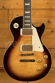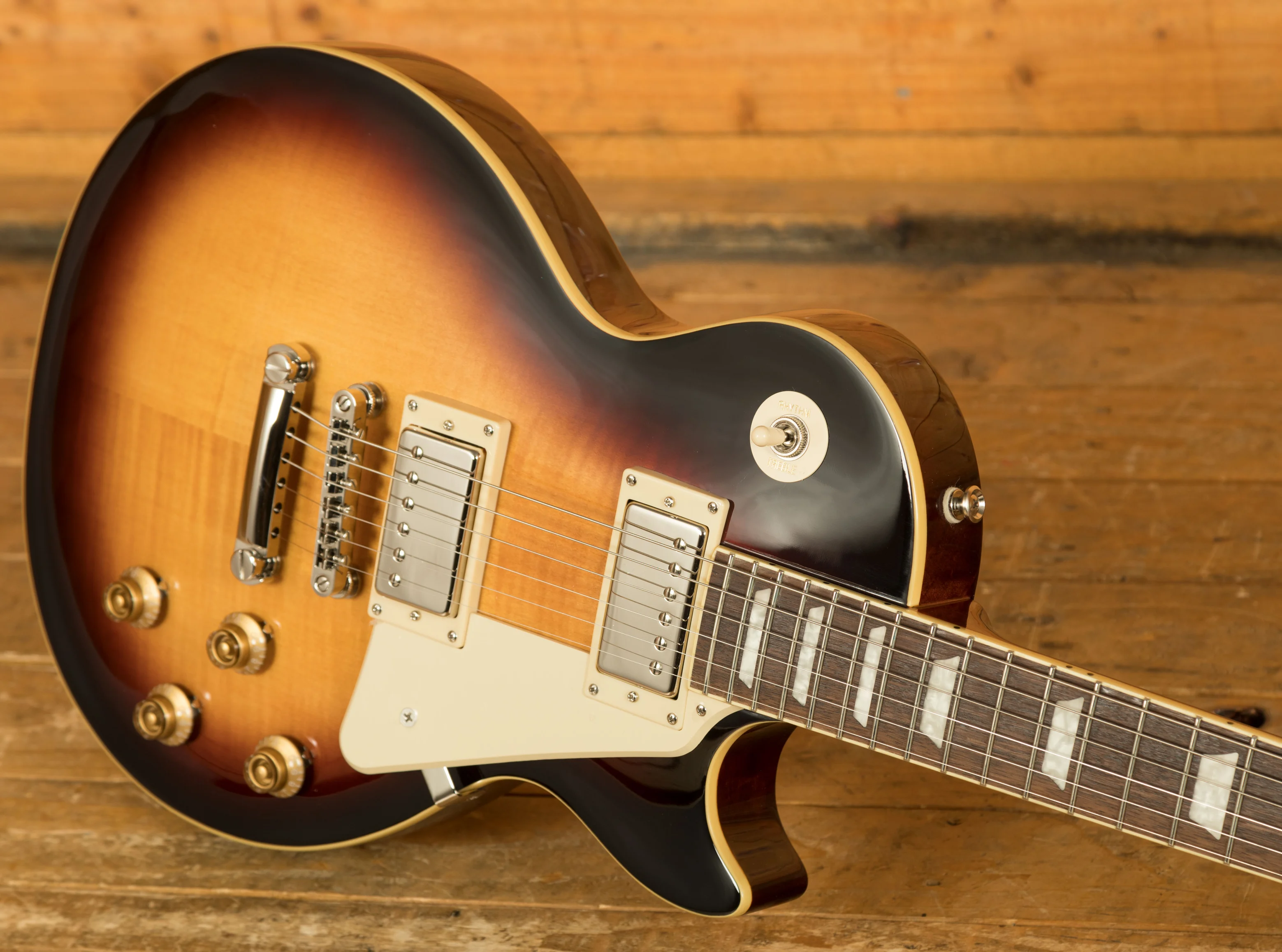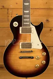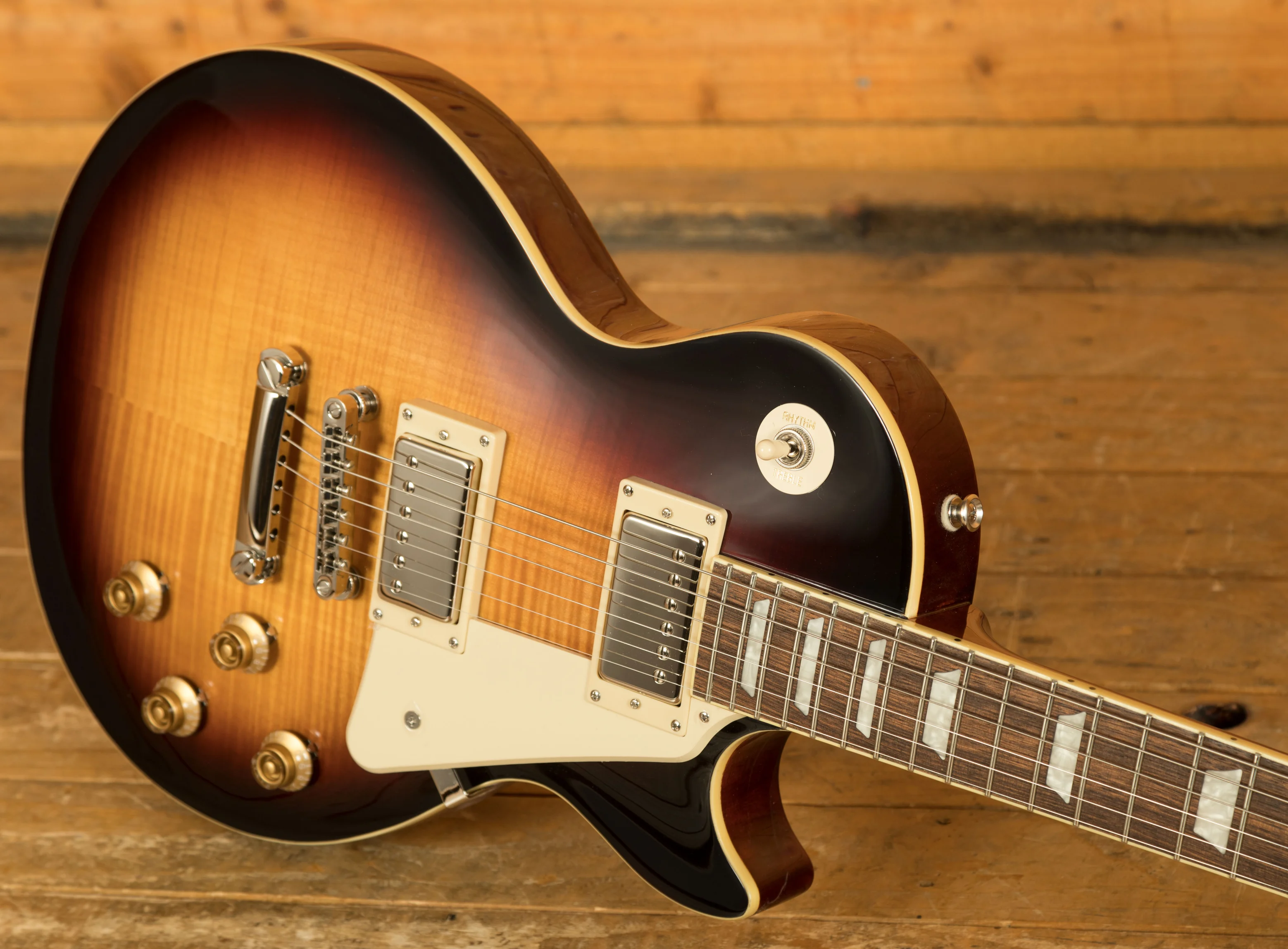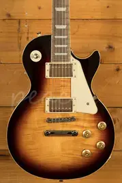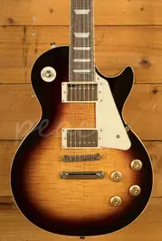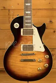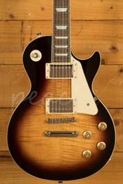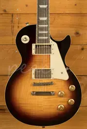 Step into the golden age of rock 'n' roll with the Epiphone Les Paul Standard 50s Figured in stunning Bourbon Burst—a modern tribute to the legendary 1950s Les Paul electric guitars that defined generations of music. Part of Epiphone's Inspired by Gibson Collection, this figured top beauty delivers the warm, sustaining humbucker growl and buttery playability that made the original Les Paul a studio and stage staple. Whether you're channeling Slash's solos, Jimmy Page's riffs, or crafting your own bluesy bends, this guitar's AAA flame maple veneer top over a solid mahogany body ensures rich, resonant tones that sing through any amp.