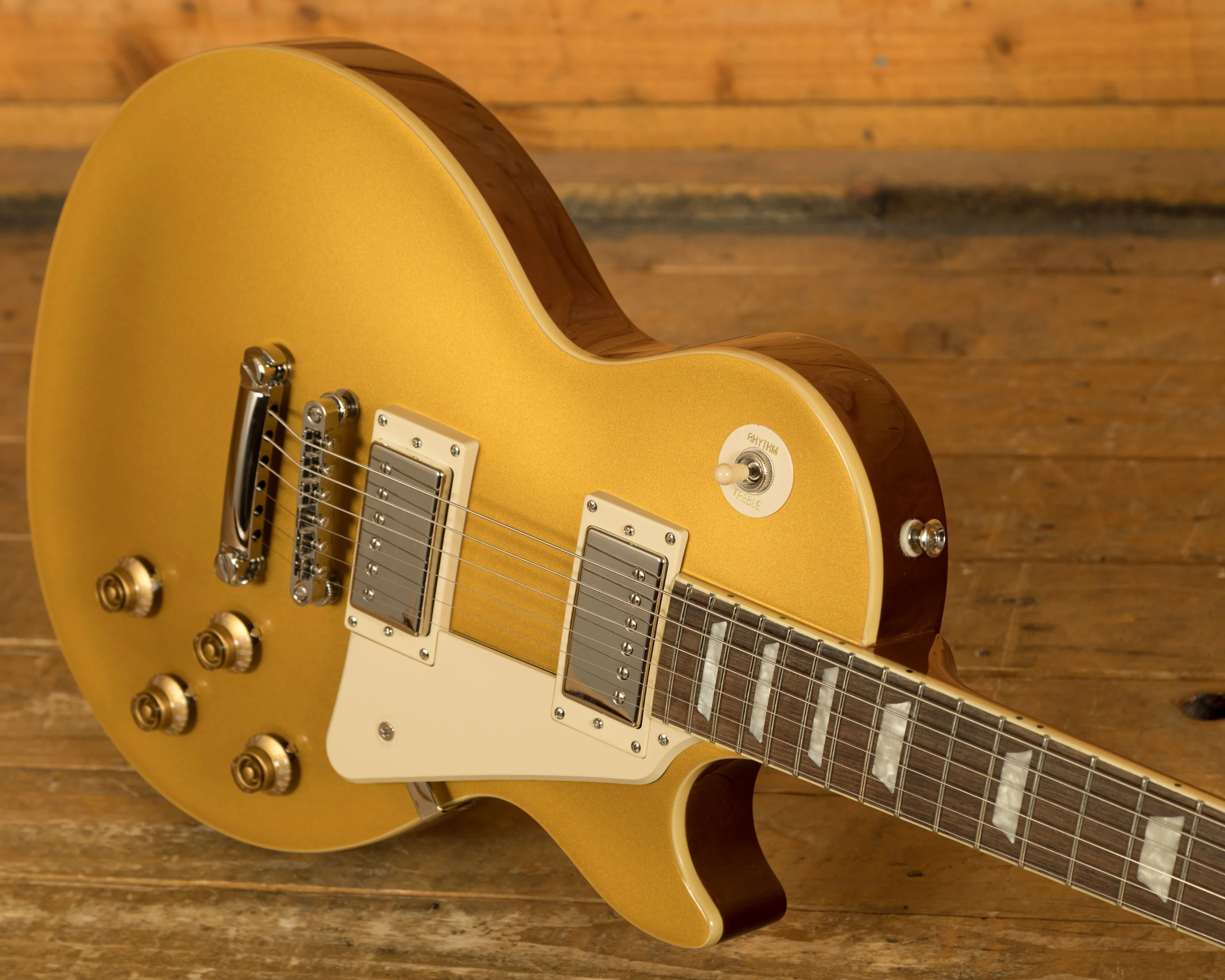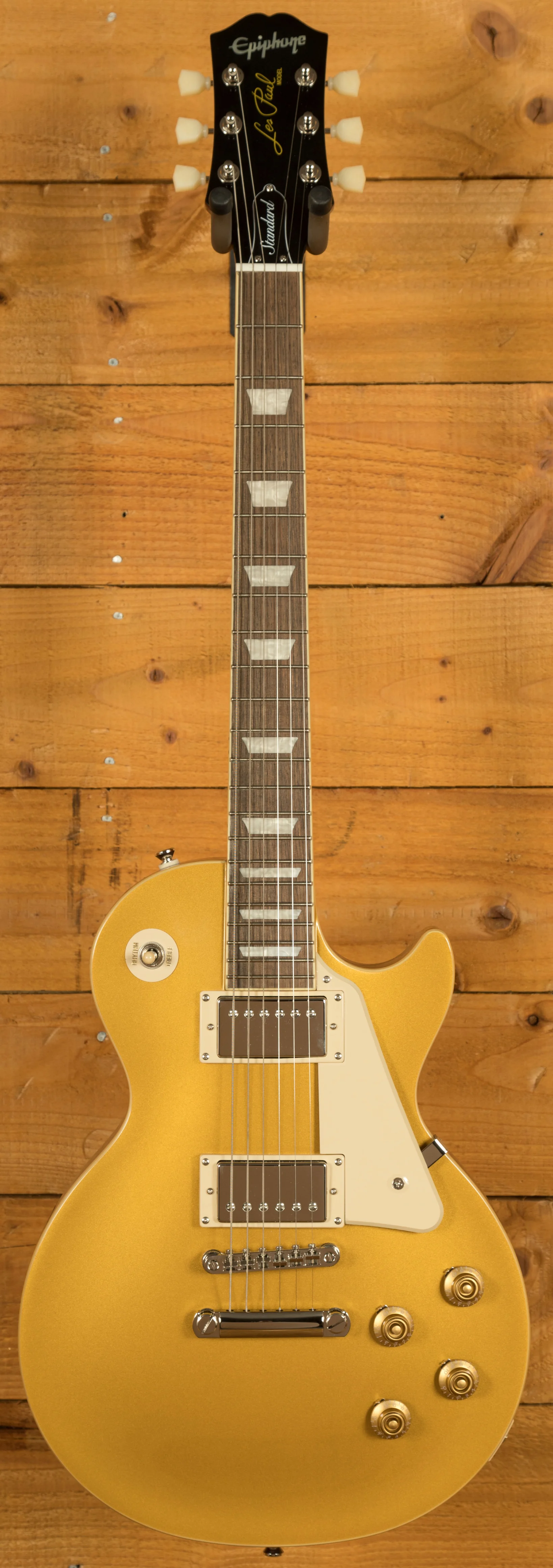 For pickups, the Les Paul Standard 50s is equipped with a ProBucker 1 in the neck position and a ProBucker 2 in the bridge, delivering a versatile range of vintage-inspired tones. These pickups are complemented by CTS potentiometers, allowing for precise control over your volume and tone settings. The guitar's hardware includes a LockTone ABR Tune-o-Matic bridge with a StopTail for solid intonation and sustain, and Epiphone Vintage Deluxe tuning machines for reliable and accurate tuning.