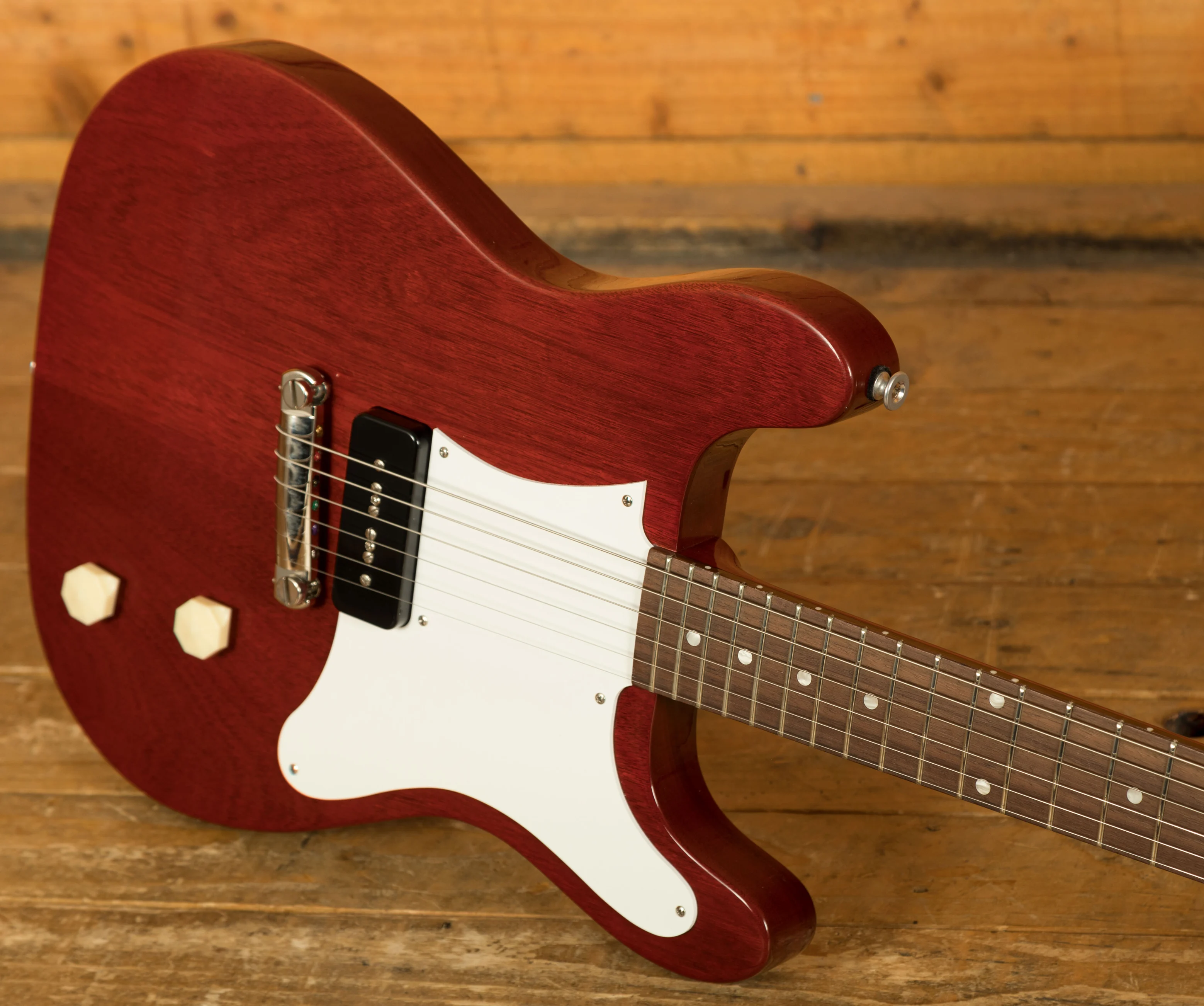 The Epiphone Coronet ensures optimal performance and stability with its glued-in mahogany neck boasting a SlimTaper profile. This neck profile strikes the perfect balance between comfort and speed, allowing you to effortlessly navigate the fretboard with precision. The Graph Tech nut enhances sustain and resonance, while the 1 volume and 1 tone control offer precise tonal shaping to suit your unique style.