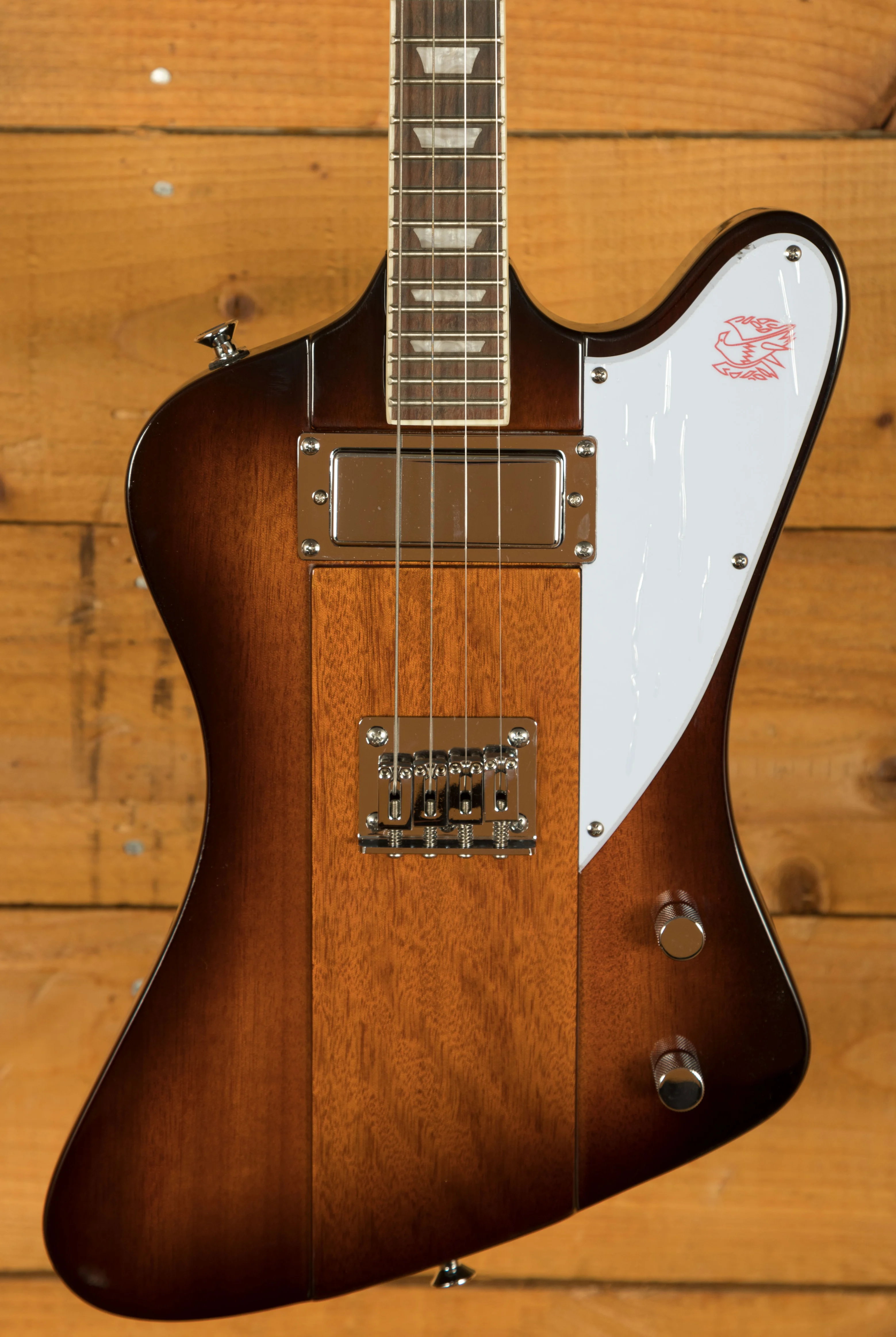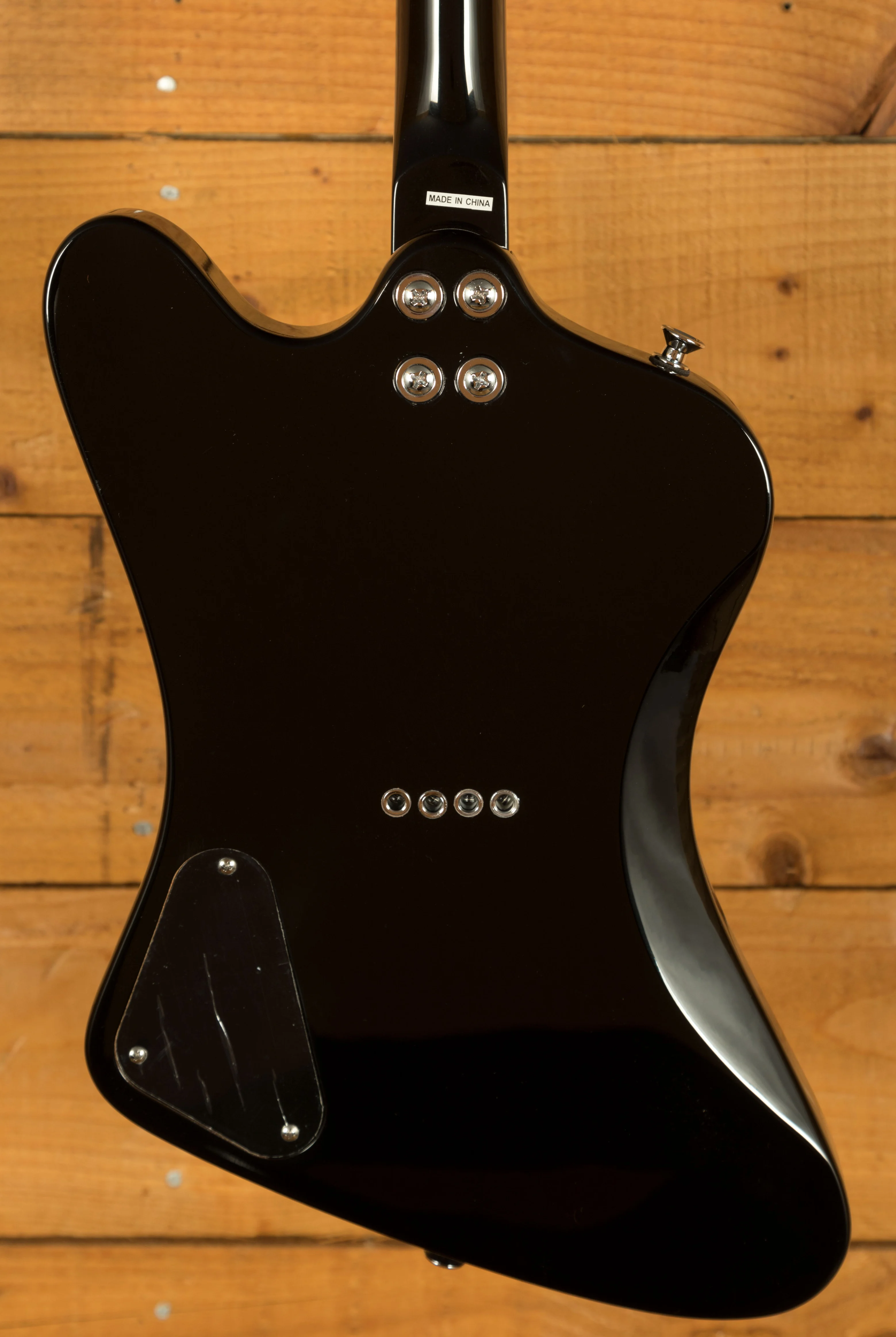 The Epiphone Firebird pickup delivers a focused and articulate sound, well-suited to a variety of musical styles. Paired with master volume and tone controls, players can shape their sound quickly and precisely. The top-mounted bridge with a string-through-body design improves tuning stability and sustain, allowing for more consistent performance. The reverse Firebird-style headstock houses four Grover Mini Rotomatic tuners, known for their precision and reliability, ensuring accurate tuning during both practice and performance.