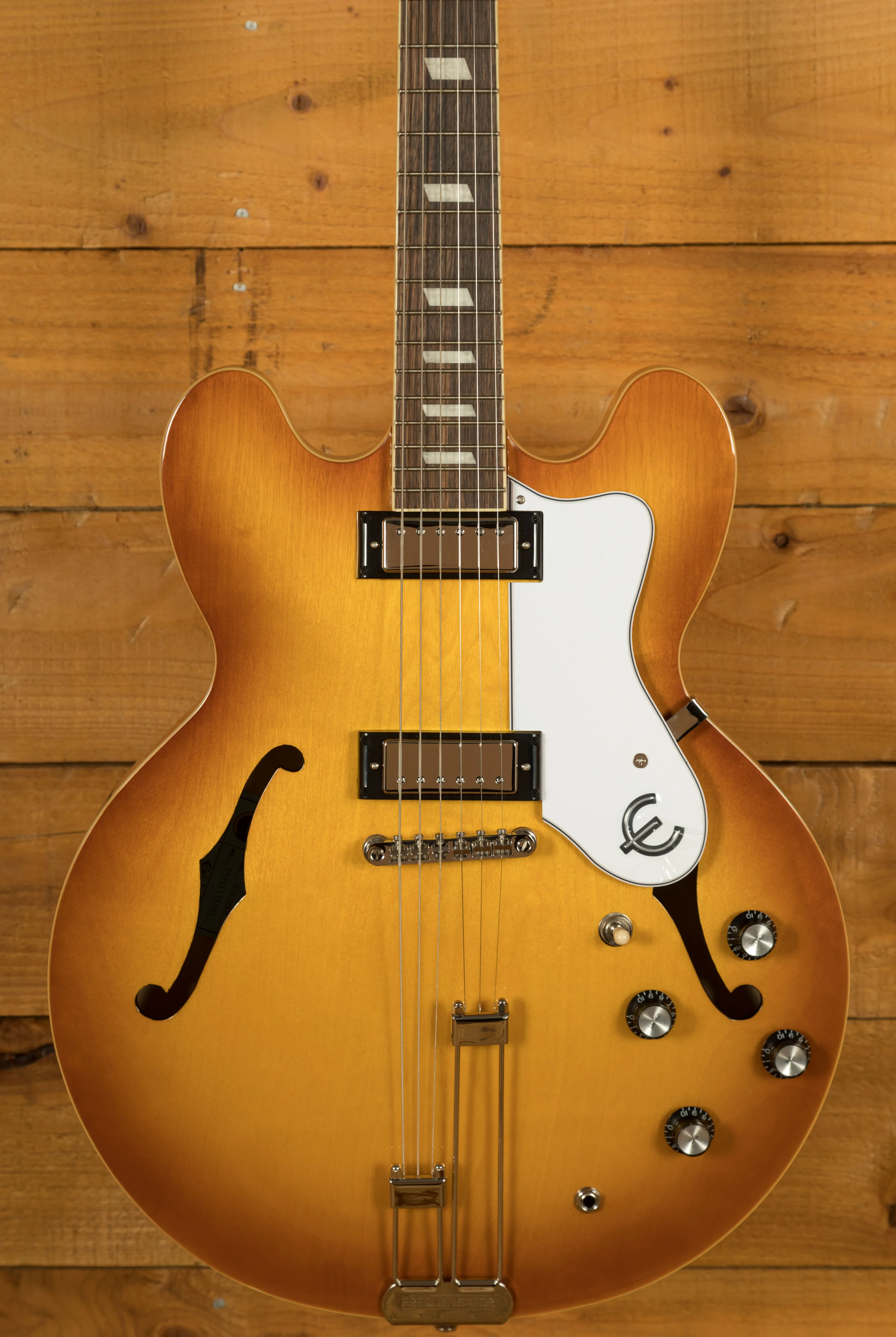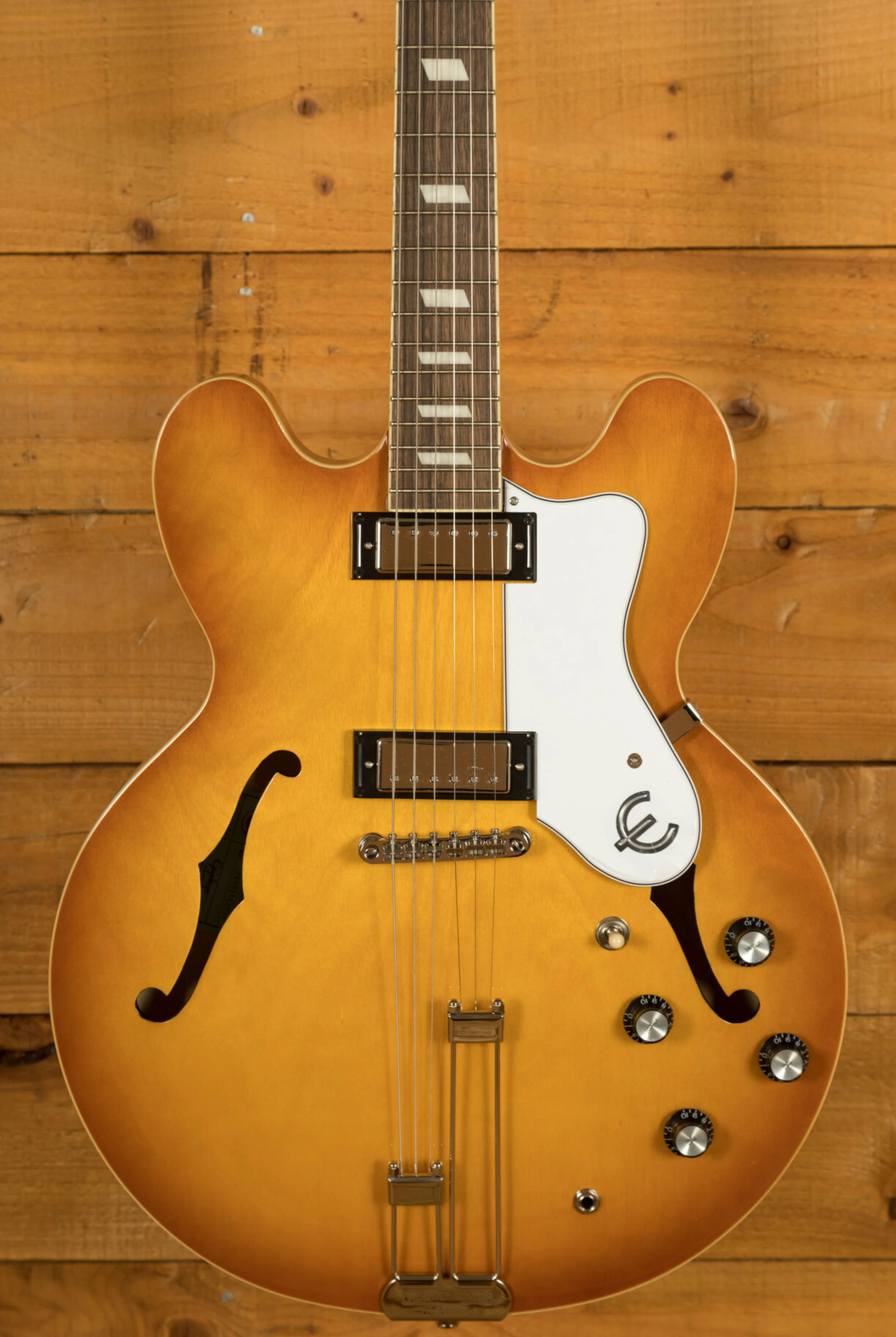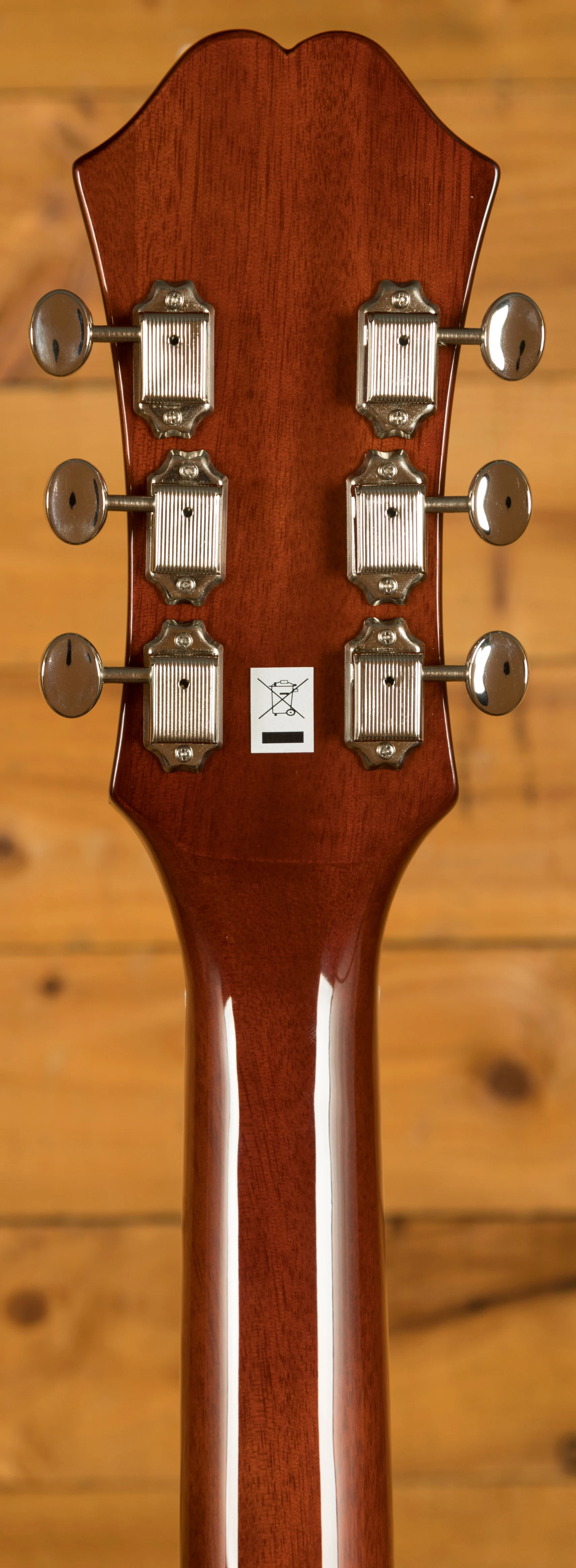 Crafted with meticulous attention to detail, the Epiphone Riviera features a captivating layered maple top, back, and sides, exuding elegance and ensuring superior resonance. Its maple centreblock enhances sustain and eliminates unwanted feedback, granting you complete control over your sound. The instrument proudly dons a stunning 3-layer pickguard adorned with the iconic metal Epiphone "E," serving as a testament to its heritage and craftsmanship. To further elevate its performance, the Riviera is equipped with Epiphone's innovative LockTone Tune-O-Matic adjustable bridge and Frequensator tailpiece, guaranteeing exceptional intonation and optimal string tension.