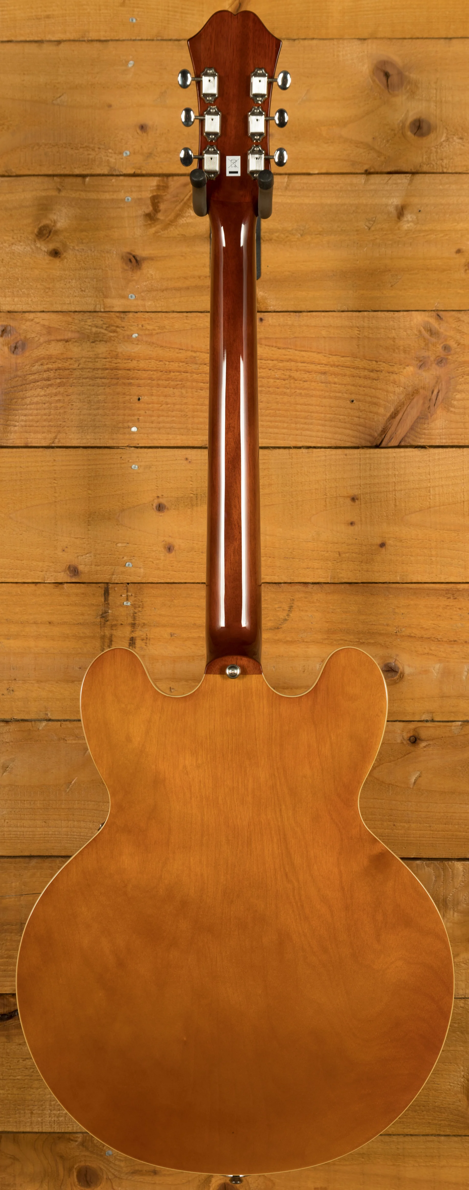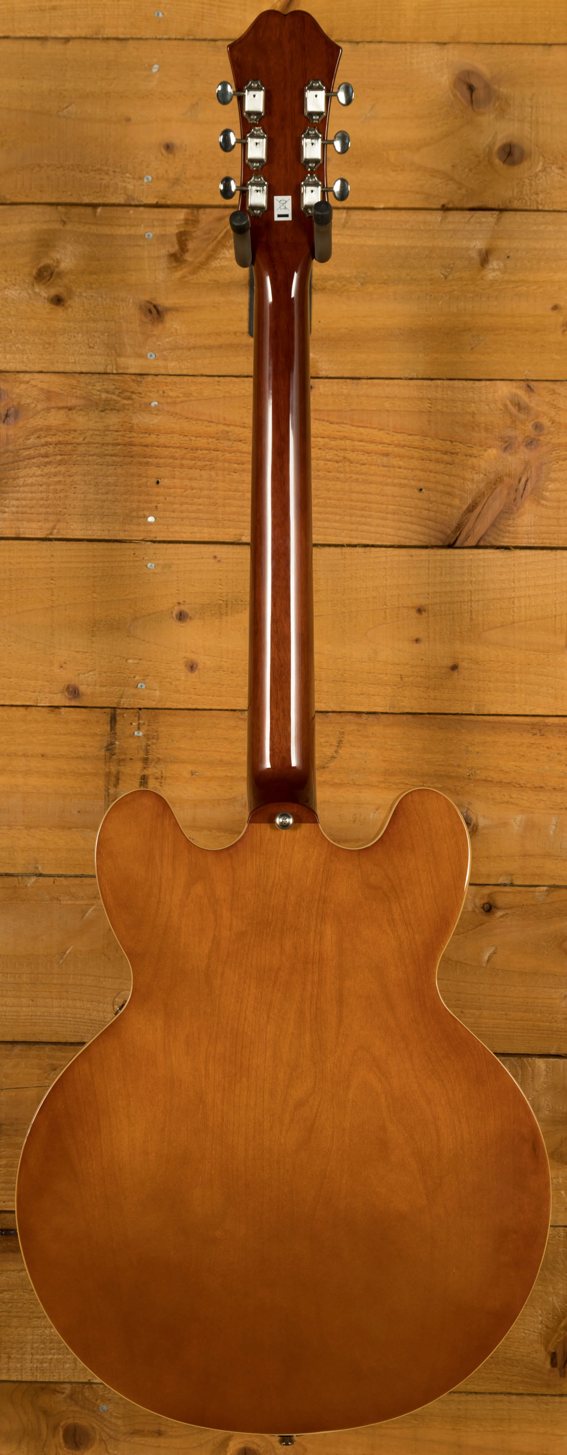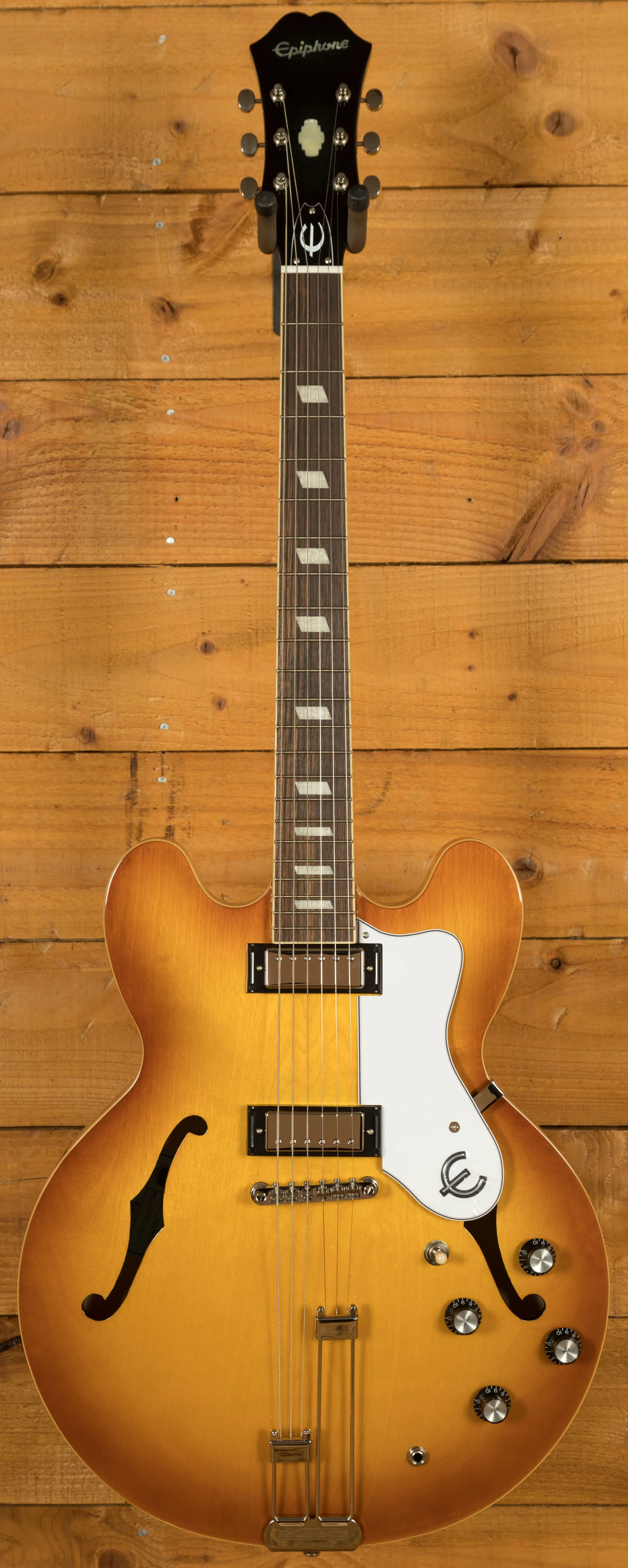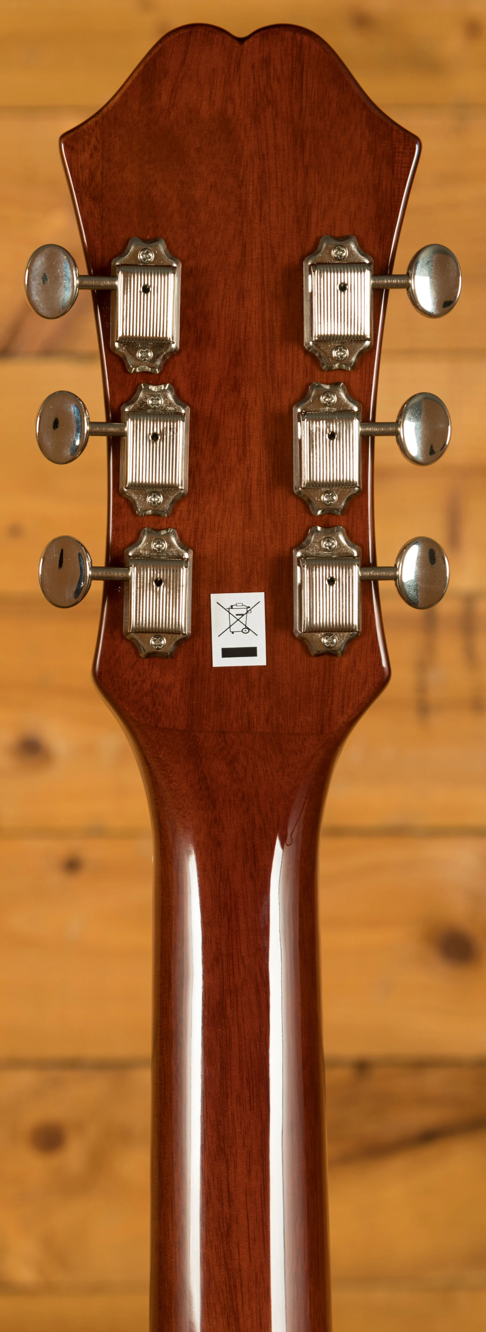 Crafted with meticulous attention to detail, the Epiphone Riviera features a captivating layered maple top, back, and sides, exuding elegance and ensuring superior resonance. Its maple centreblock enhances sustain and eliminates unwanted feedback, granting you complete control over your sound. The instrument proudly dons a stunning 3-layer pickguard adorned with the iconic metal Epiphone "E," serving as a testament to its heritage and craftsmanship. To further elevate its performance, the Riviera is equipped with Epiphone's innovative LockTone Tune-O-Matic adjustable bridge and Frequensator tailpiece, guaranteeing exceptional intonation and optimal string tension.