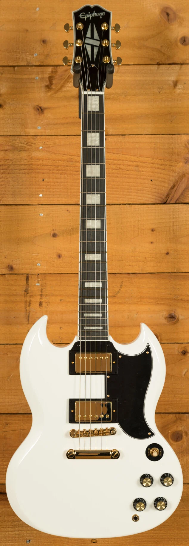 For pickups, the SG Custom is equipped with a pair of Epiphone Probucker Custom humbuckers, which deliver a versatile range of vintage-inspired tones. The guitar's hardware includes a LockTone ABR Tune-o-Matic bridge with a StopTail for solid intonation and sustain, and Grover Rotomatic tuning machines for reliable and accurate tuning.