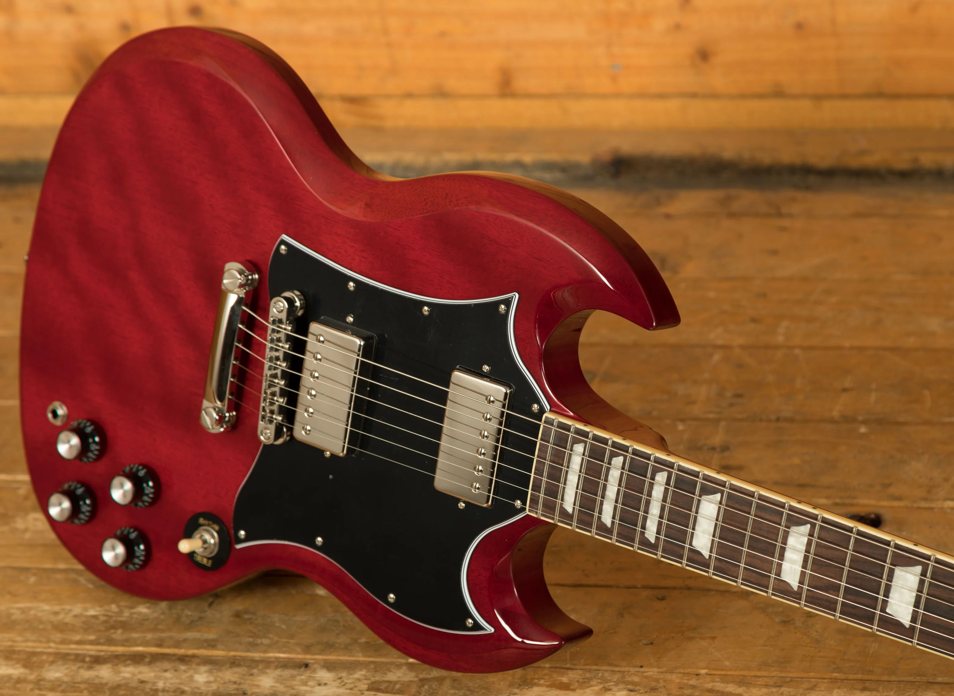 The Epiphone SG Standard is equipped with a pair of Epiphone’s acclaimed ProBucker humbucking pickups, delivering all the vintage-approved SG tones you could ask for. A ProBucker 2 humbucker sits in the neck position, while a slightly hotter ProBucker 3 is installed in the bridge. Each pickup has its own volume and tone controls, and a three-way toggle switch lets you use either pickup alone or blend them in any combination to suit your playing style and mood.