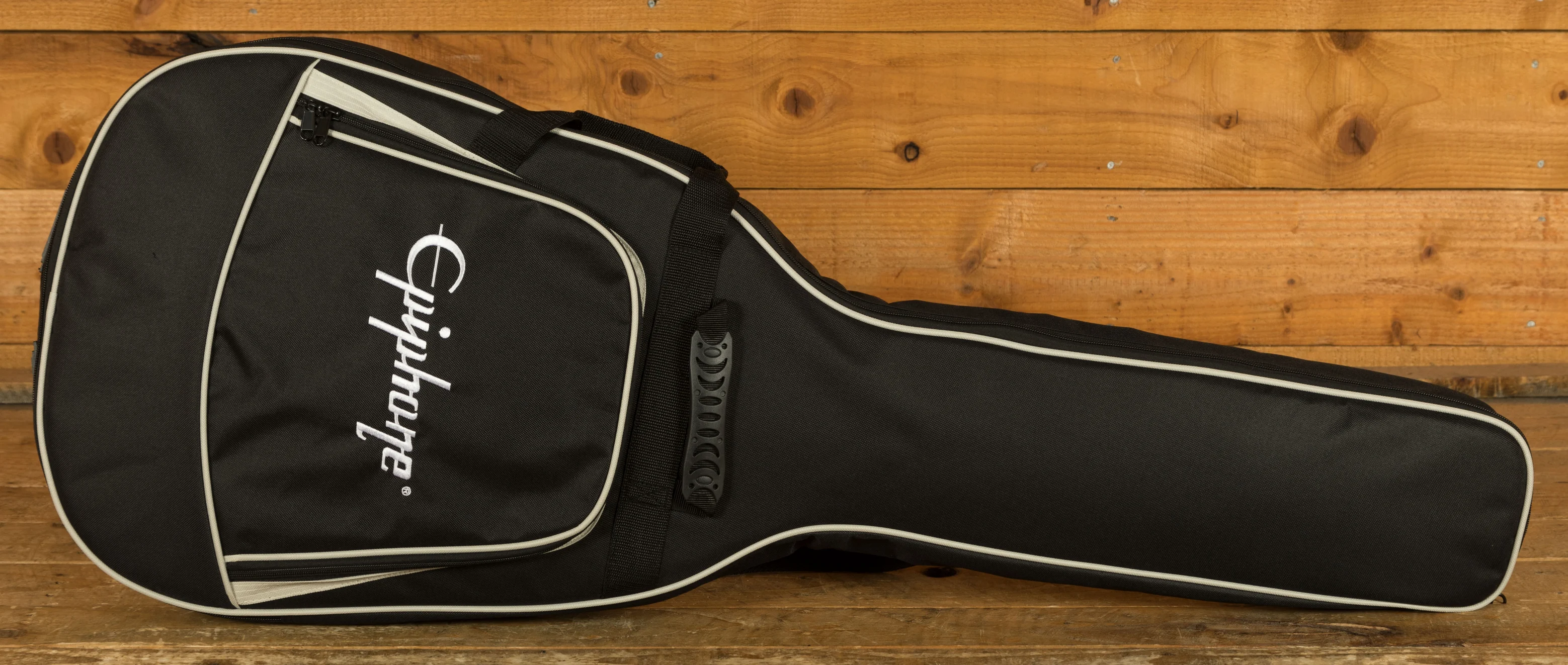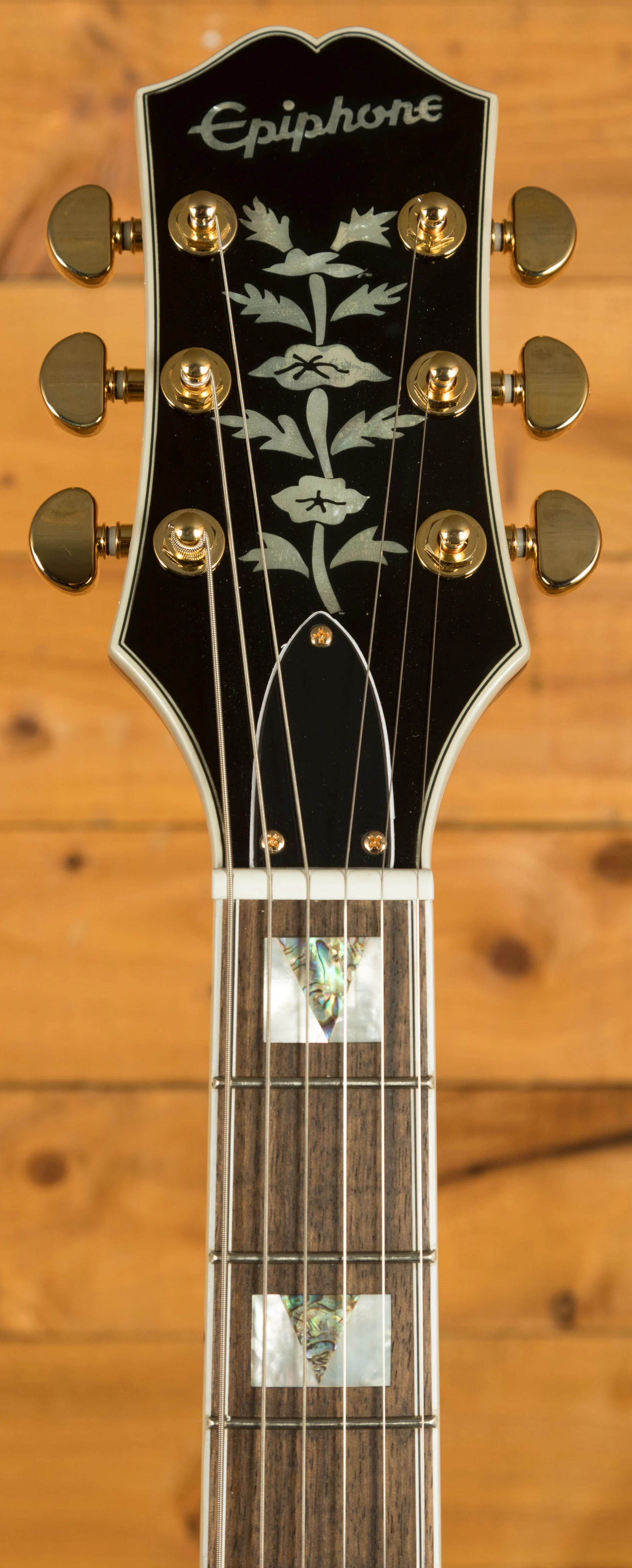 The 22-fret mahogany neck is shaped in a SlimTaper ‘60s "C" profile for a comfortable playing experience. The Indian laurel fingerboard includes block mother-of-pearl inlays with abalone triangles, offering both visual appeal and smooth playability. A Graph Tech nut ensures precise string spacing and tuning stability, while the 24.75-inch scale length contributes to a familiar, responsive feel. The bound headstock features a historic Epiphone logo and a mother-of-pearl tree of life inlay, highlighting the guitar's vintage-inspired aesthetics.
