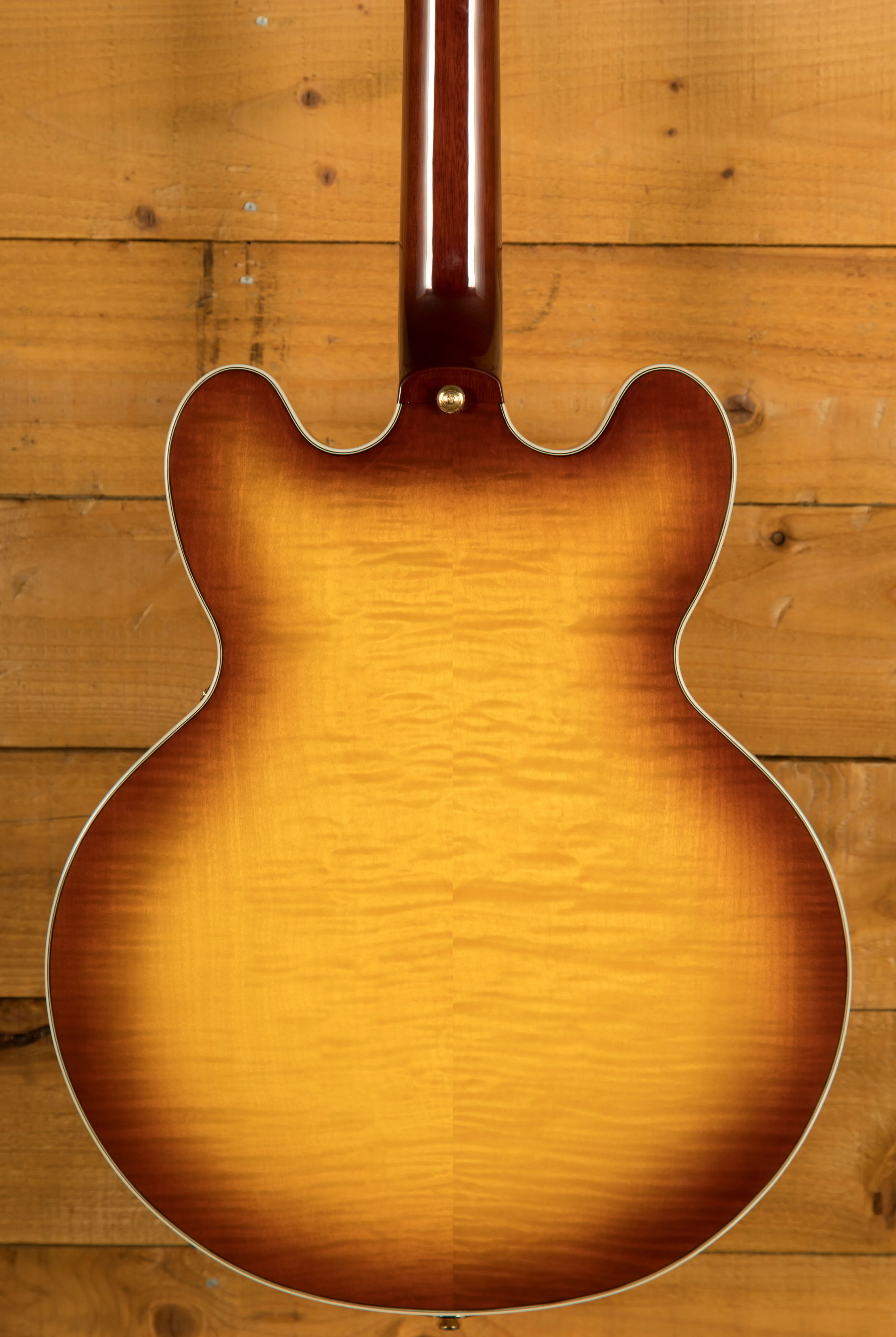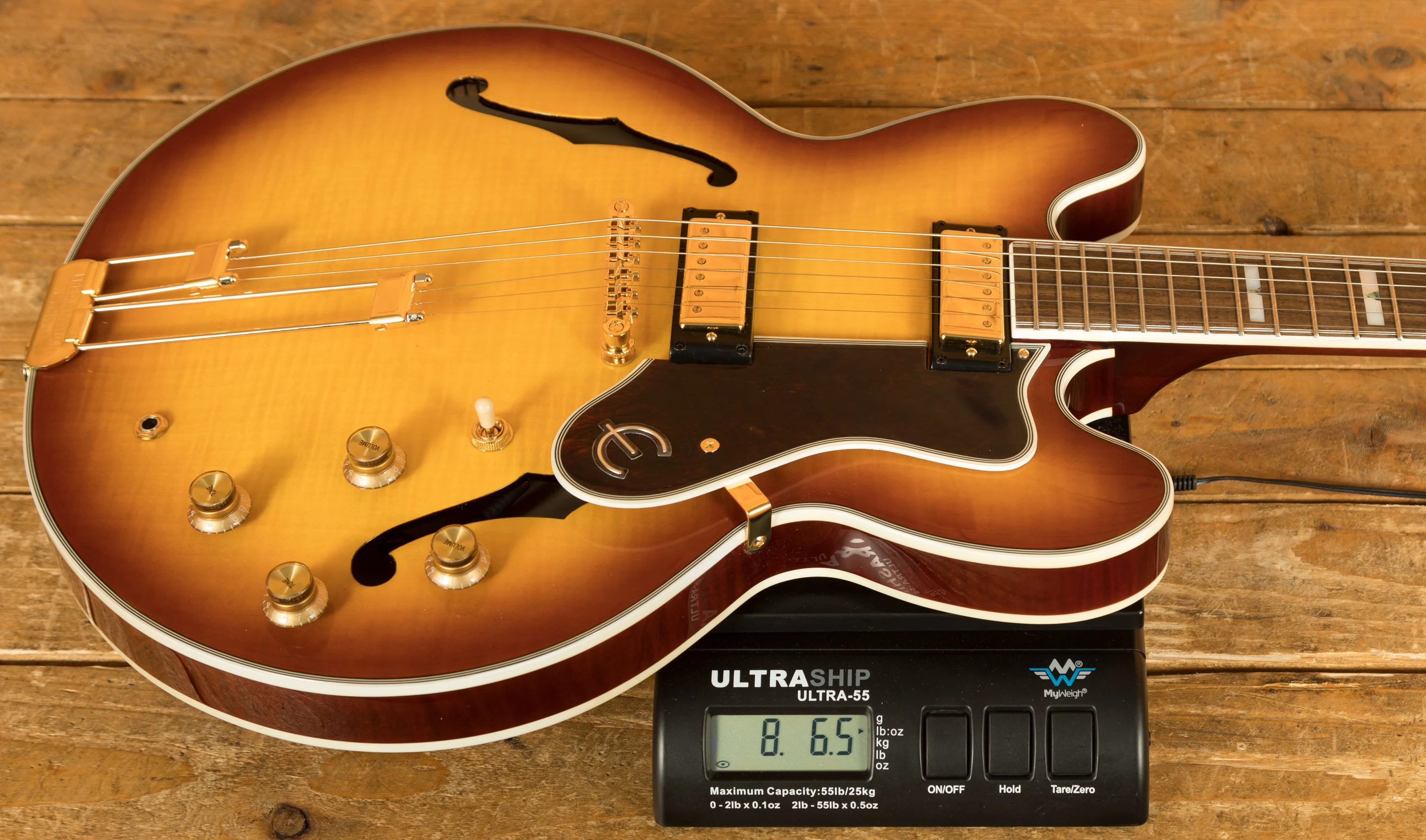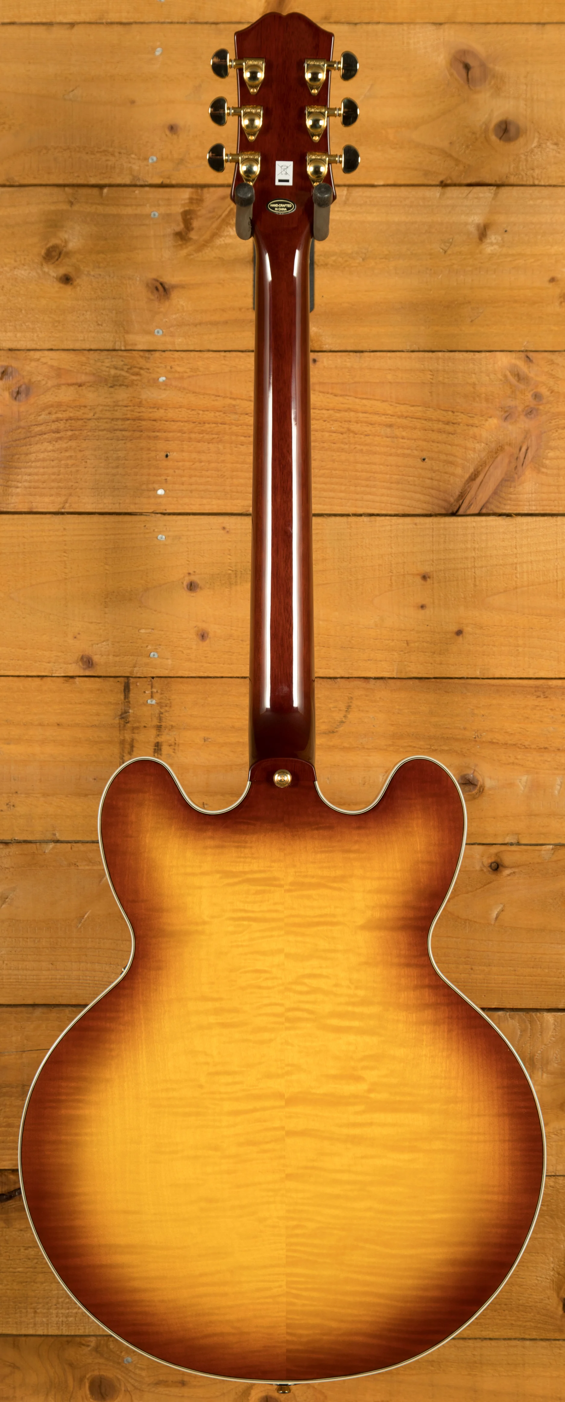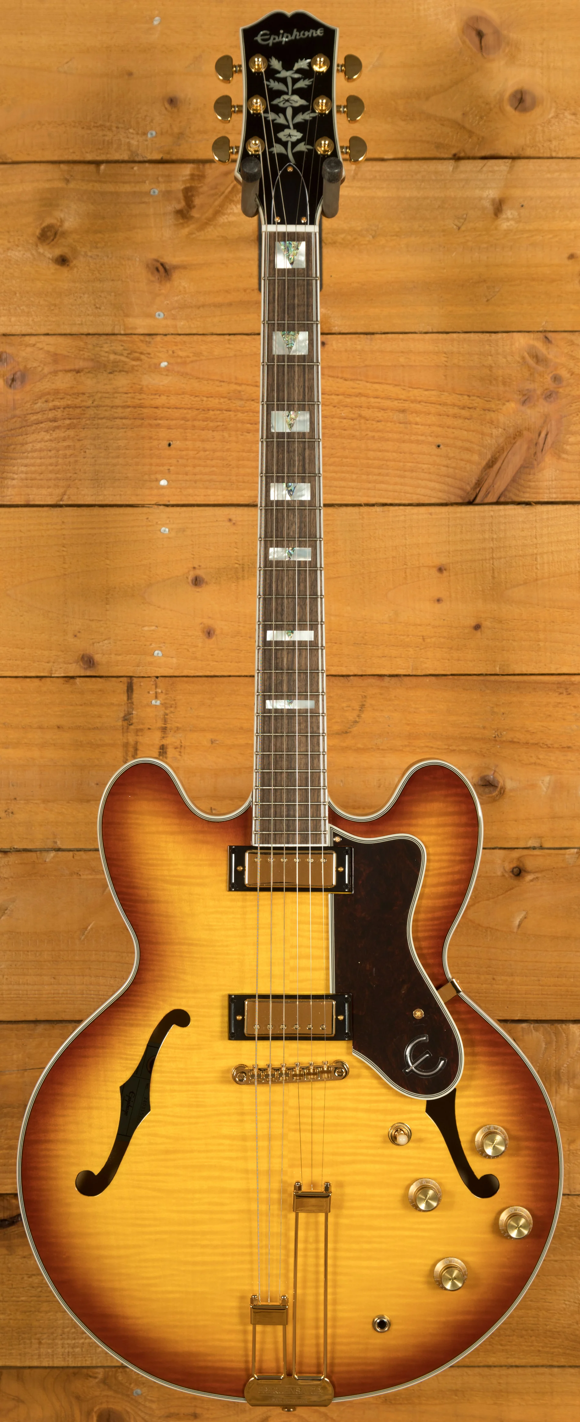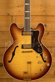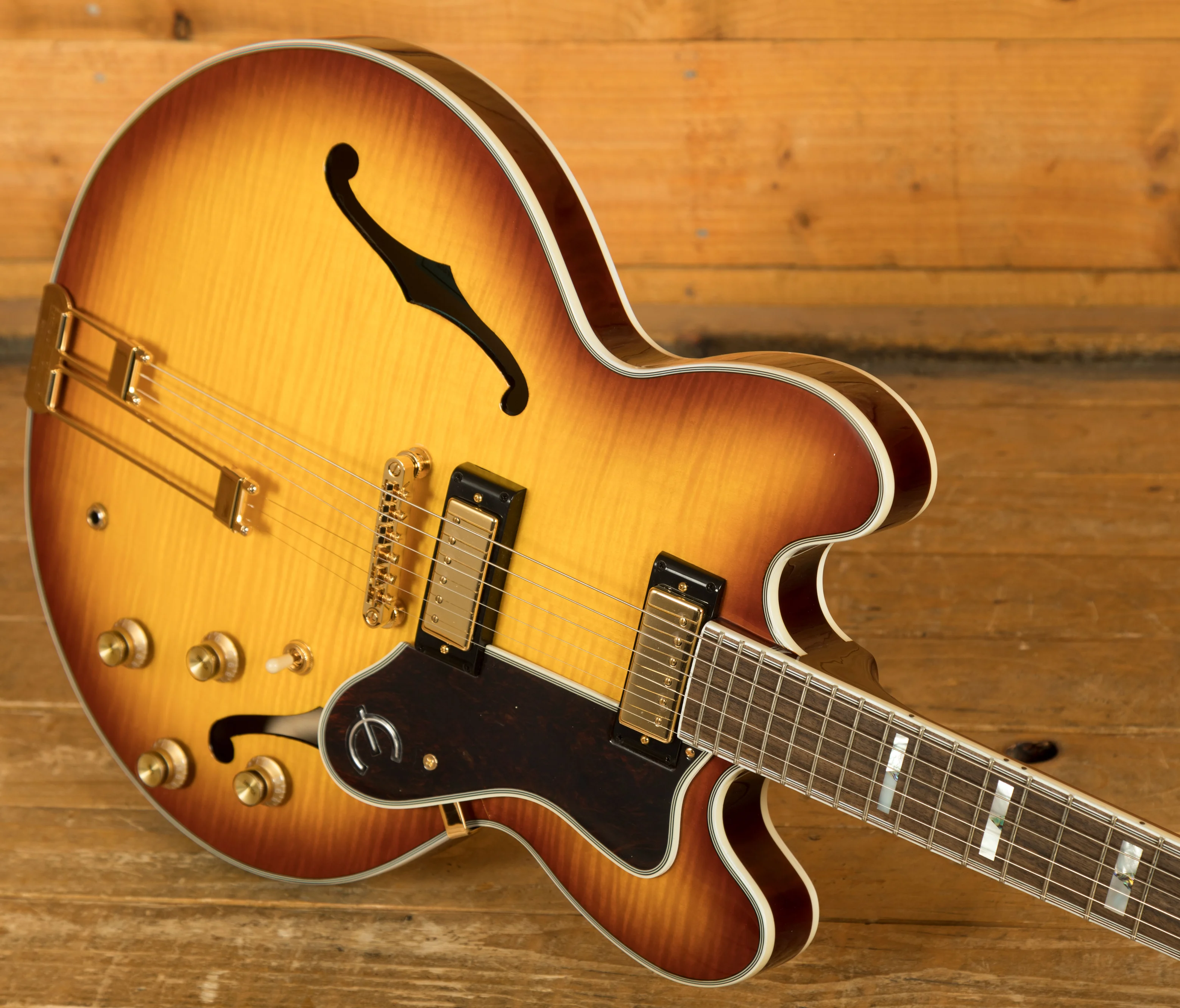 Equipped with Epiphone ProBucker mini humbuckers, the Sheraton Figured delivers a dynamic tonal range with balanced clarity and warmth. These pickups excel in clean tones while providing rich sustain and articulation when overdriven, making them ideal for blues, jazz, rock, and more. The guitar's electronics include two volume and two tone controls, along with a three-way toggle switch for versatile pickup selection.