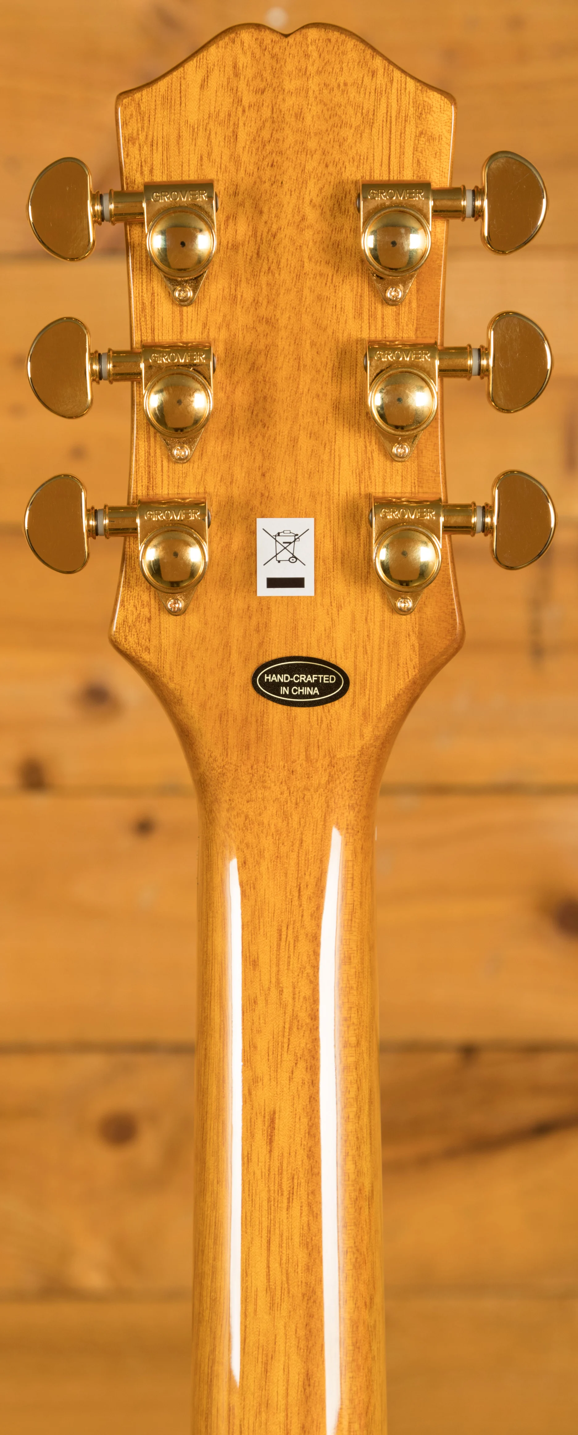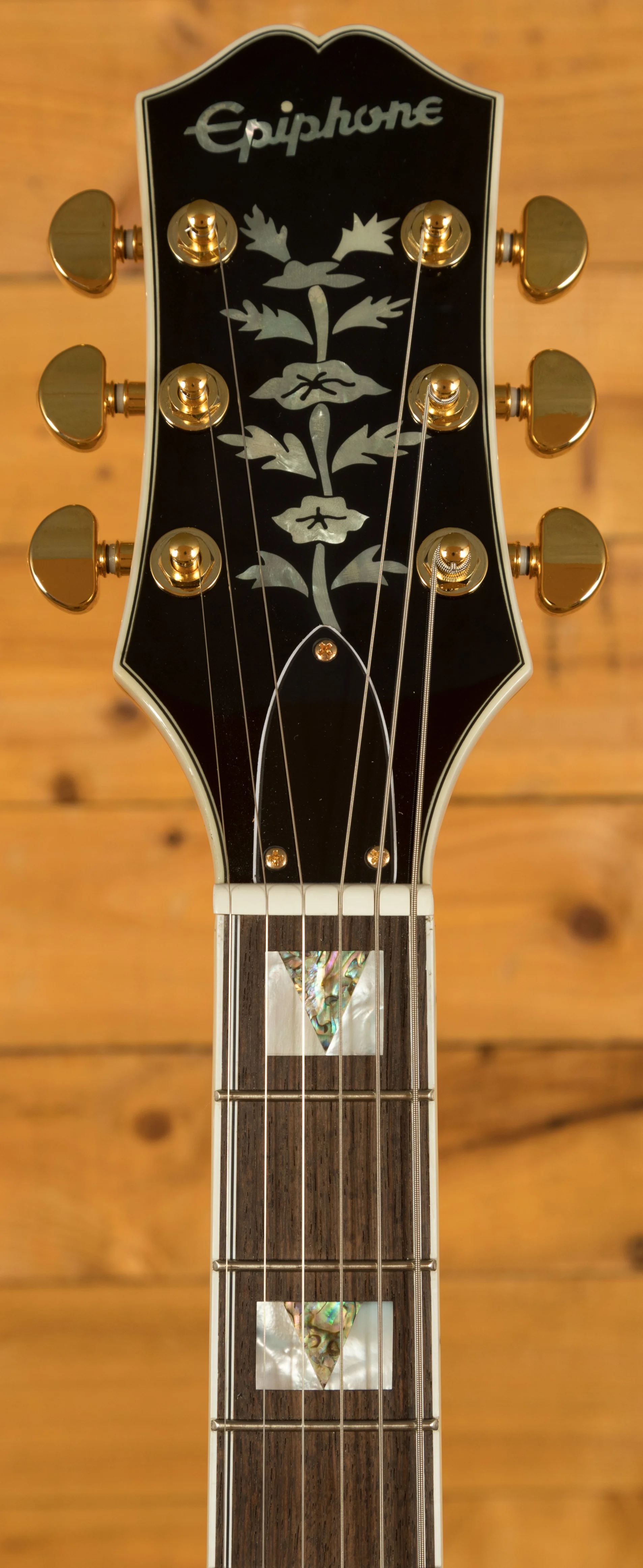 As you caress the neck of the Sheraton, you'll immediately notice the smoothness and playability it offers. Constructed from high-quality mahogany, this 22-fret neck is a testament to Epiphone's commitment to excellence. The Indian laurel fretboard is adorned with exquisite block mother of pearl inlays, complemented by abalone triangle accents that add a touch of sophistication to this already stunning instrument. Additionally, the bound headstock proudly displays the historic Epiphone logo, while the intricate tree of life in mother of pearl serves as a symbol of the Sheraton's everlasting beauty.