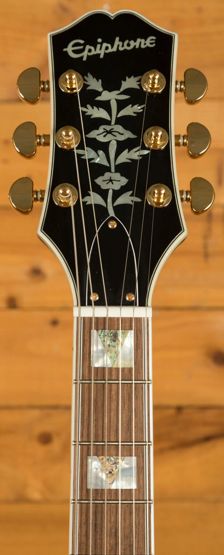 As you caress the neck of the Sheraton, you'll immediately notice the smoothness and playability it offers. Constructed from high-quality mahogany, this 22-fret neck is a testament to Epiphone's commitment to excellence. The Indian laurel fretboard is adorned with exquisite block mother of pearl inlays, complemented by abalone triangle accents that add a touch of sophistication to this already stunning instrument. Additionally, the bound headstock proudly displays the historic Epiphone logo, while the intricate tree of life in mother of pearl serves as a symbol of the Sheraton's everlasting beauty.