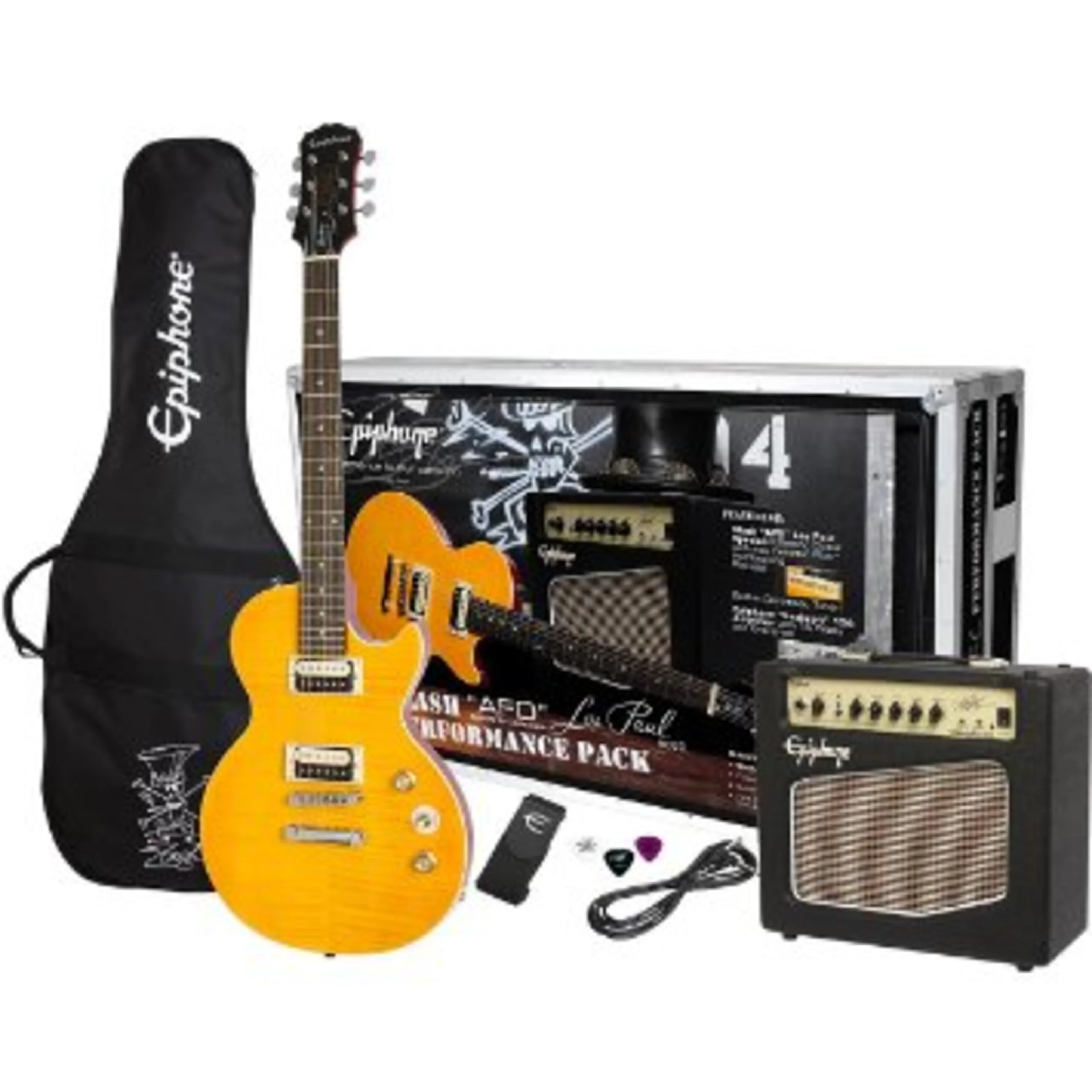 Epiphone is proud to present the new Slash "AFD" Les Paul Performance Pack, an incredible all-inclusive package for beginners and pros alike featuring a Slash-designed Les Paul Special-II in classic Appetite Amber finish with premium gig bag plus a 15-watt Slash "Snakepit' amp with 2-channels, a full EQ section and headphone output, custom Slash signature picks, and free online lessons from eMedia.