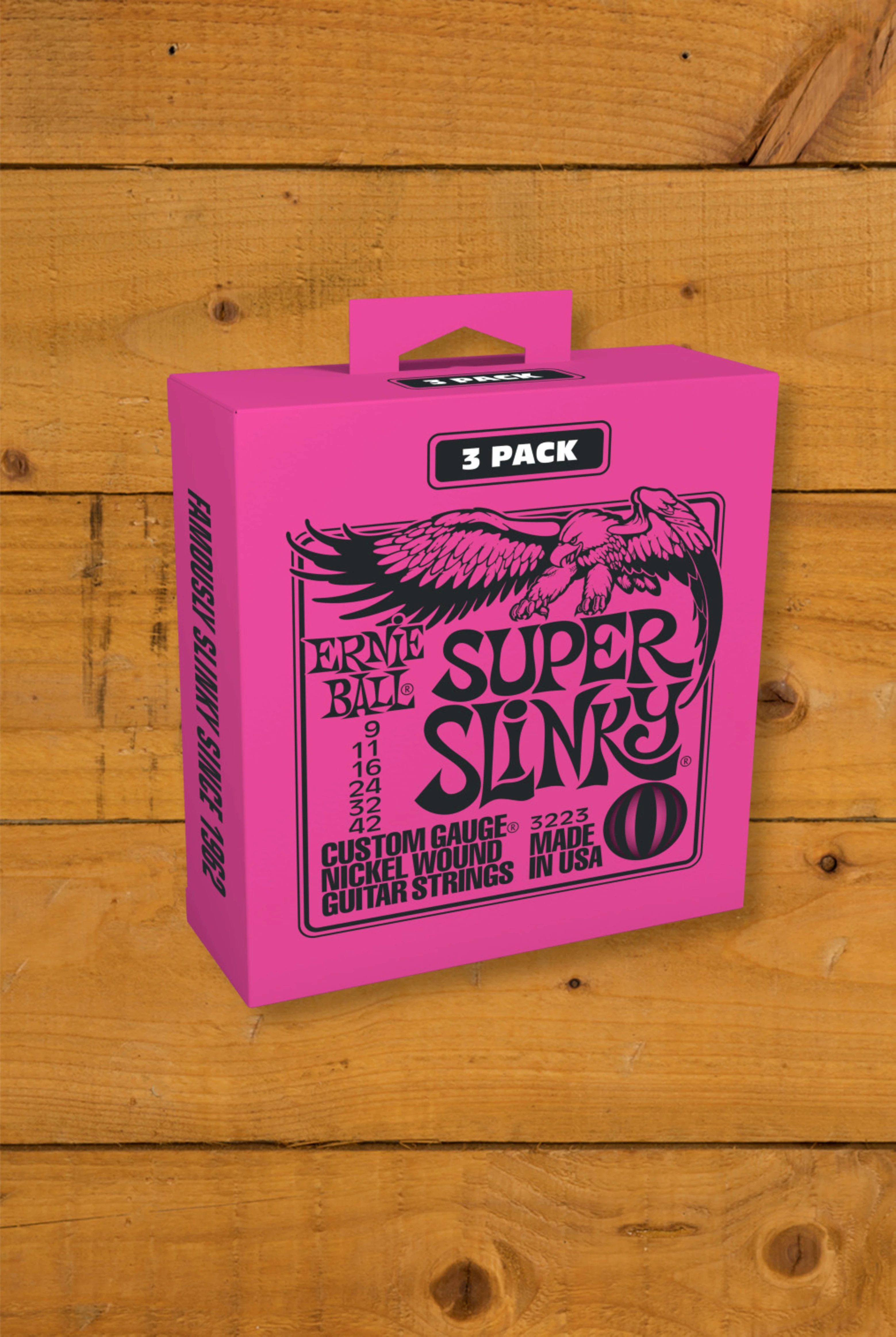 Now available in convenient three-set packs, Ernie Ball Super Slinky Electric Strings are played by Jimmy Page, Iron Maiden and Angus Young. These strings are precision manufactured to the highest standards and most exacting specifications to ensure consistency, optimum performance and long life. Super Slinky wound strings are made from nickel plated steel wire wrapped around a hex shaped steel core wire. The plain strings are made of specially tempered tin plated high carbon steel producing a well balanced tone for your guitar.