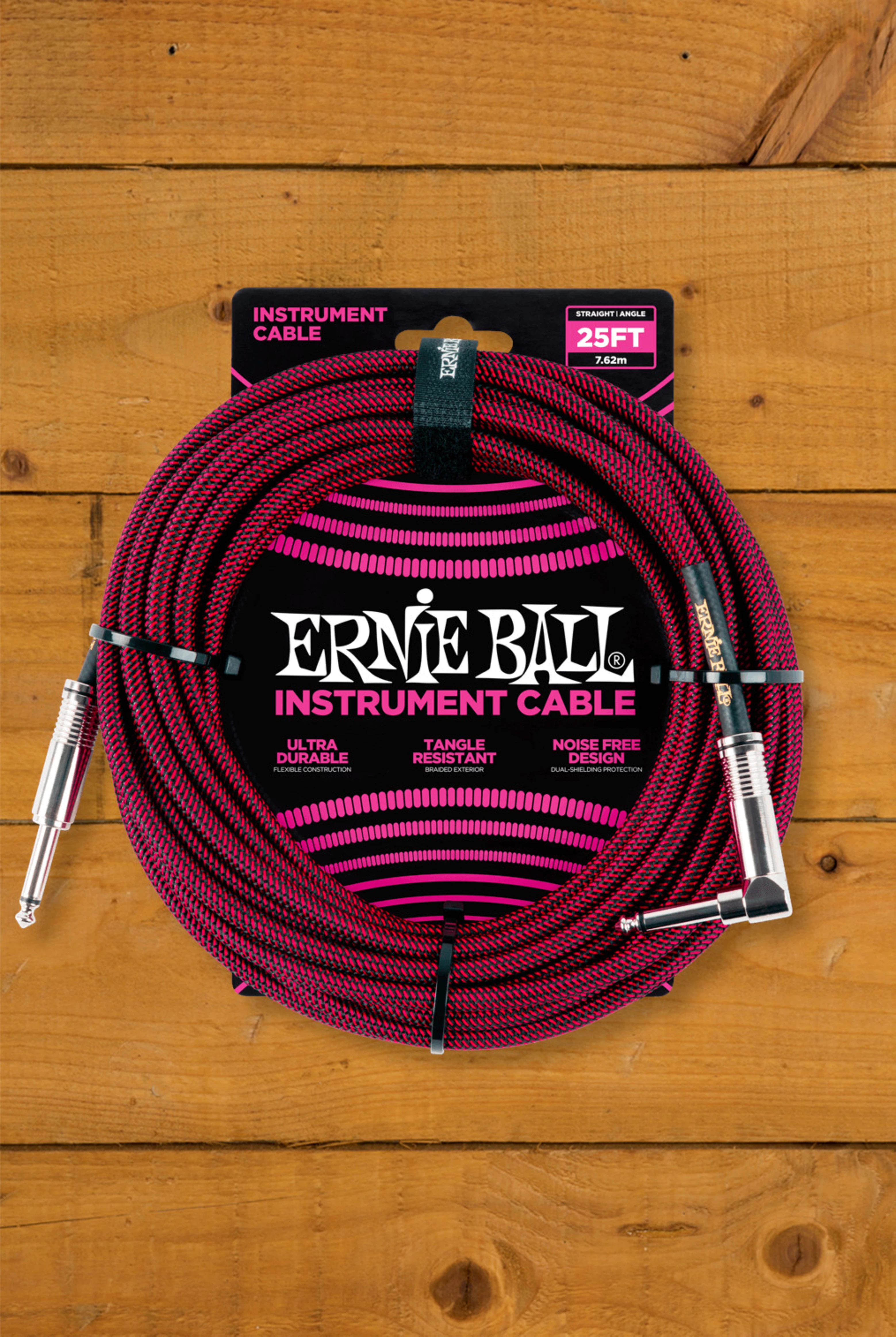 Ernie Ball instrument cables feature a high-quality design made with superior components that are built to last. Dual-conductors deliver reliably clear tone with crisp highs, tight mids, and rich harmonics. Multiple shielding materials preserve the signal with low handling noise, and the braided jacket exterior provides a tangle-resistant experience. Cable length 25ft (7.62m).