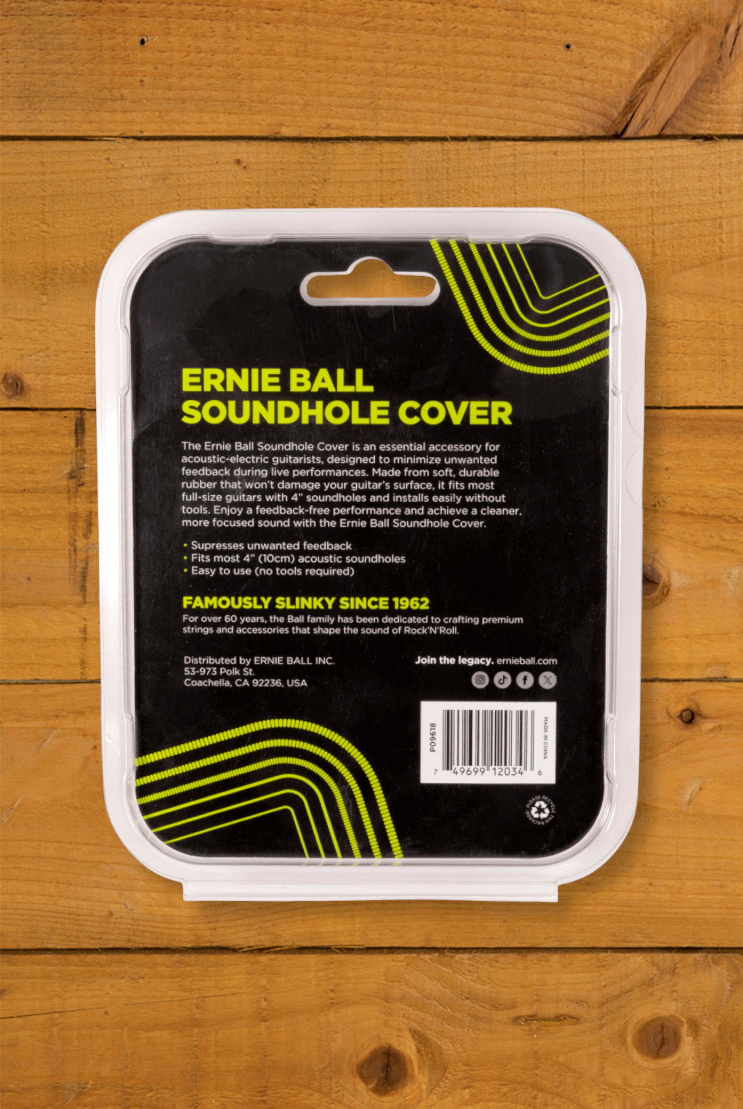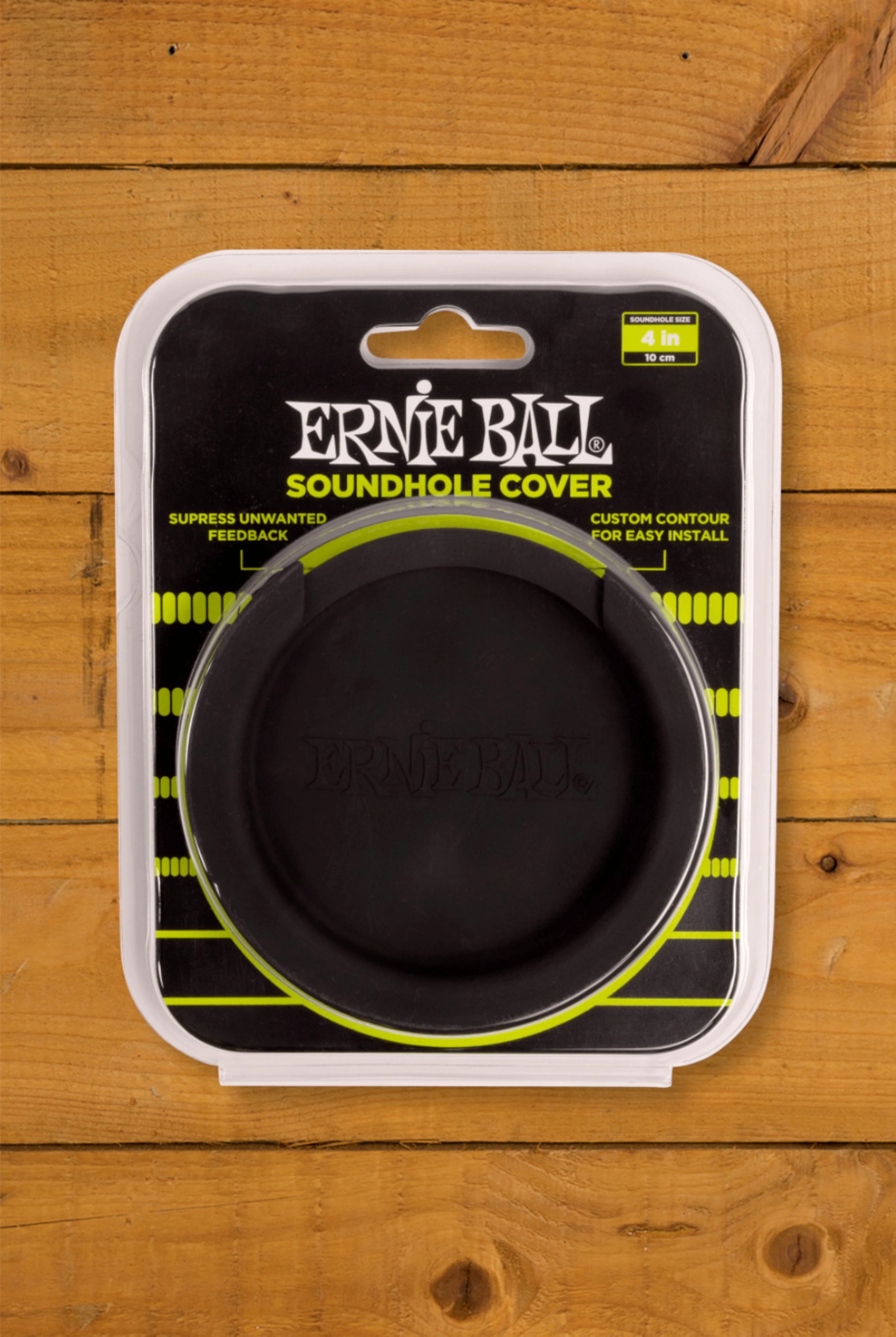 The Ernie Ball Acoustic Soundhole Cover (P09618) is designed for steel string acoustic guitars with larger 4 inch (10 cm) diameter soundholes. It helps reduce unwanted feedback during amplified performance without affecting the instrument's natural tone.