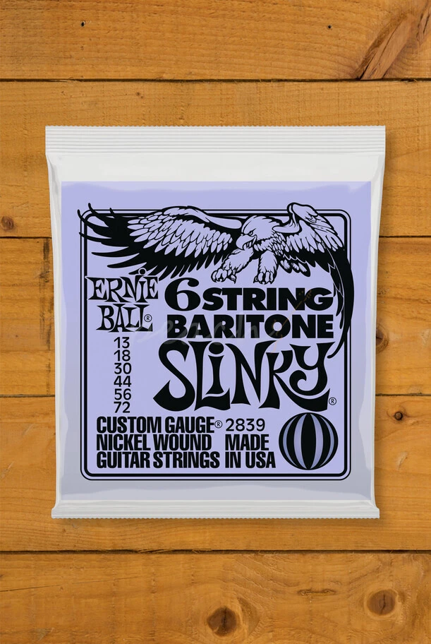 Ernie Ball Nickel Wound 6-string Baritone Electric Strings are made from nickel plated steel wrapped around a hex shaped steel core wire. The plain strings are made of specially tempered tin plated high carbon steel. Each guitar string produces a bright, balanced tone and manufactured with small ball ends like guitar strings, not large ball ends used on traditional electric bass strings. These sets are optimal for A-A or B-B tuning combinations and are a perfect match for baritone instruments.