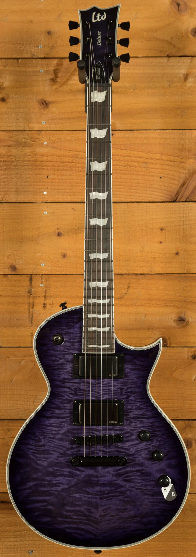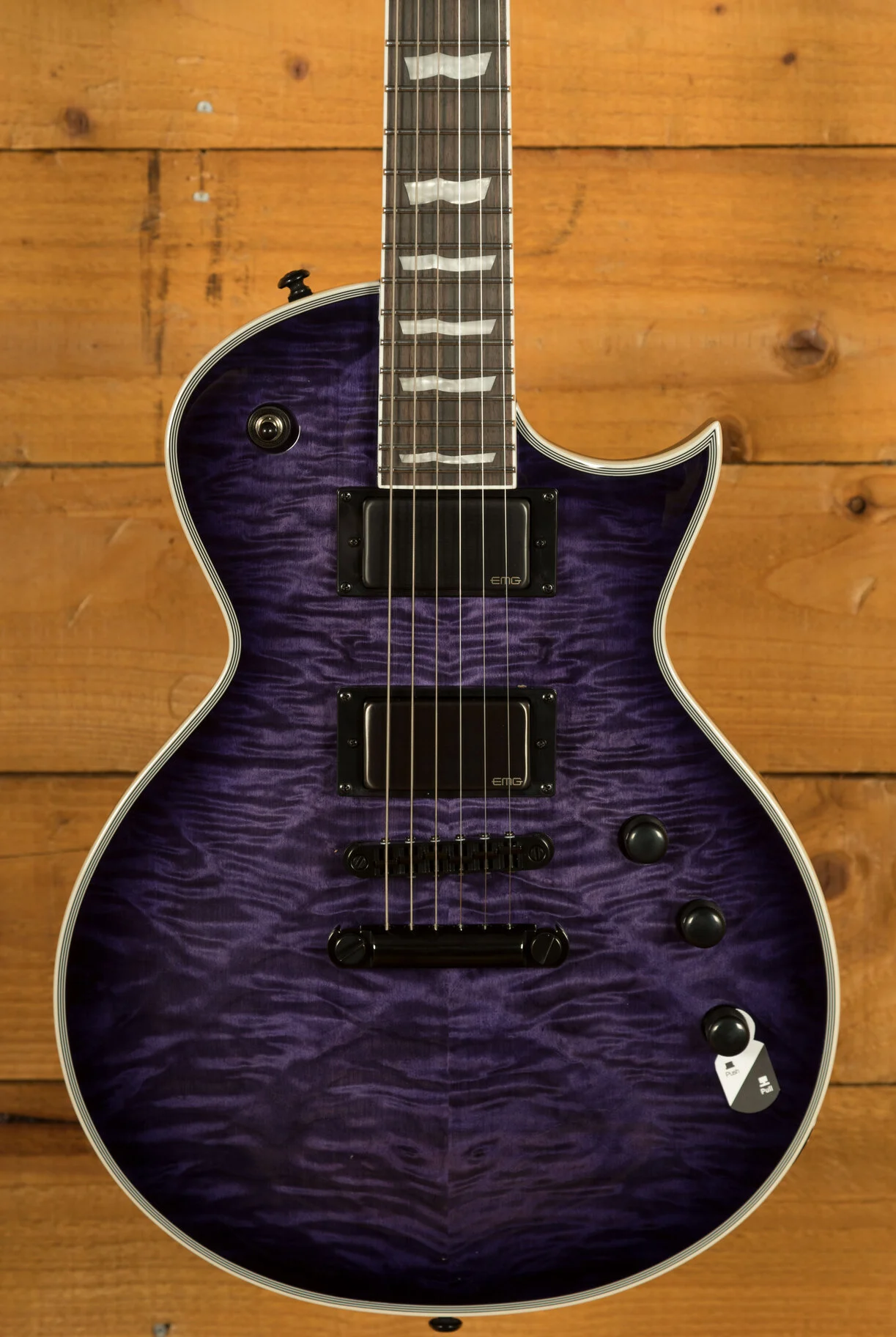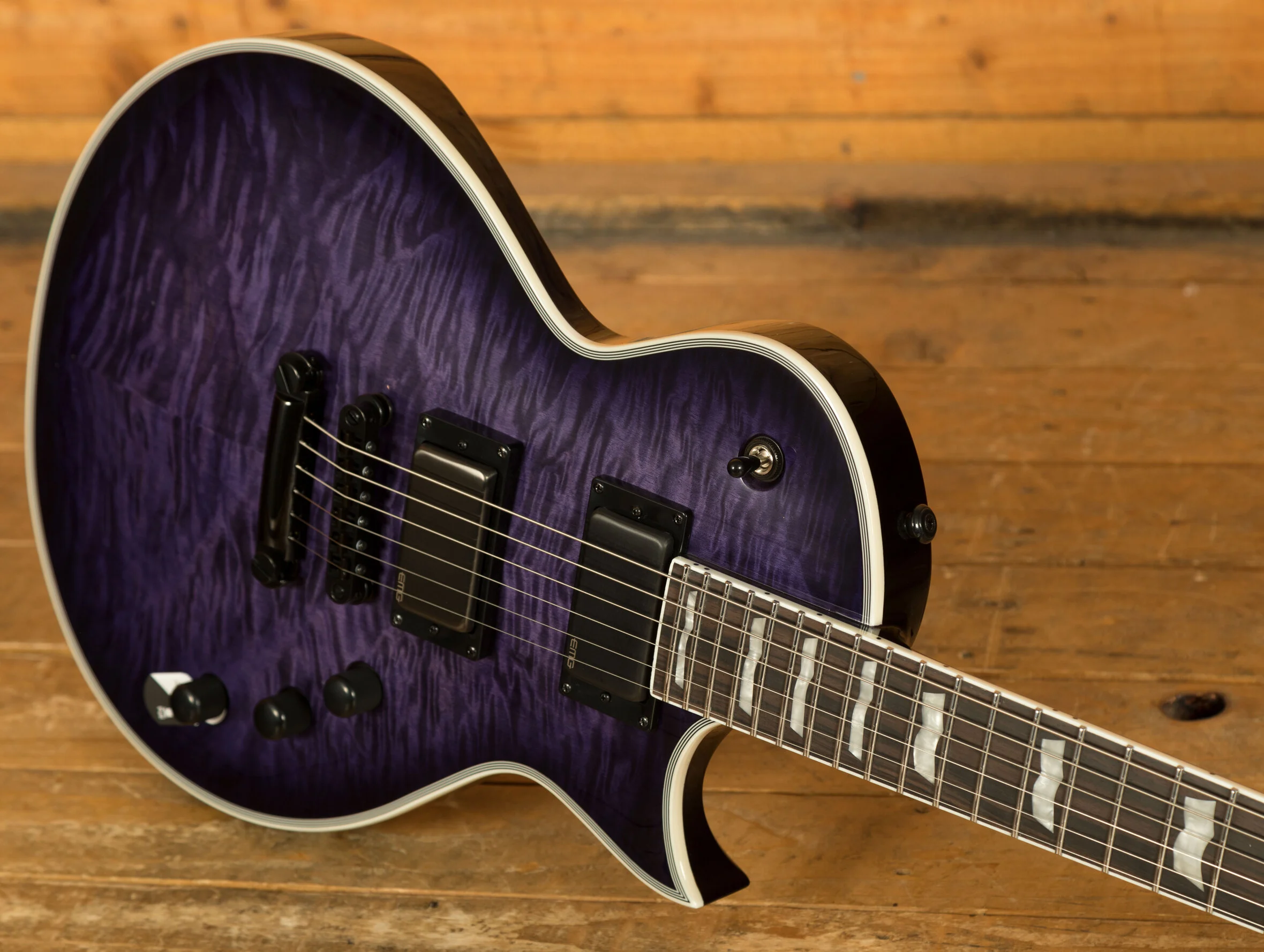 The ESP LTD EC-1000 in See Thru Purple Sunburst is a premium singlecut built for high-gain performance and refined playability. With a quilted maple top over a mahogany body, it delivers rich resonance and striking visual appeal. The set-thru mahogany neck and Macassar ebony fretboard provide excellent sustain and fast access across all 24 frets.
