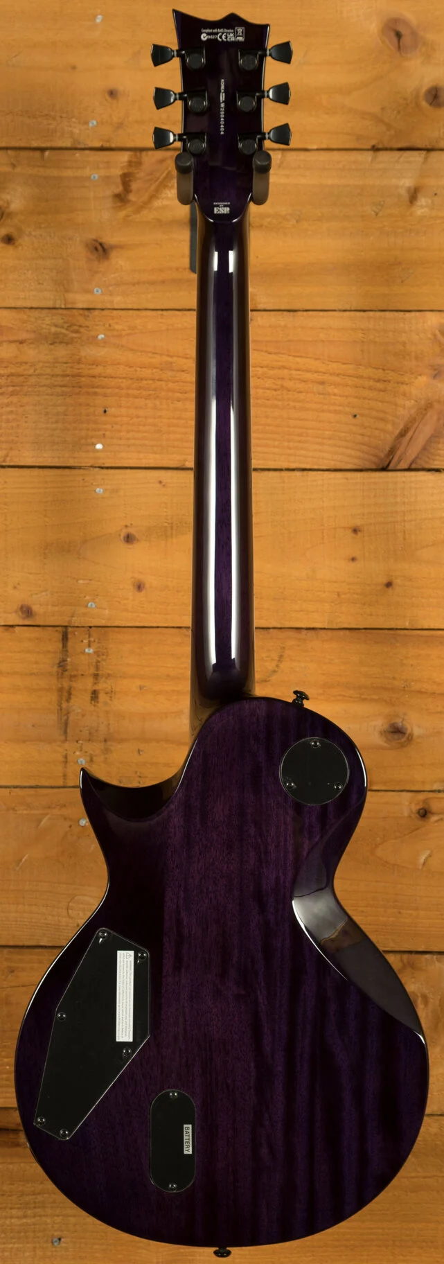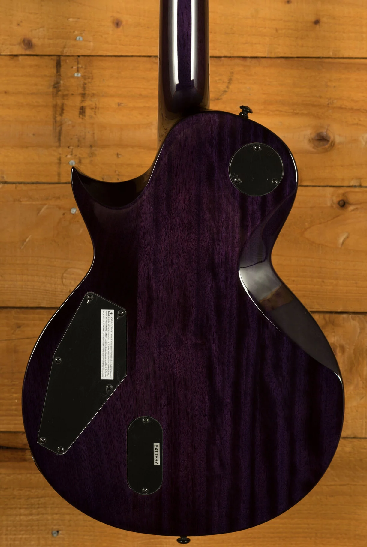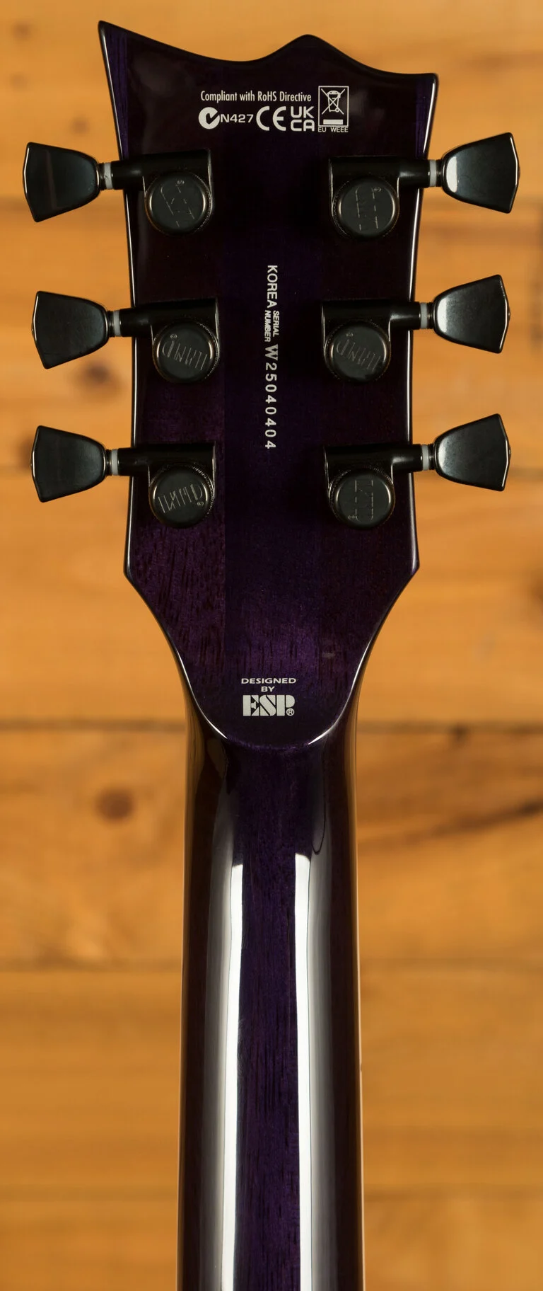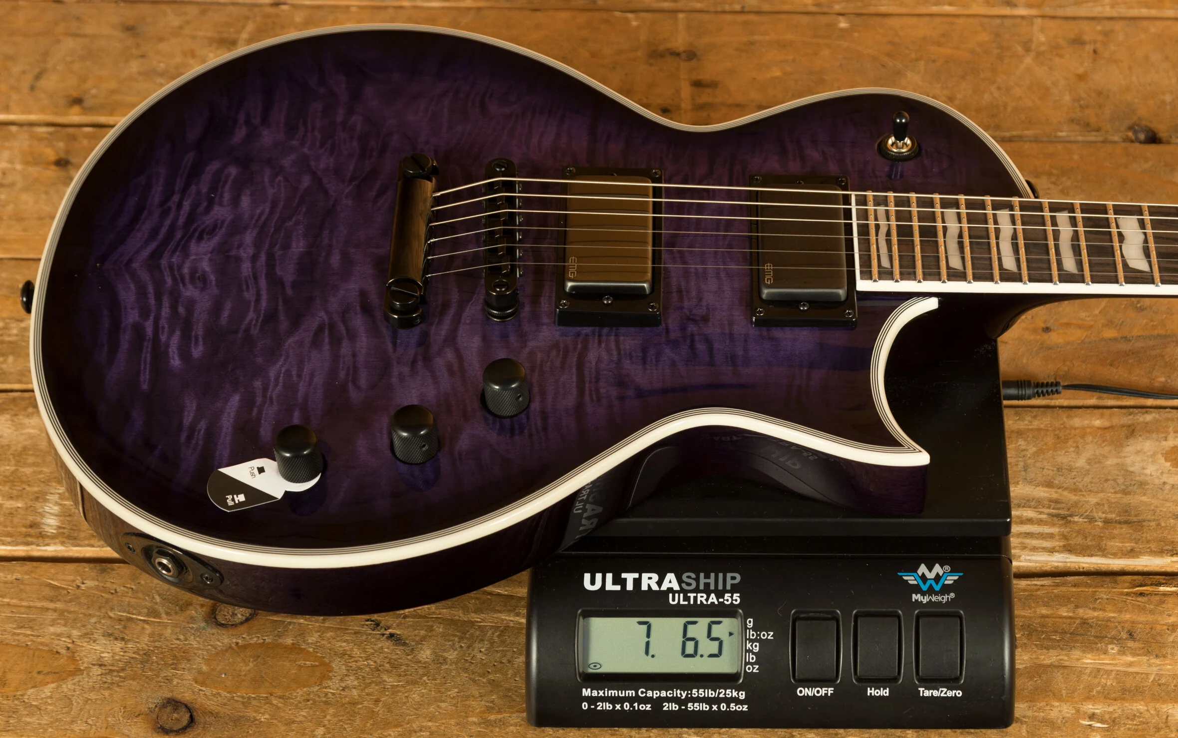 The ESP LTD EC-1000 in See Thru Purple Sunburst is a premium singlecut built for high-gain performance and refined playability. With a quilted maple top over a mahogany body, it delivers rich resonance and striking visual appeal. The set-thru mahogany neck and Macassar ebony fretboard provide excellent sustain and fast access across all 24 frets.