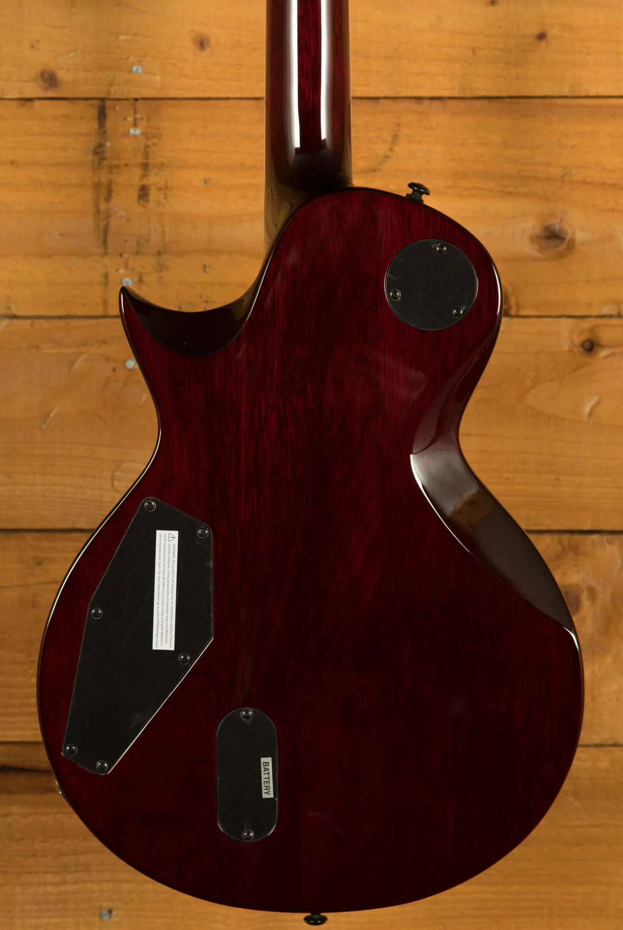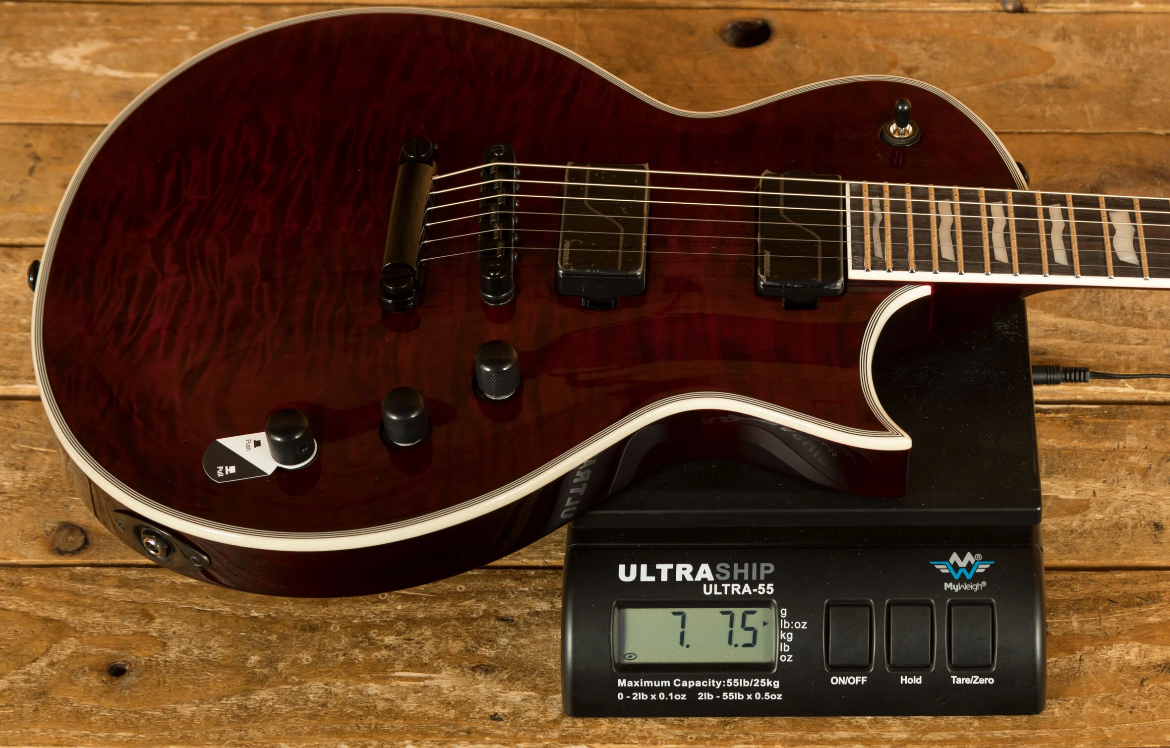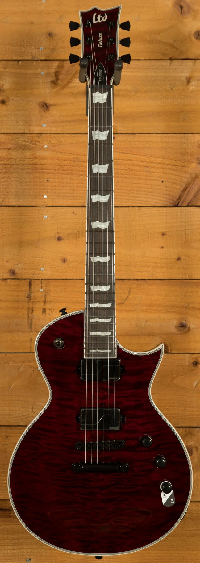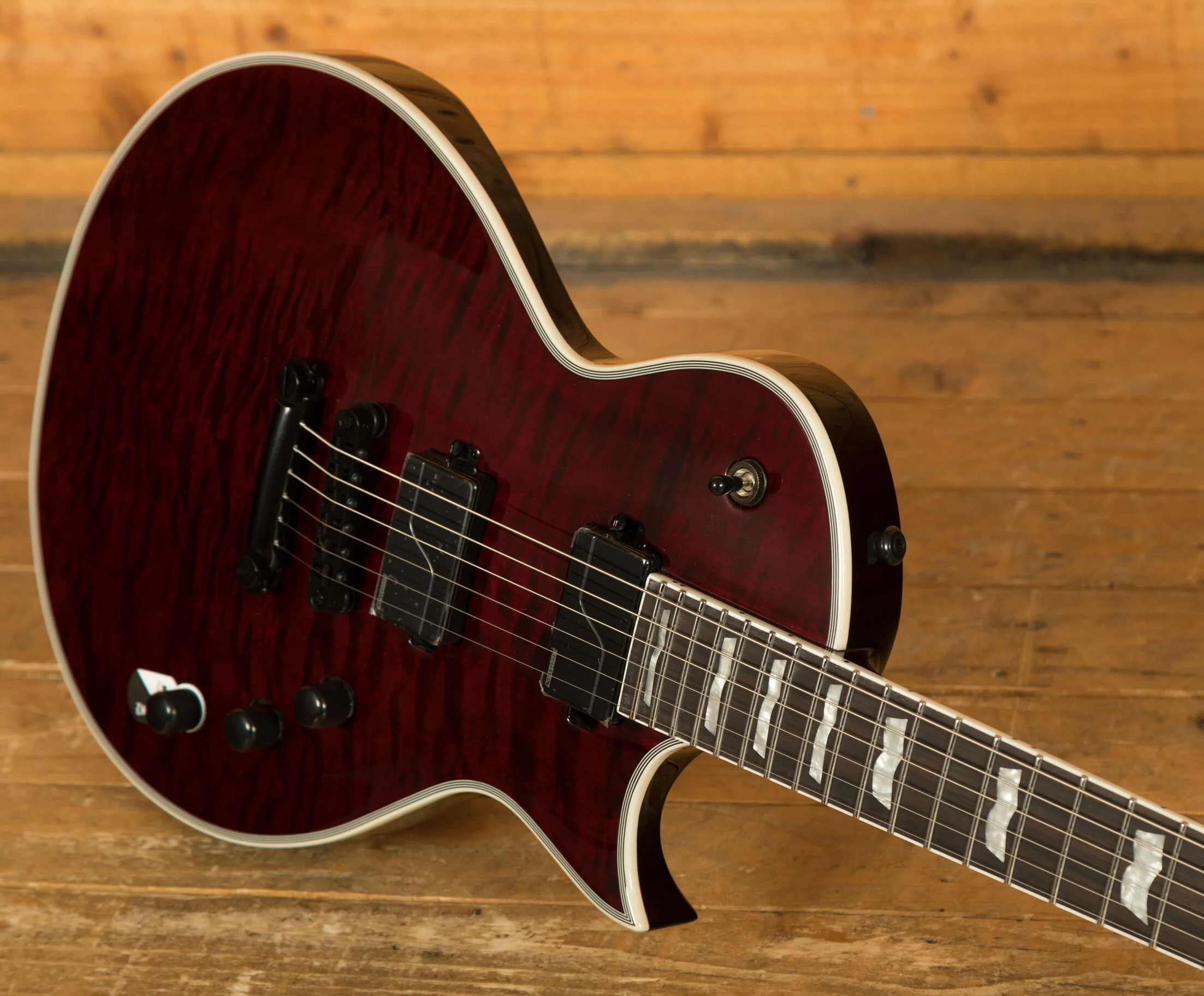 The ESP LTD EC-1000 is a high-performance electric guitar designed to meet the demands of modern musicians while delivering premium aesthetics and playability. Featuring a quilted maple top with multi-ply body and headstock binding, it offers a sophisticated appearance. The sleek black hardware complements its design, making it a standout instrument both visually and sonically.