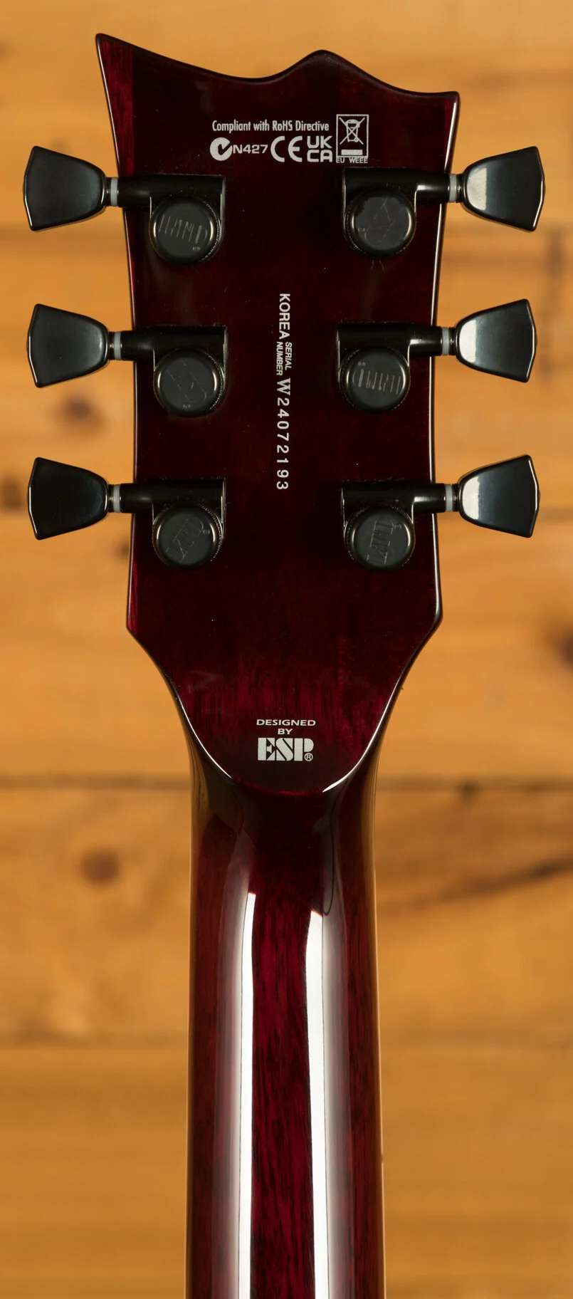 Built for comfort and durability, the EC-1000 features a set-thru construction with a 24.75" scale length and a smooth heel joint for effortless access to higher frets. The combination of a mahogany body and a three-piece mahogany "Thin U" neck ensures a solid, resonant tone with excellent playability. The Macassar ebony fingerboard with a 350mm radius, ESP flag inlays, and 24 extra-jumbo stainless steel frets enhances precision and reduces wear, making this guitar a reliable choice for long-term use.