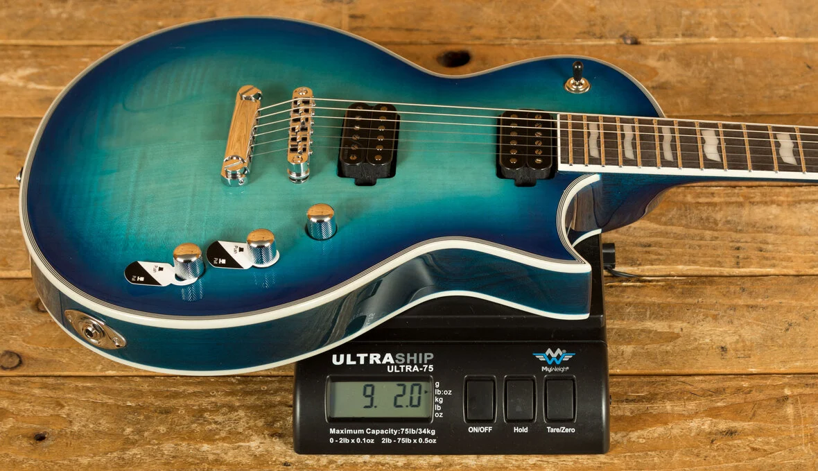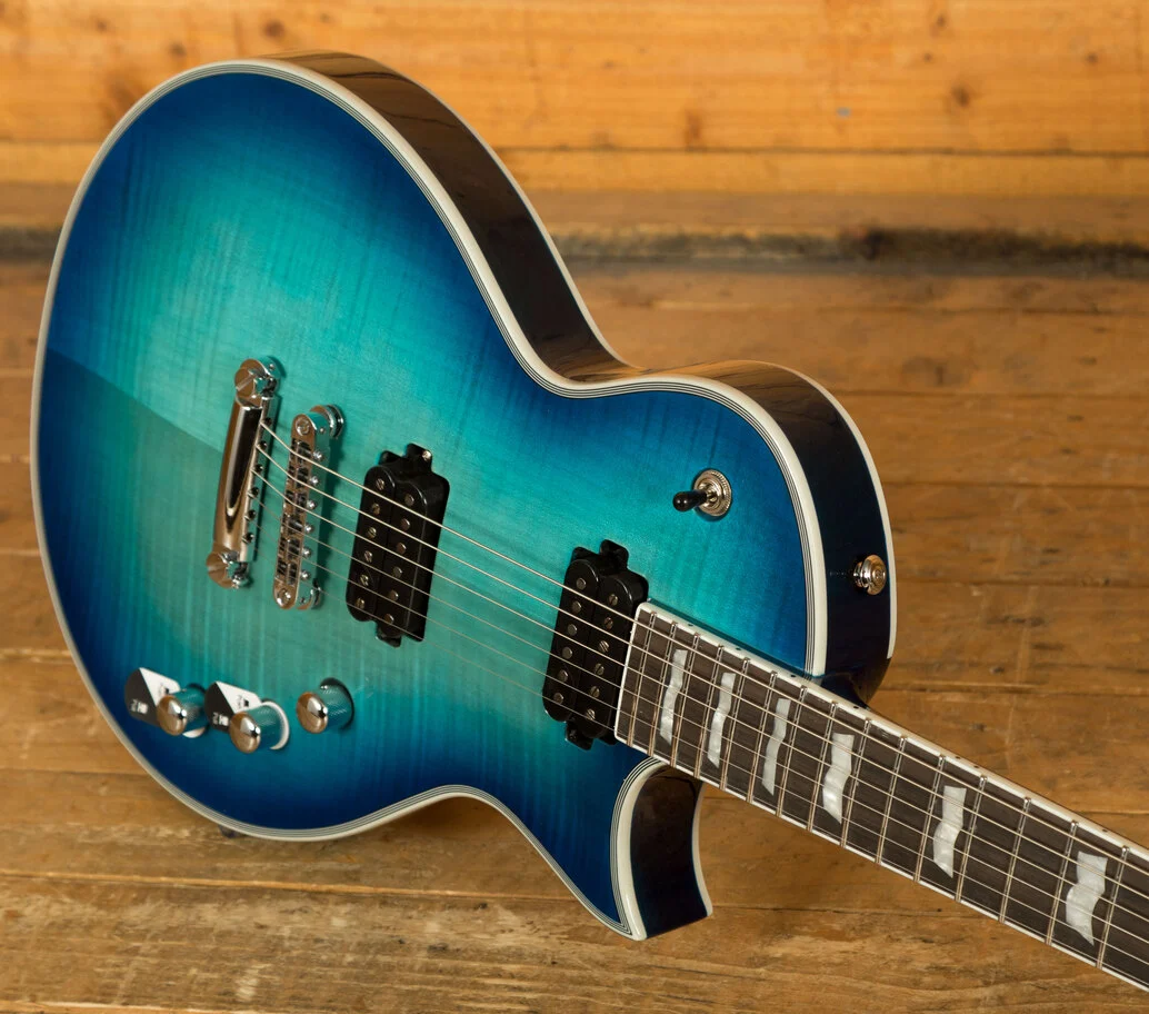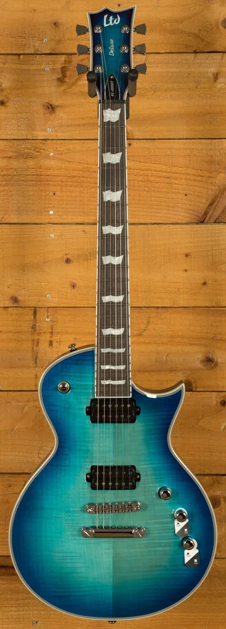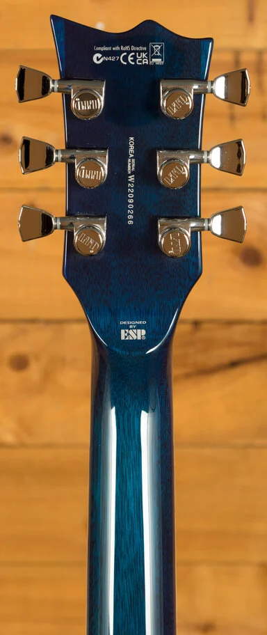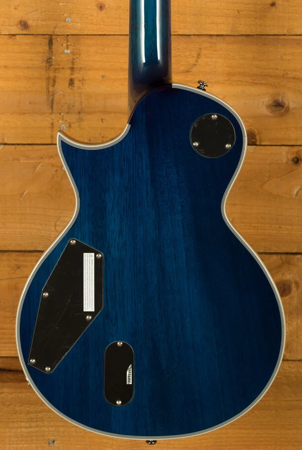 Guitars in the LTD 1000 Series are designed to offer the tone, feel, looks, and quality that working professional musicians need in an instrument. The EC-1000T/CTM is an instant classic, with its traditional full-thickness single-cutaway mahogany body shape (no waist cut) and classy flamed maple top in Violet Shadow finish. The 'CTM' stands for its custom multi-ply binding, situated on both the front and back or the body as well as neck and headstock. Details like a matching flamed maple headstock also make this guitar stand out from the crowd. You’ll find that just about any tone is possible on the EC-1000T/CTM with its set of direct-mount Fishman Fluence Open Core Classic Humbucker pickups. Each pickup offers three voicings, selectable with push-pull controls. On the neck pickup, Voice 1 offers the coveted vintage PAF tone, Voice 2 is an airy chime, and Voice 3 is a vintage single-coil. For the bridge pickup, Voice 1 is the PAF, Voice 2 is the classic hot-rodded humbucker, and Voice 3 is an overwound single coil. The resulting sonic versatility of this guitar is astounding. The EC-1000T/CTM also includes a Macassar ebony fingerboard with white pearloid ESP flag inlays and 22 extra-jumbo stainless steel frets, LTD locking tuners, and a TonePro locking TOM bridge and tailpiece.