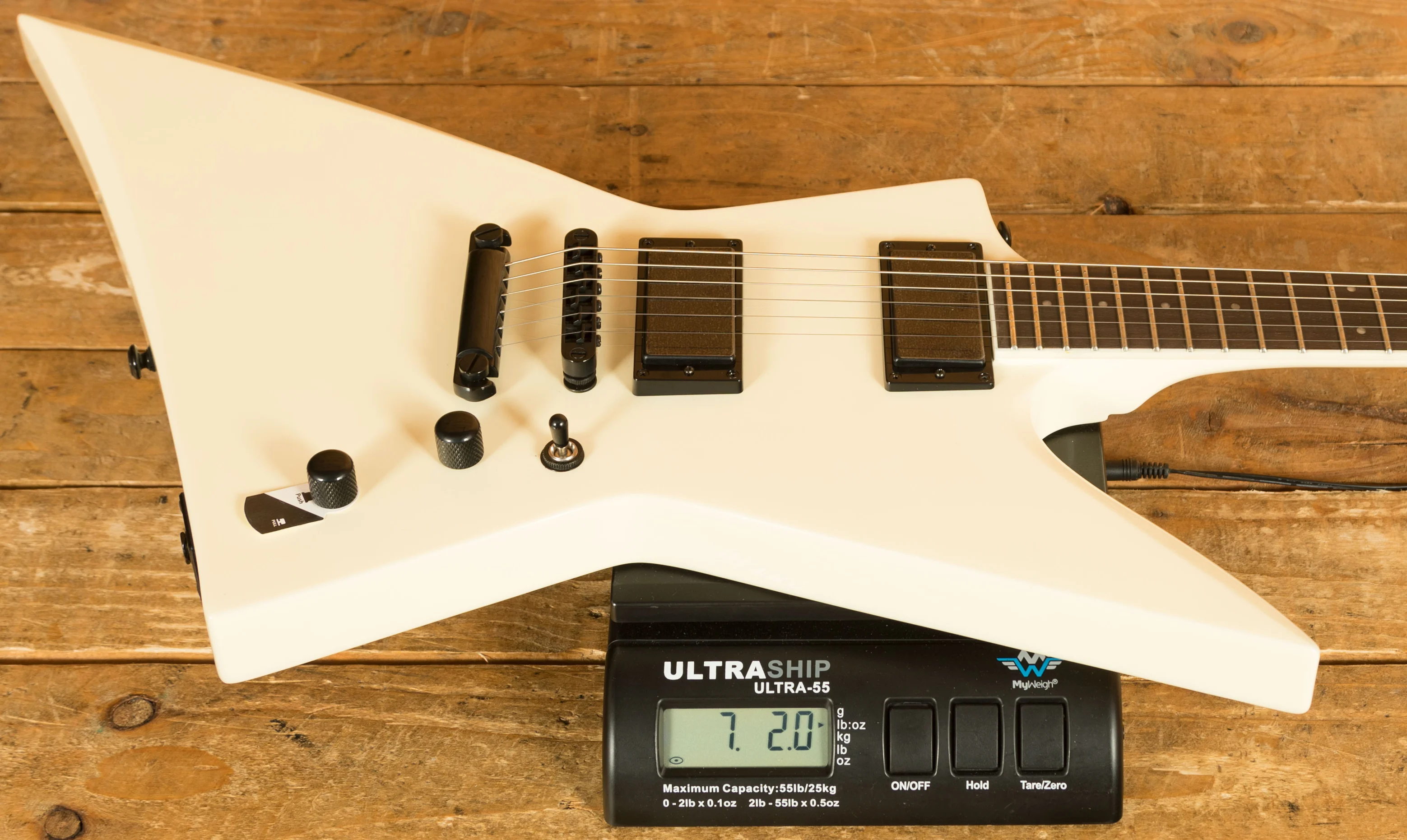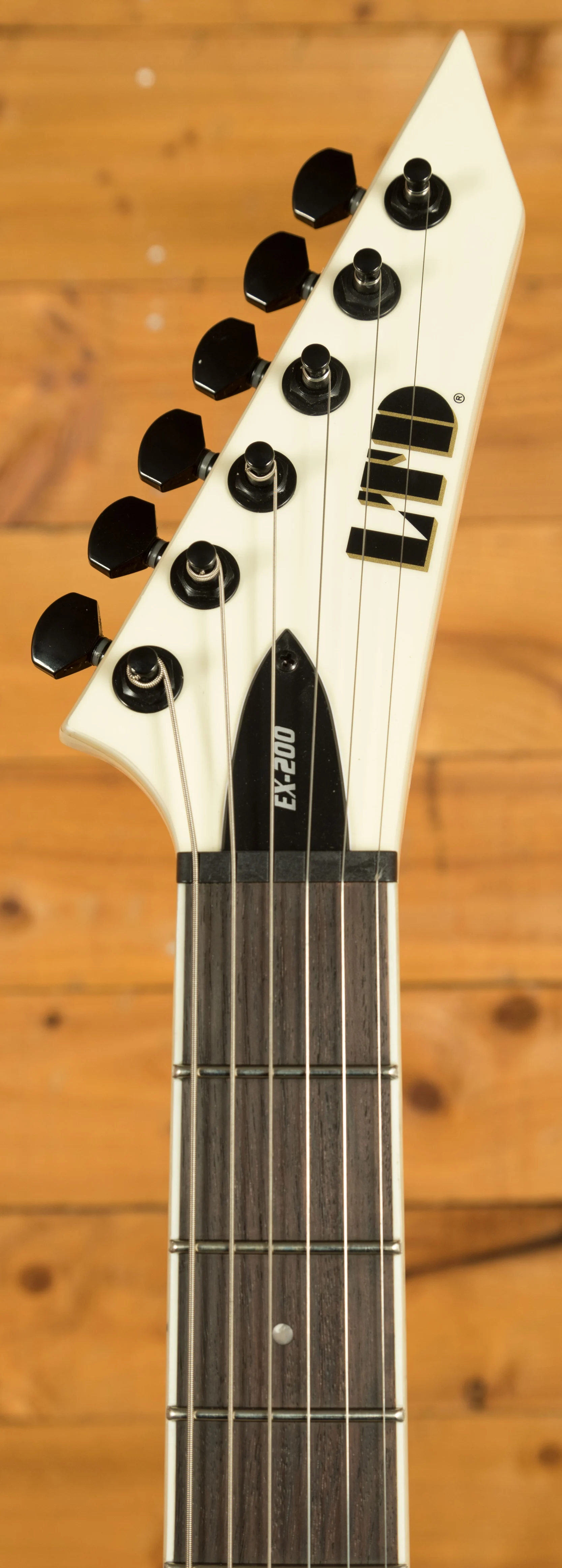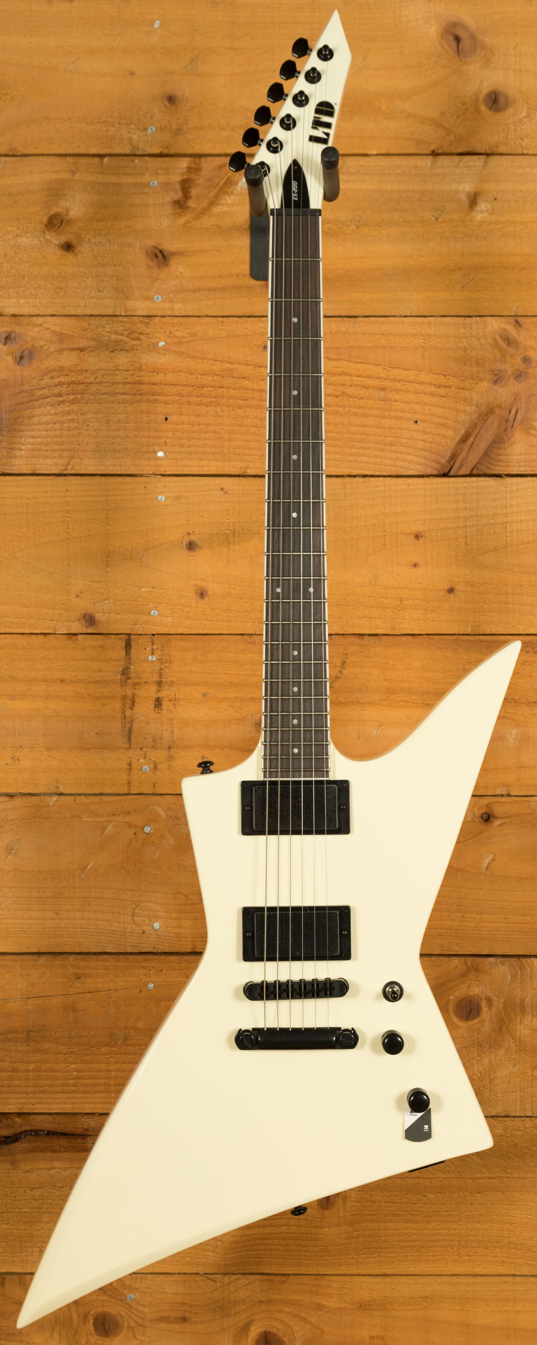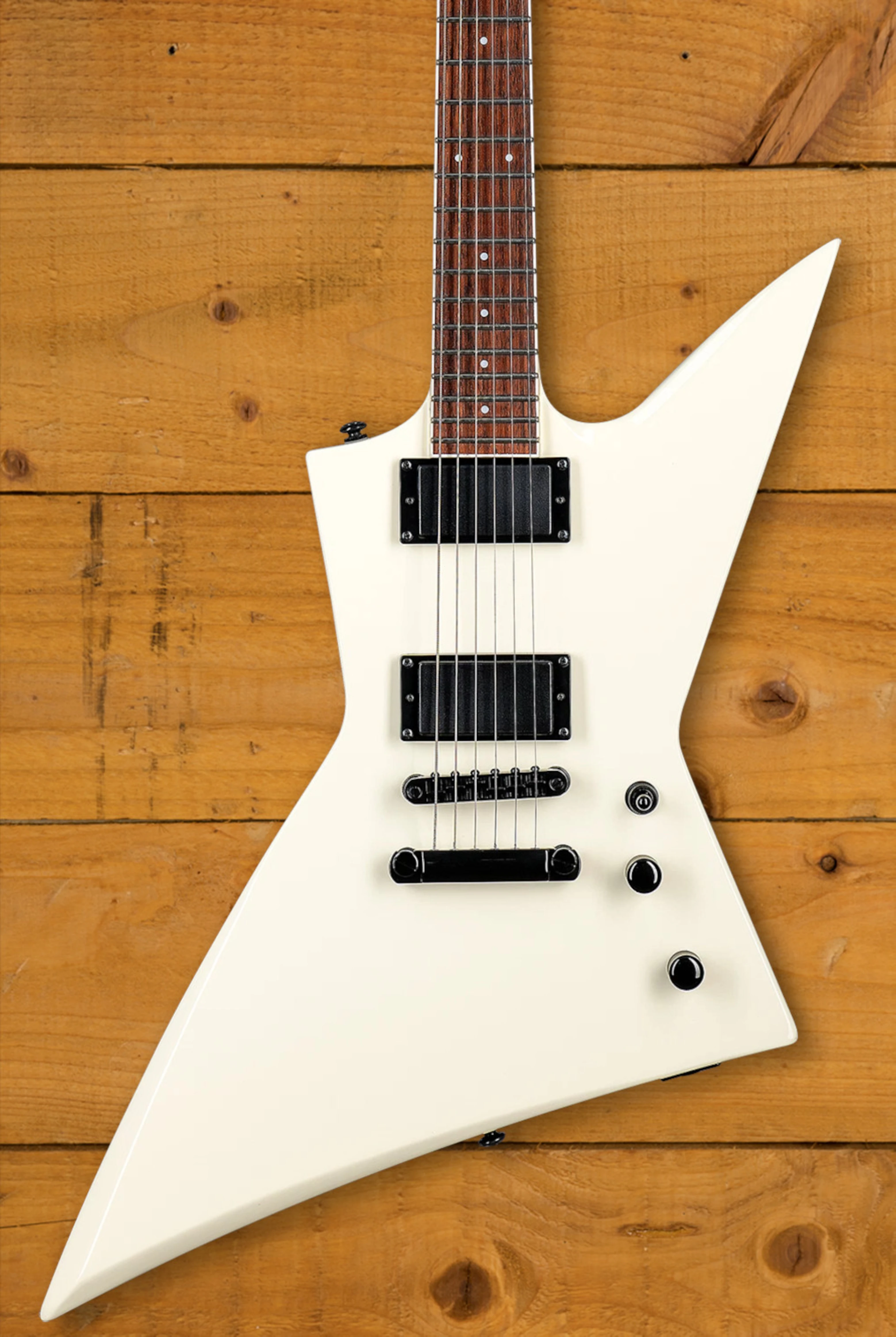 The LTD EX-200 is inarguably one of the coolest-looking guitars in the entire ESP offering, designed around those classic "EX" style guitars but with some awesome modern features. Constructed with a Mahogany body finished in the awesome Olympic White finish. This colour choice paired with the black hardware makes it look super menacing and aggressive.