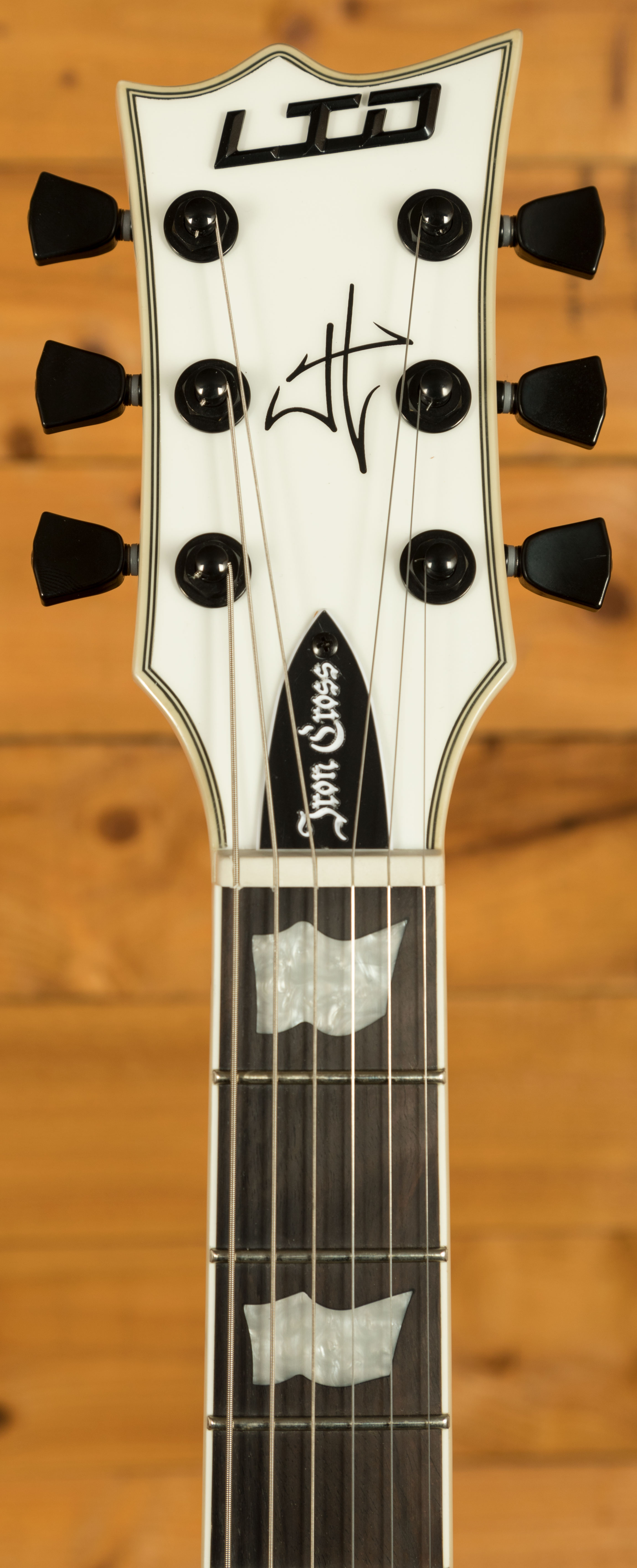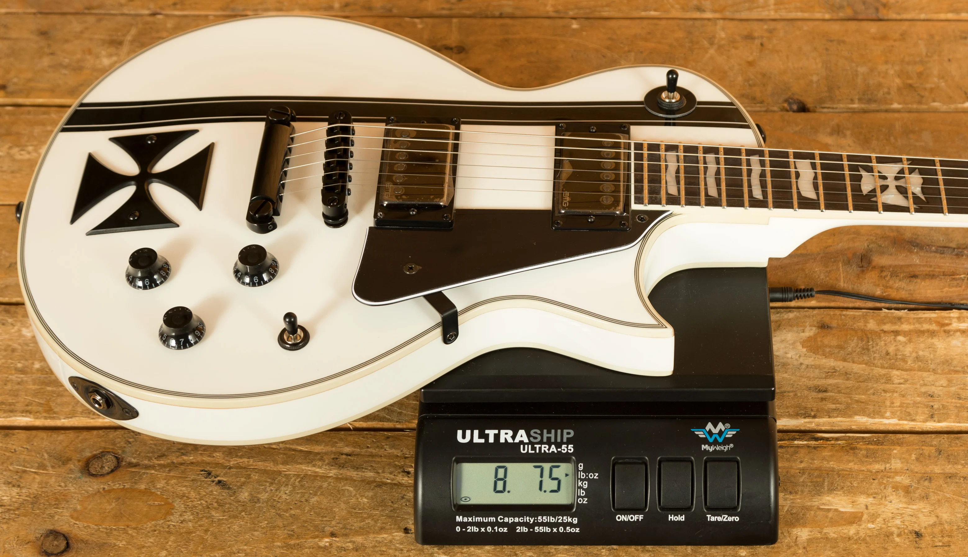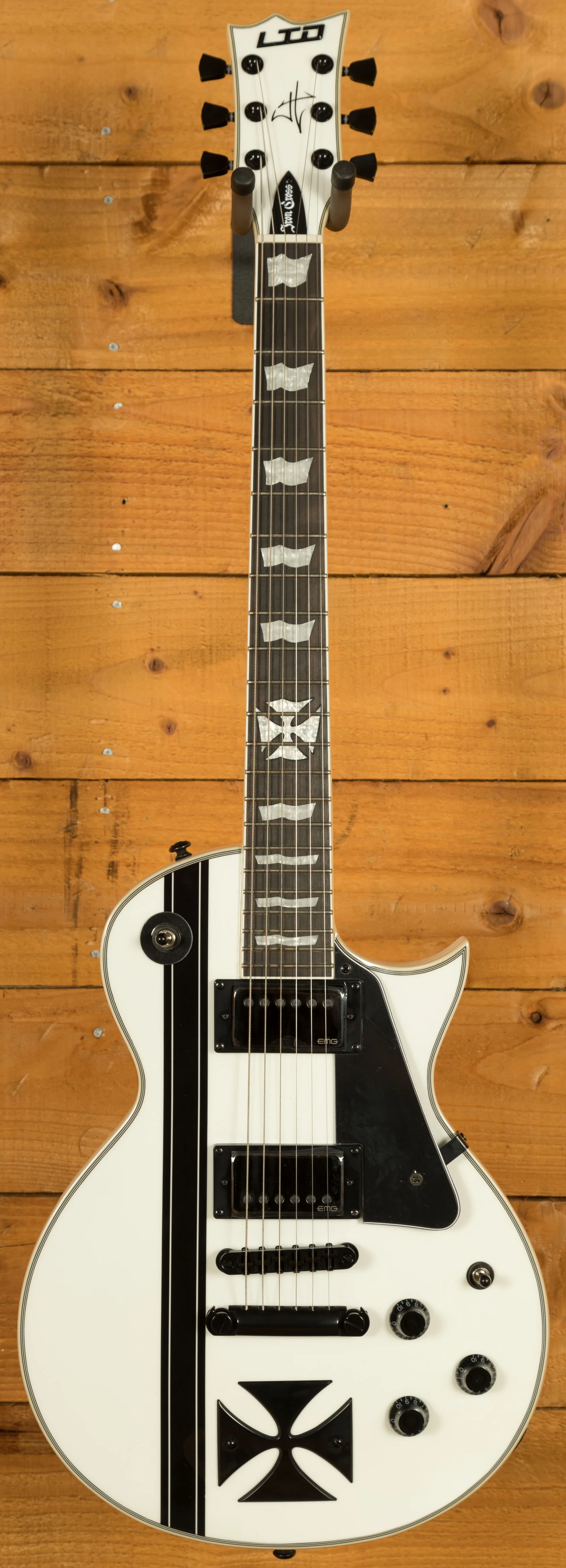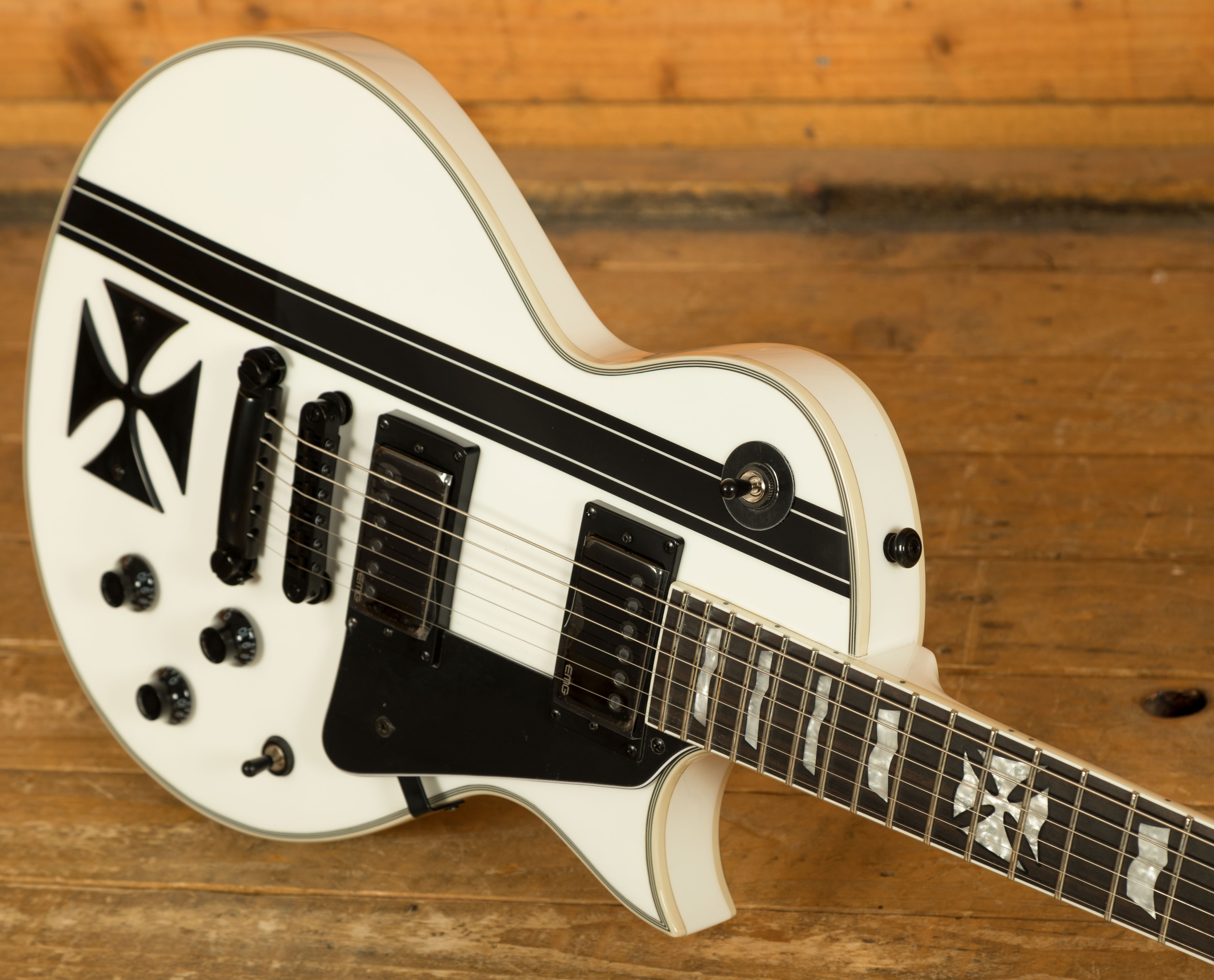 The LTD Iron Cross is powered by James' own EMG JH SET active pickups, and includes a TonePros locking TOM bridge and tailpiece. Available in Snow White finish with black stripe graphic and iron cross fixture.