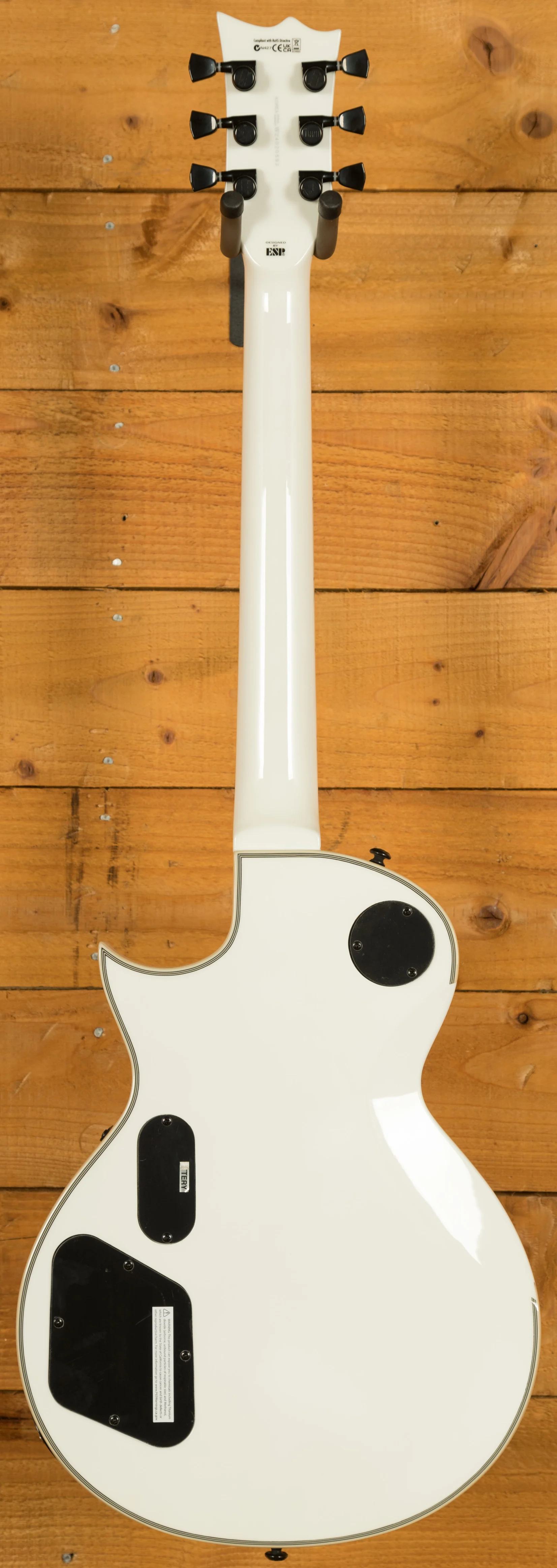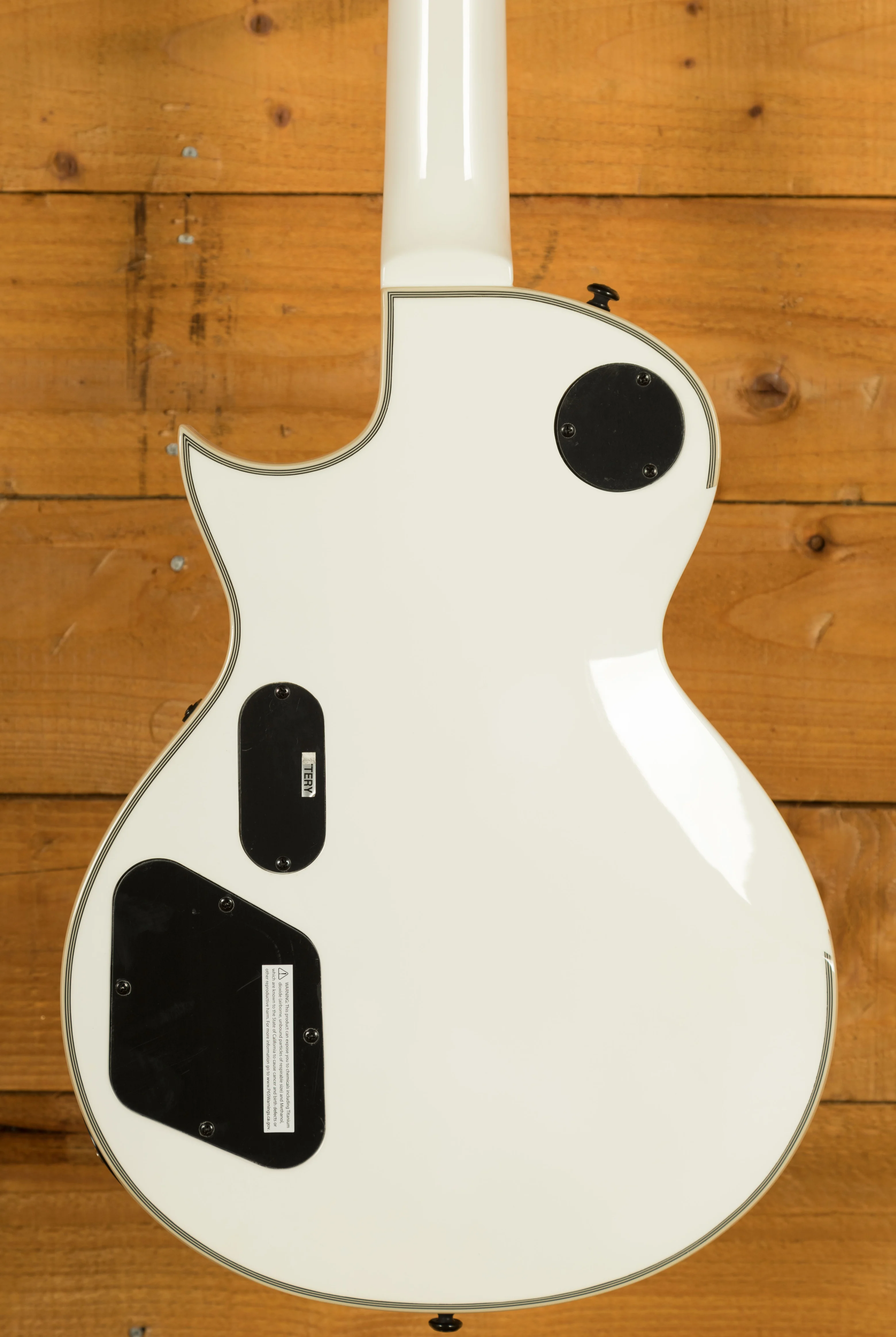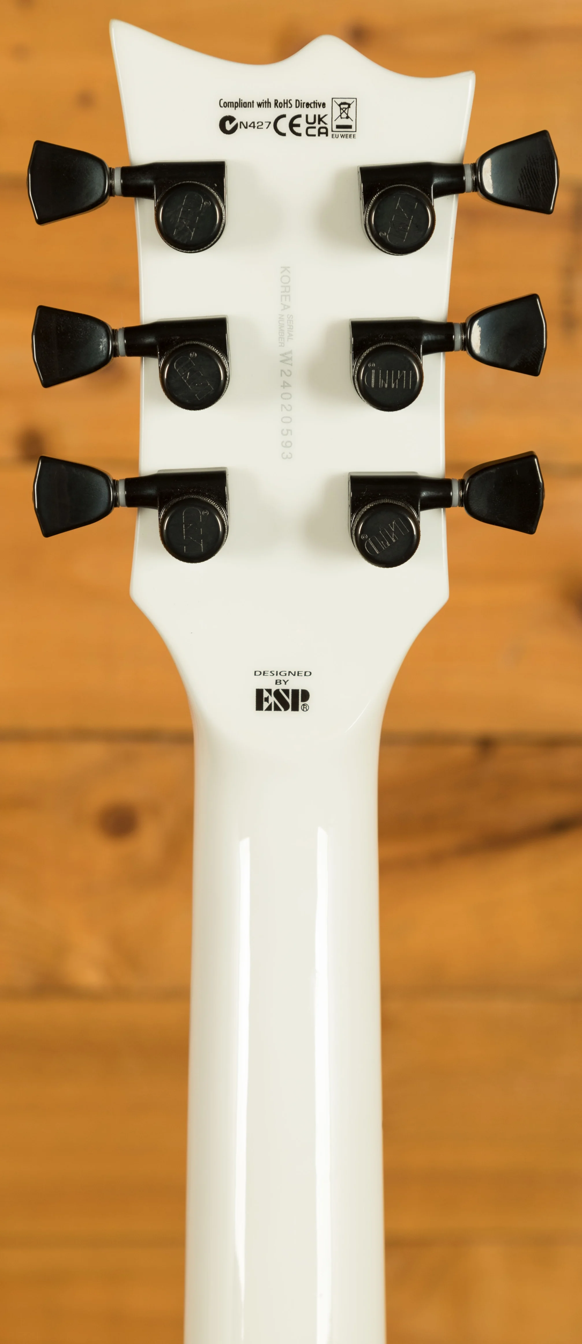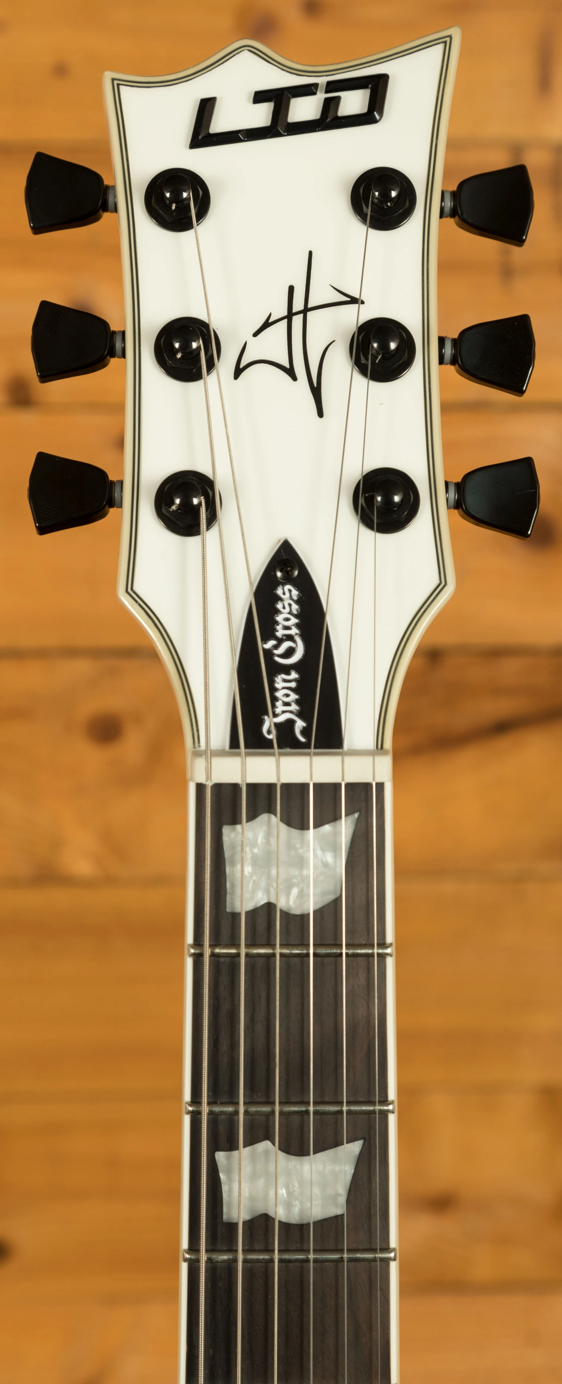The LTD Iron Cross is powered by James' own EMG JH SET active pickups, and includes a TonePros locking TOM bridge and tailpiece. Available in Snow White finish with black stripe graphic and iron cross fixture.