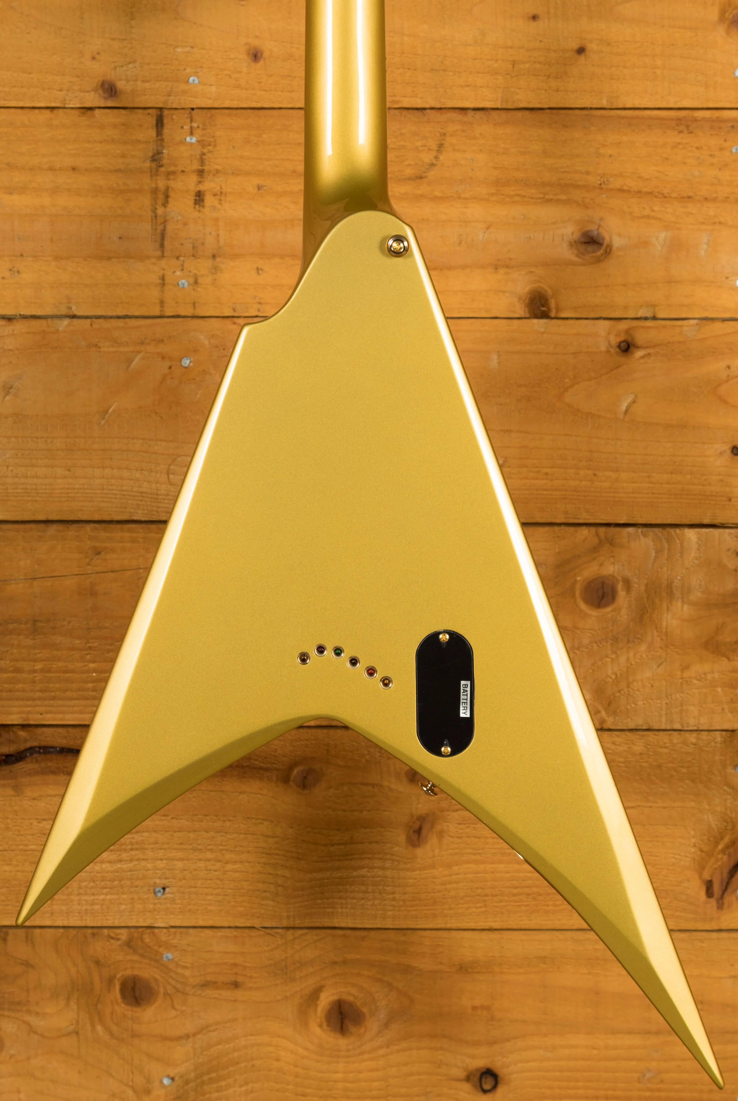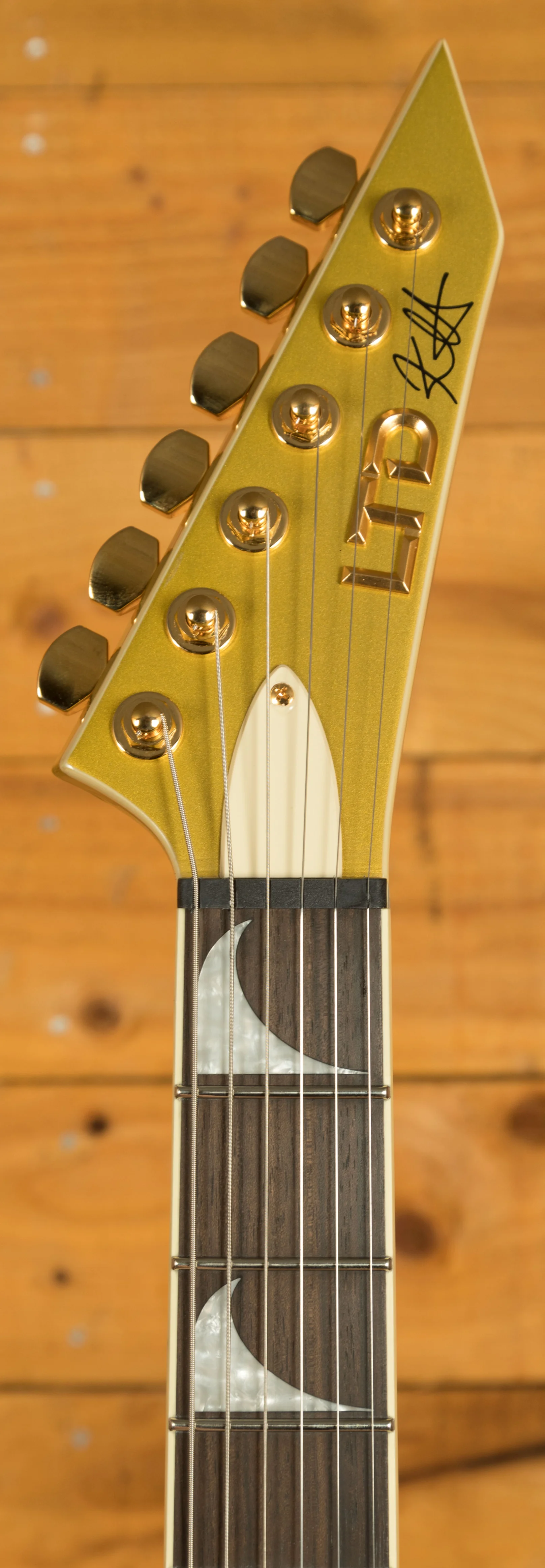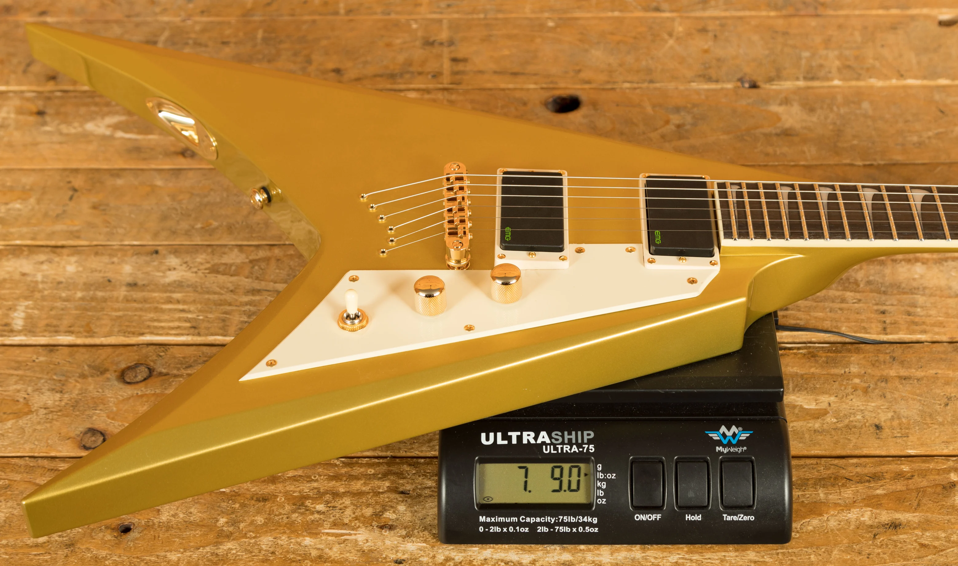 Featuring Kirk Hammett's signature EMG Bonebreaker active neck and bridge pickups, the guitar makes no compromises when it comes to tone, intent on not sacrificing gain for clean or vice-versa. This model also boasts a Korina body, famed for it's use in iconic guitars of the 50's and rich tone. And whilst this dynamic duo catches the ears of all sonically, the Metallic Gold finish will be sure to stand out when you 'hit the lights'. Once you've finished putting this guitar to use for the day though, you can rest easy with the knowledge that its safe and secure in its included form-fitting hardcase.