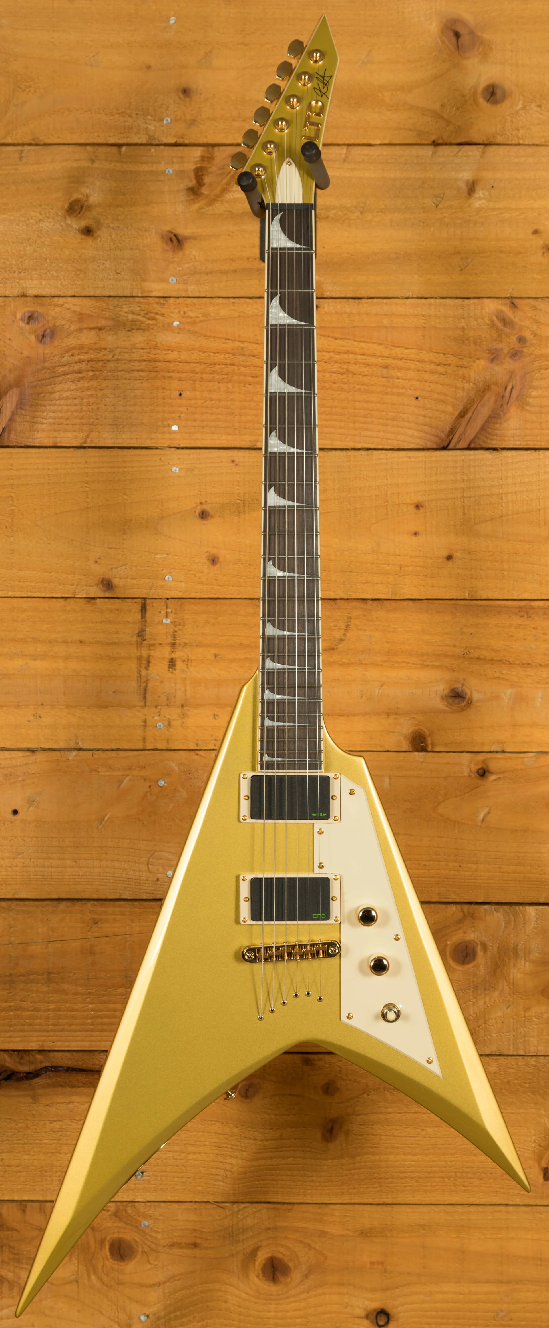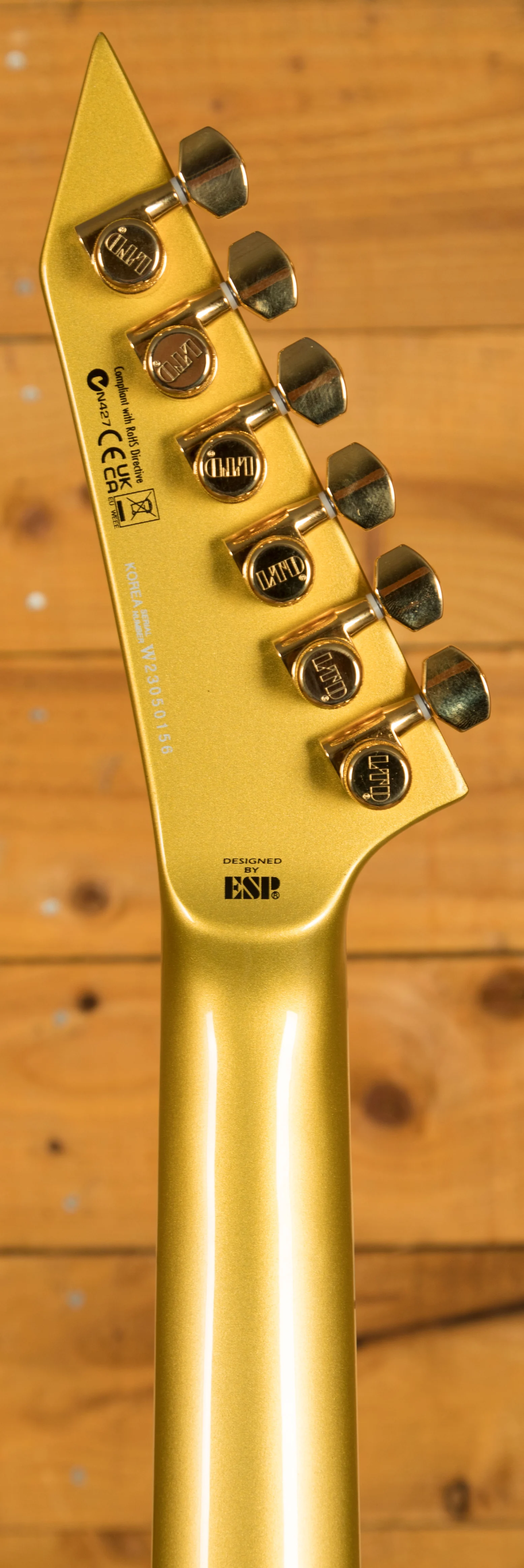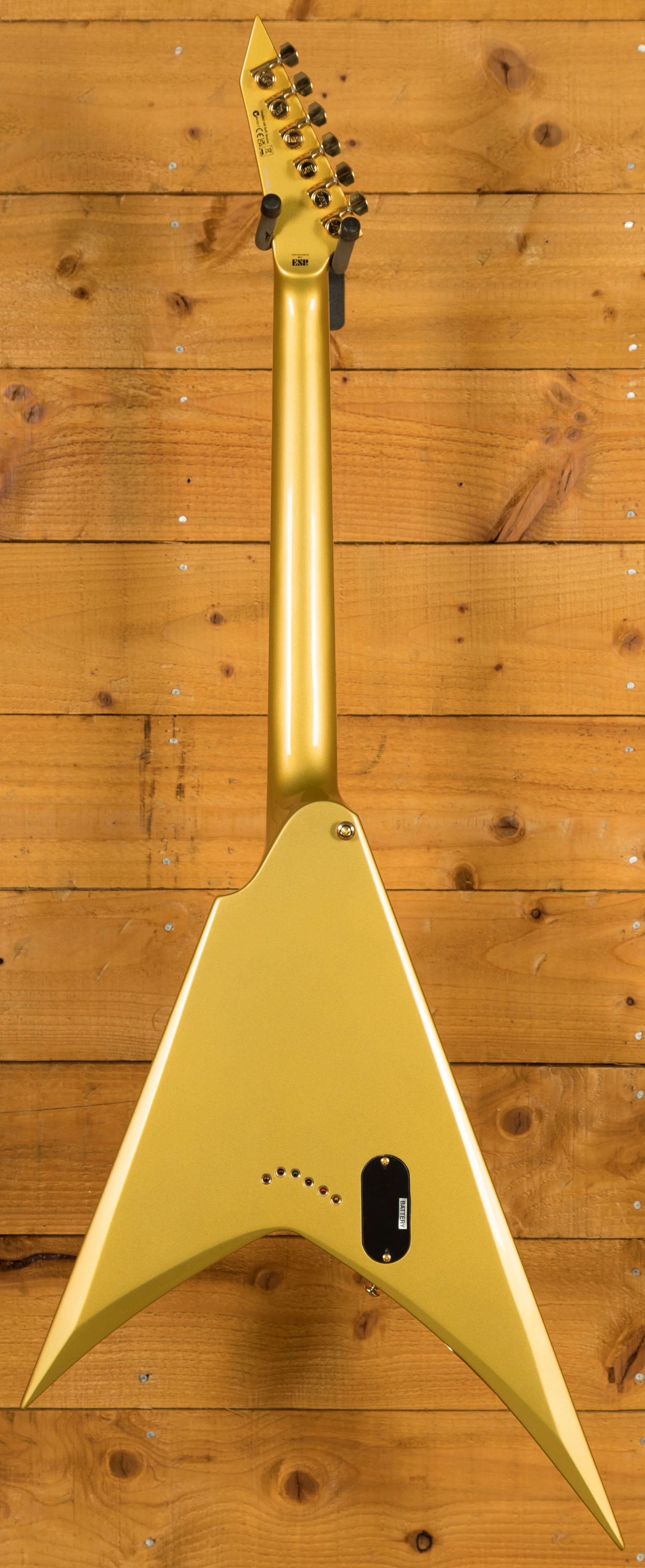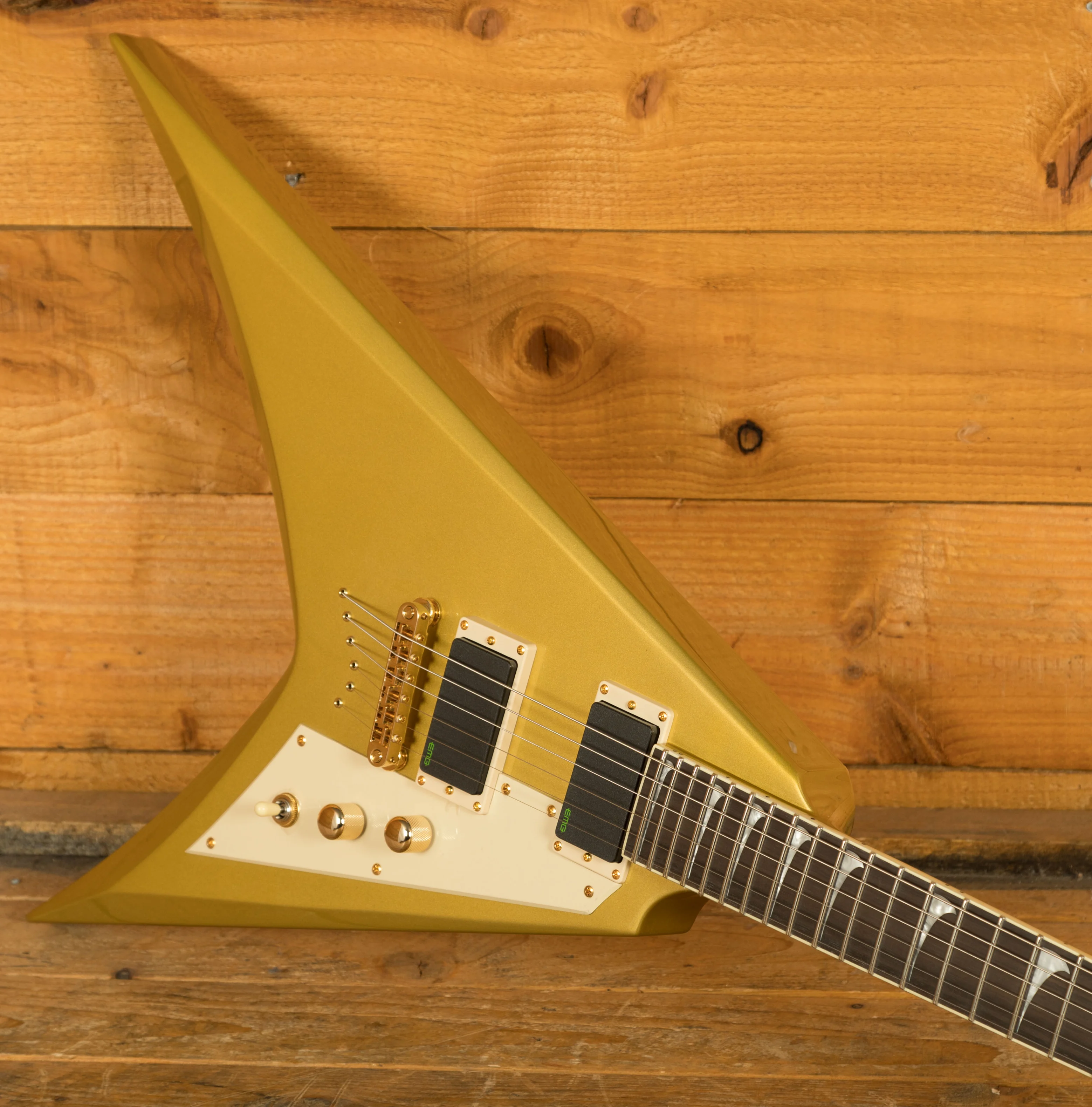 Featuring Kirk Hammett's signature EMG Bonebreaker active neck and bridge pickups, the guitar makes no compromises when it comes to tone, intent on not sacrificing gain for clean or vice-versa. This model also boasts a Korina body, famed for it's use in iconic guitars of the 50's and rich tone. And whilst this dynamic duo catches the ears of all sonically, the Metallic Gold finish will be sure to stand out when you 'hit the lights'. Once you've finished putting this guitar to use for the day though, you can rest easy with the knowledge that its safe and secure in its included form-fitting hardcase.