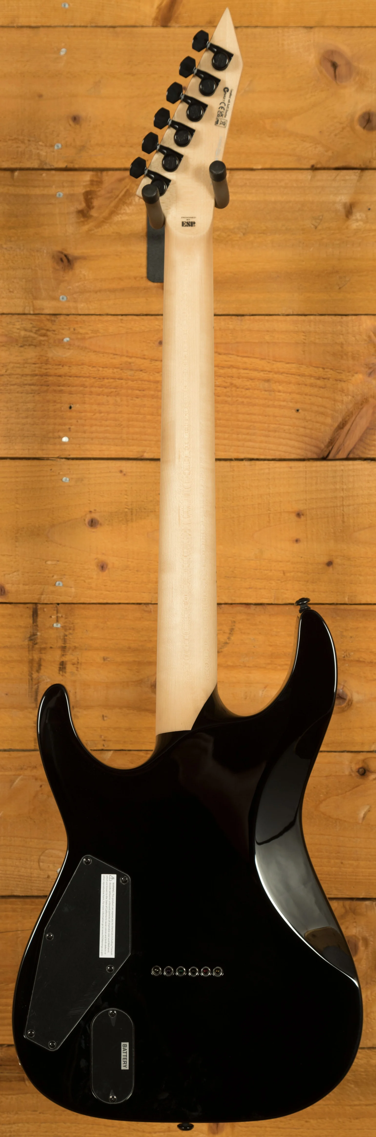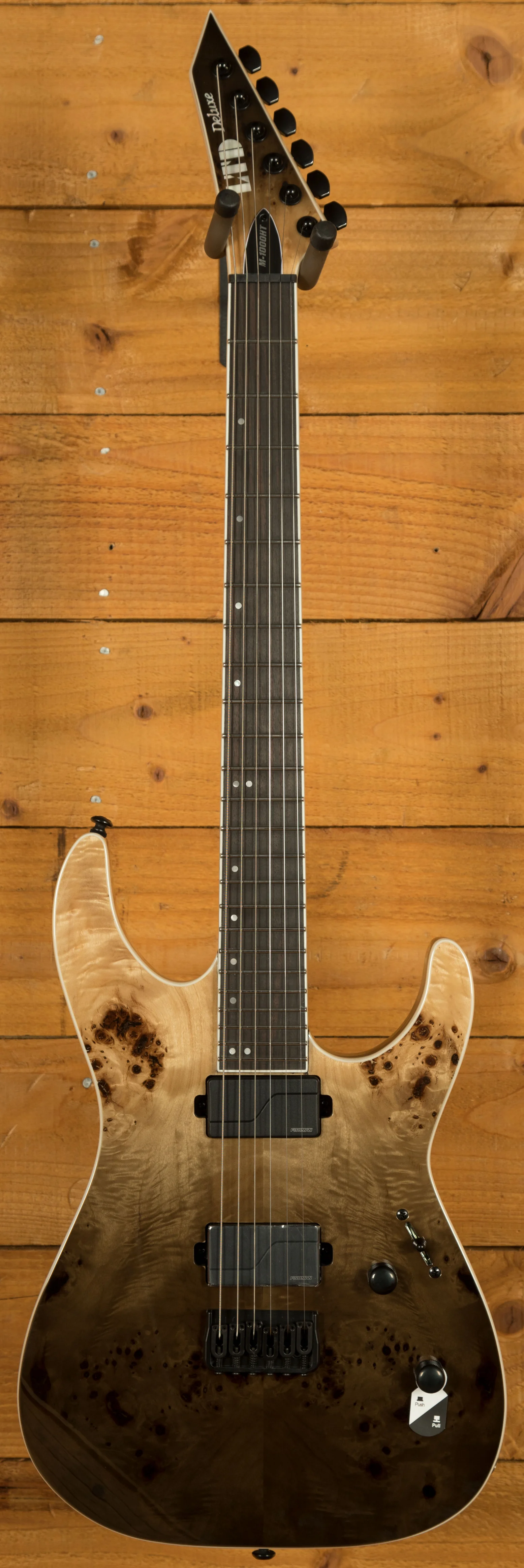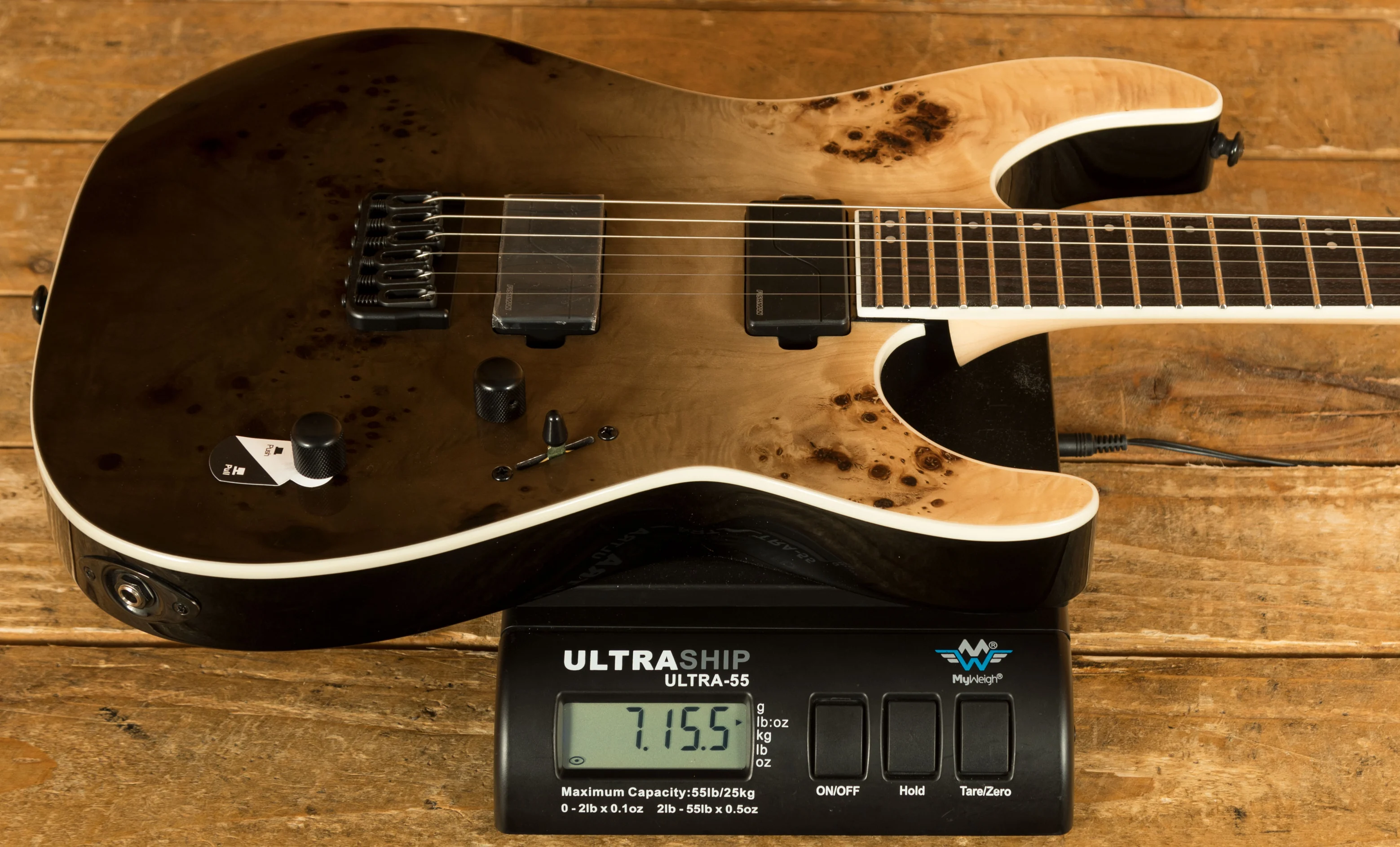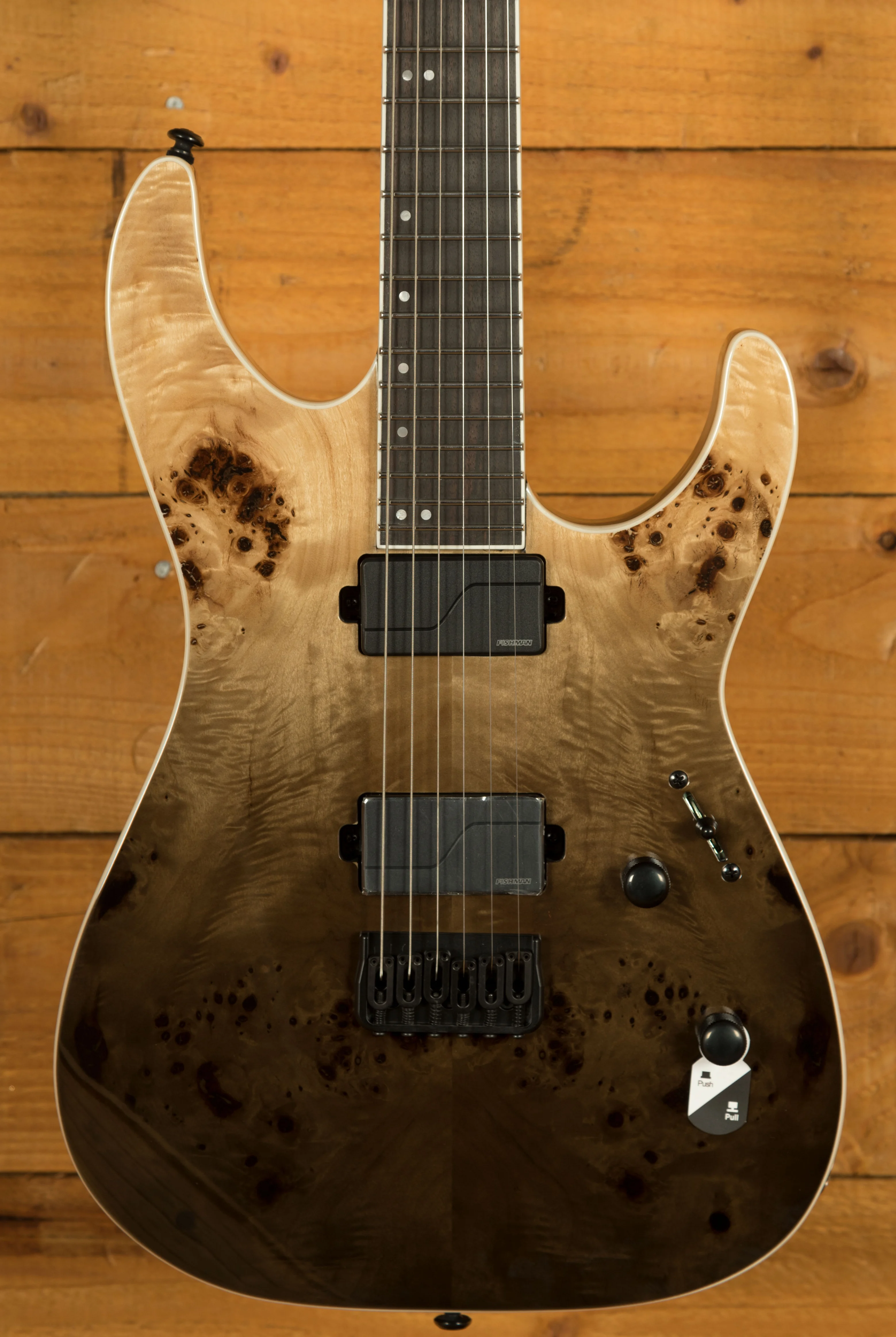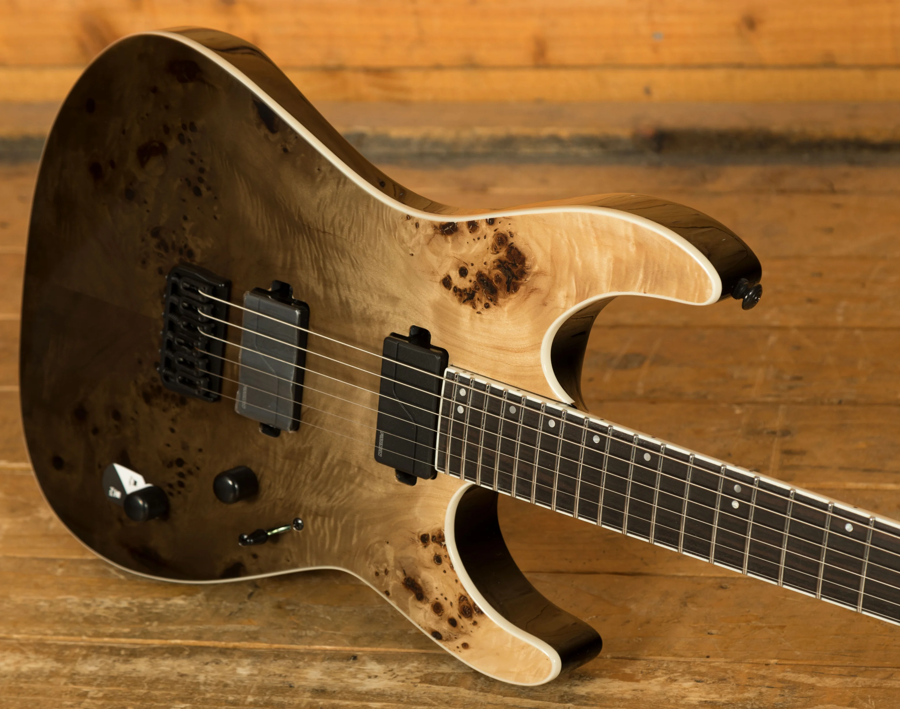 This guitar offers neck-thru-body construction with an Alder body and a burled poplar top finished in the stunning black fade. An extra thin "U" maple neck boasts an Ebony fingerboard with a 300-400mm compound radius and 24 XJ stainless steel frets, this guitar is super quick and fun to navigate.
