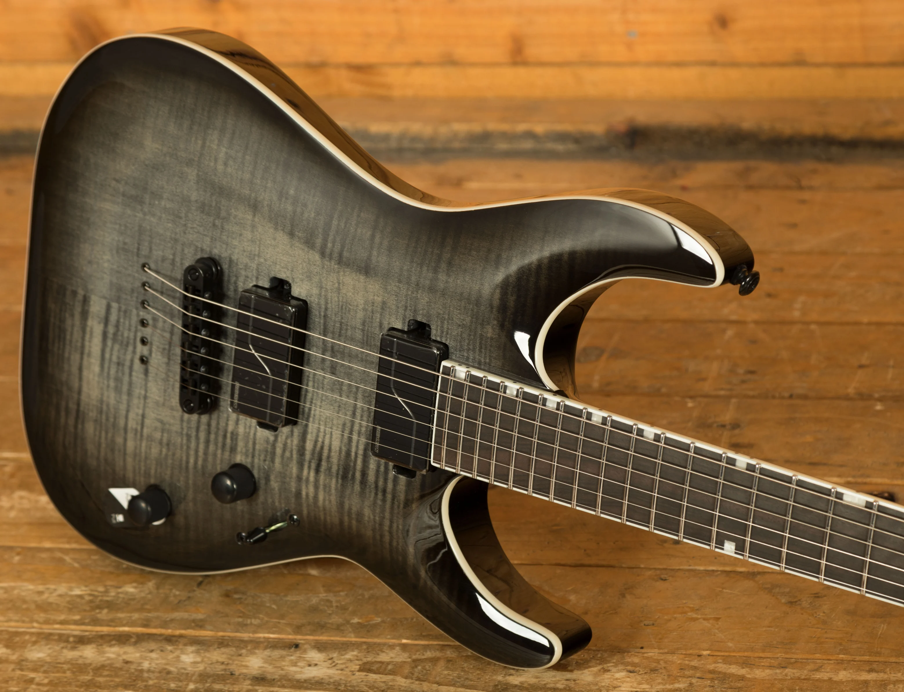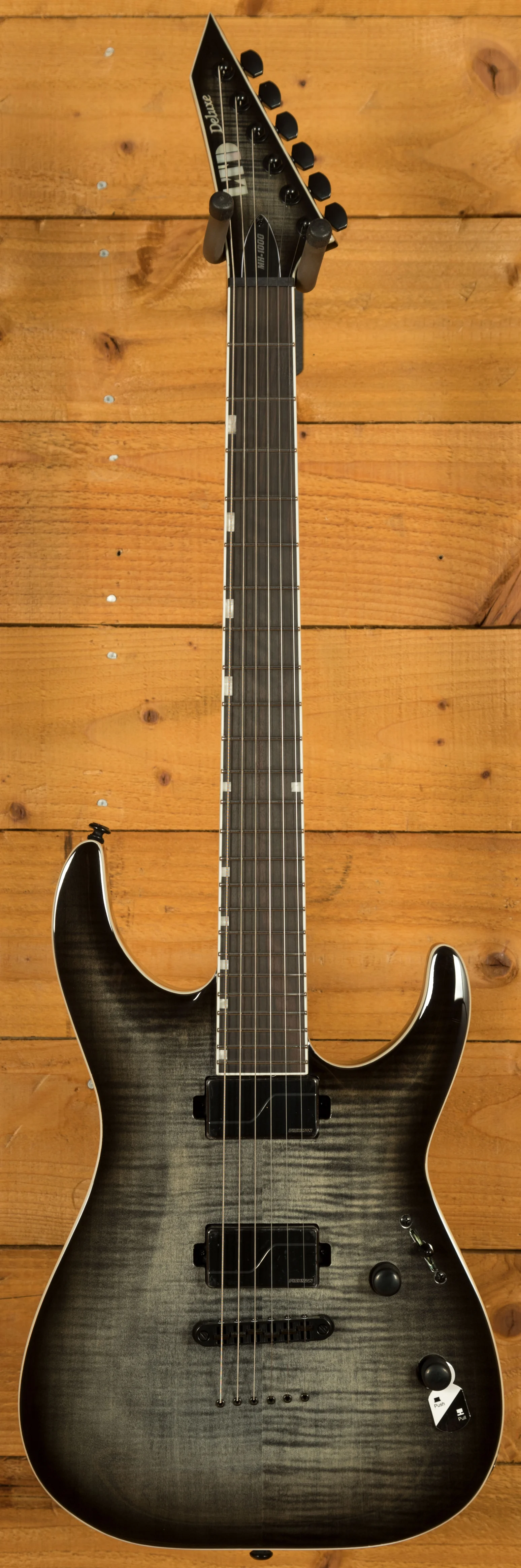 The MH-1000NT in Charcoal Burst is a high-performance guitar that blends ESP's Horizon and Mirage design elements into a sleek, versatile instrument. The arched mahogany body with flamed maple top is finished in translucent Charcoal Burst, showcasing the figured wood beneath. White binding on the body, neck, and reversed headstock adds sharp contrast and visual clarity.